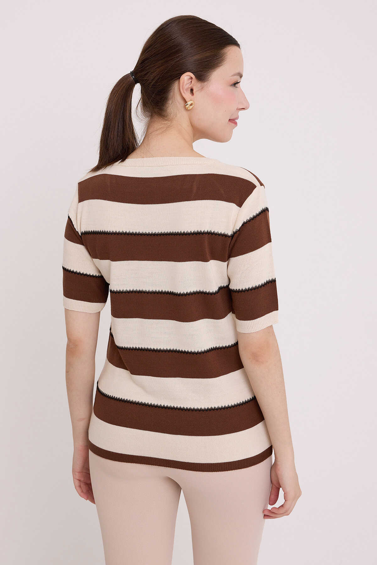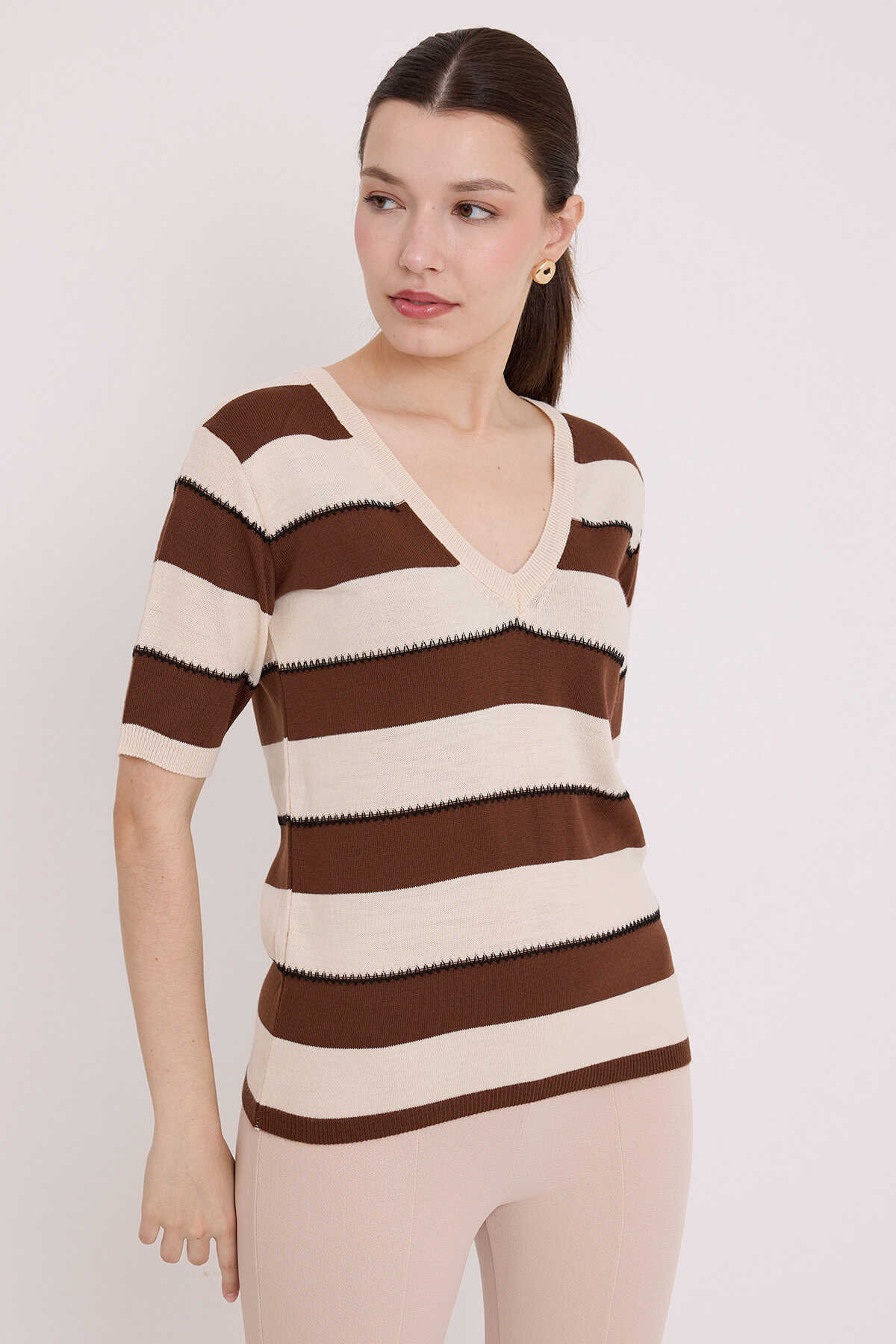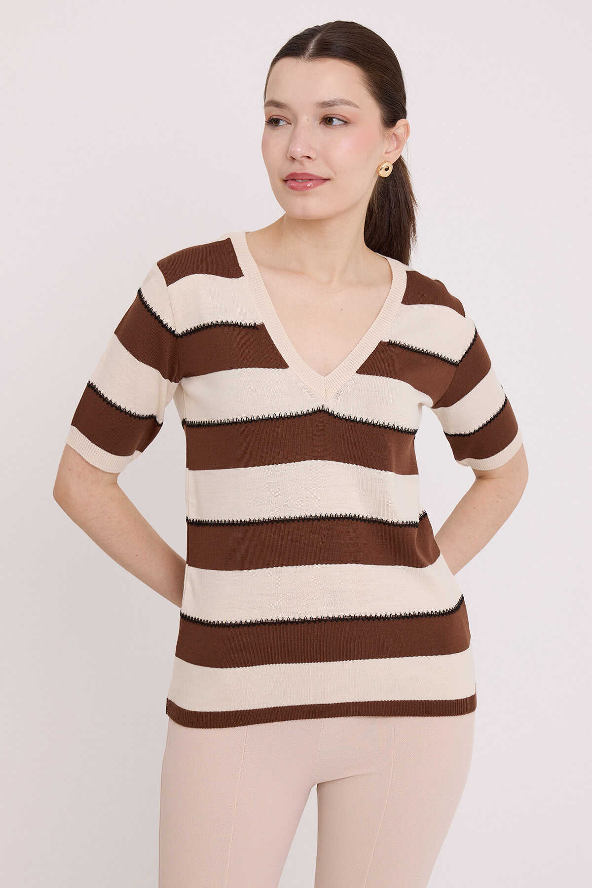 Kadın Kahve Krem Çizgili Kısa Kol Bluz 15869 - Kombin