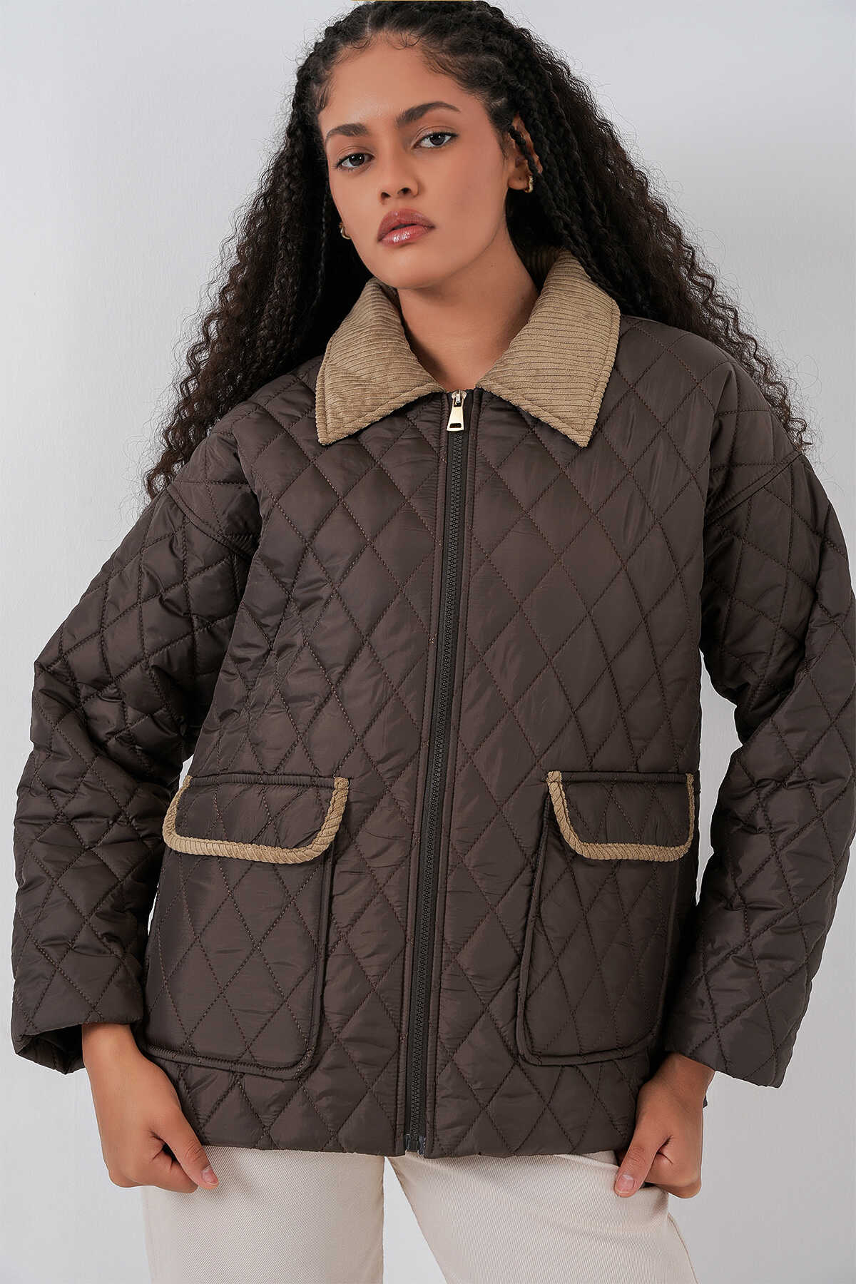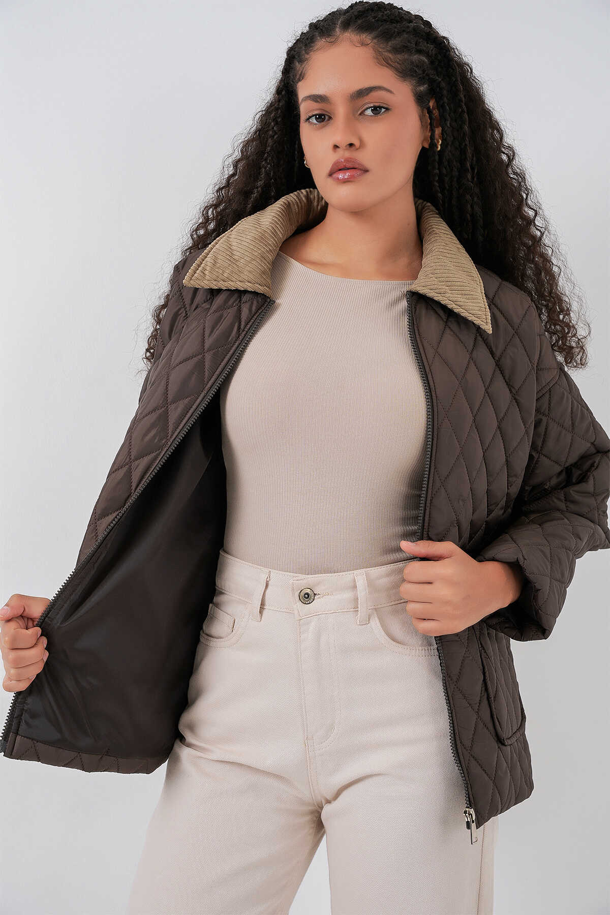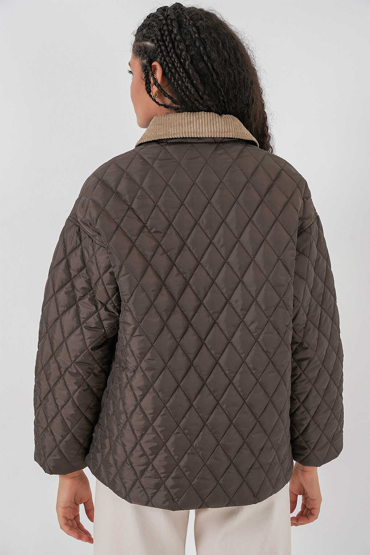 Kadın Kahverengi Bej Kapitone Oversize Mont 5229 - Kombin
