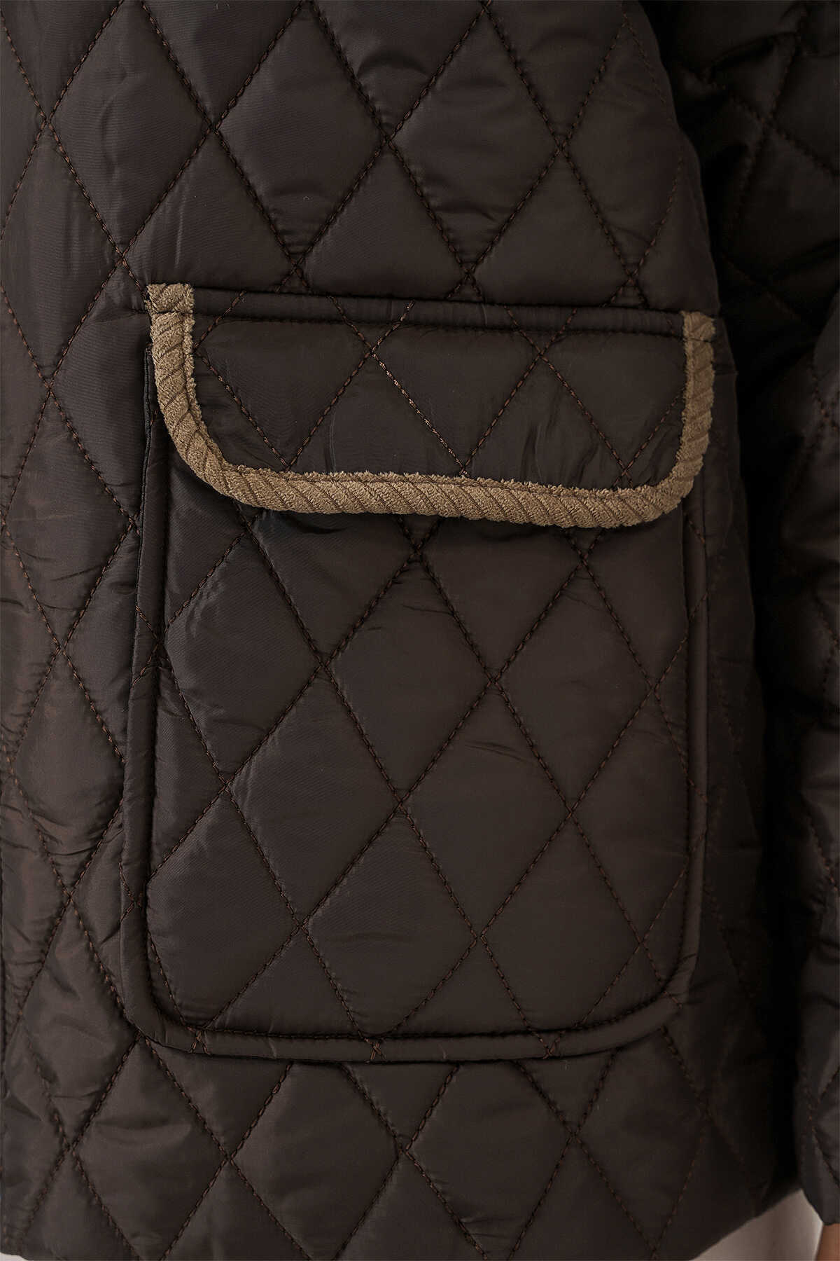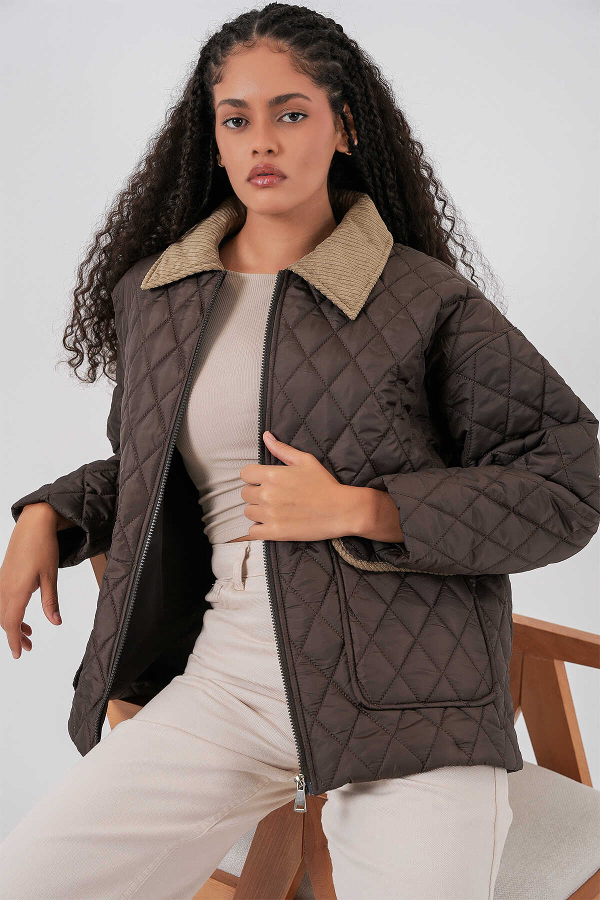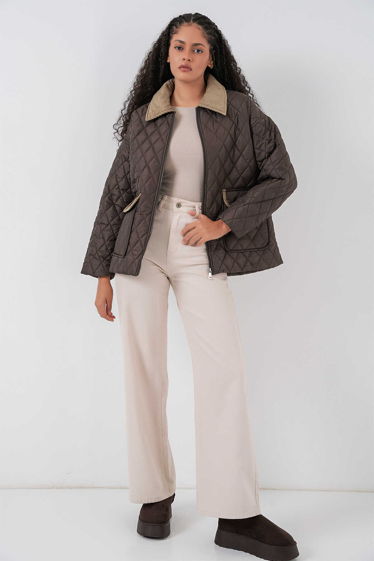 Kadın Kahverengi Bej Kapitone Oversize Mont 5229 - Kombin
