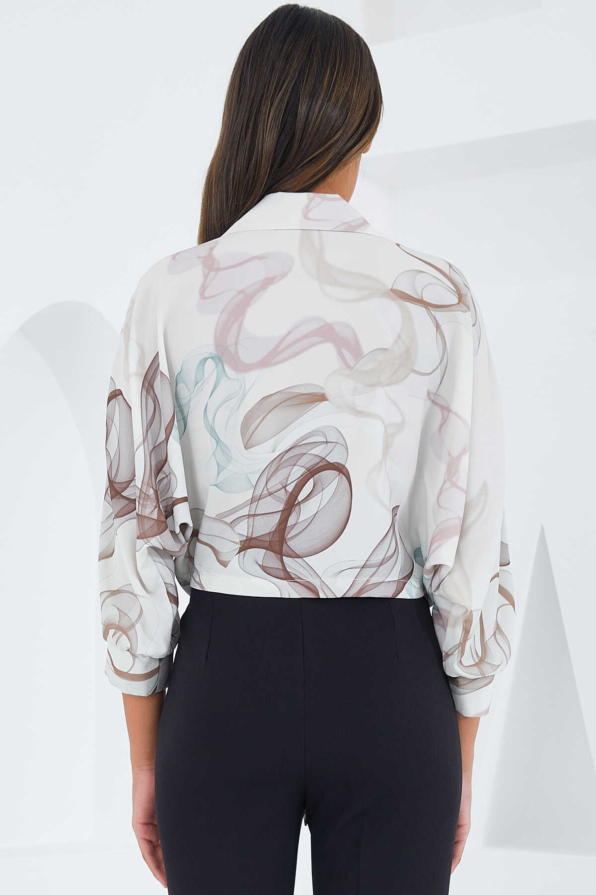 Kadın Oversize Dökümlü Crop Saten Gömlek 906 - Kahverengi