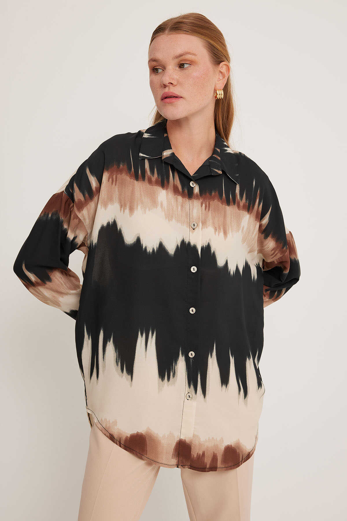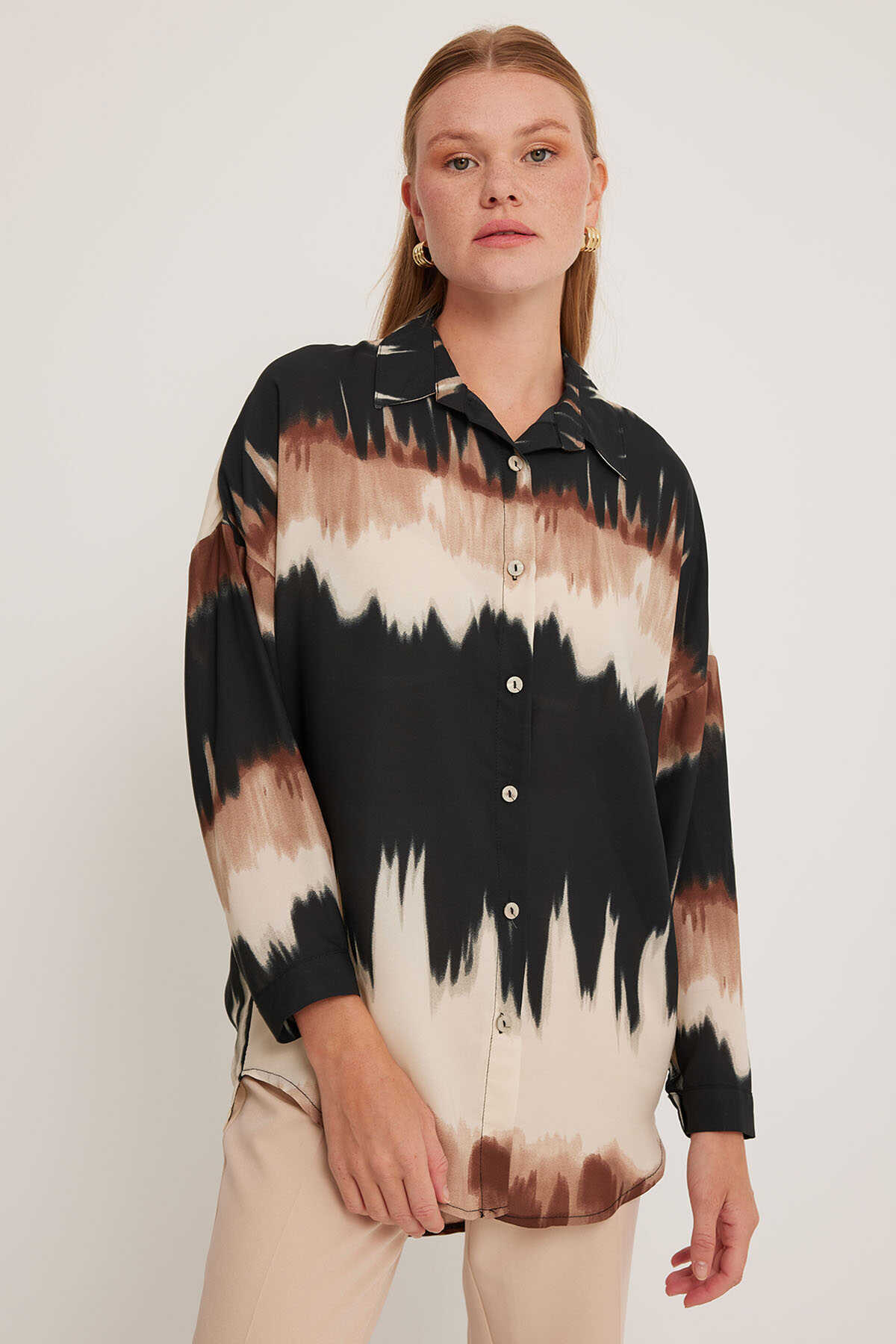 Kadın Kahverengi Siyah Desenli Oversize Gömlek 5923