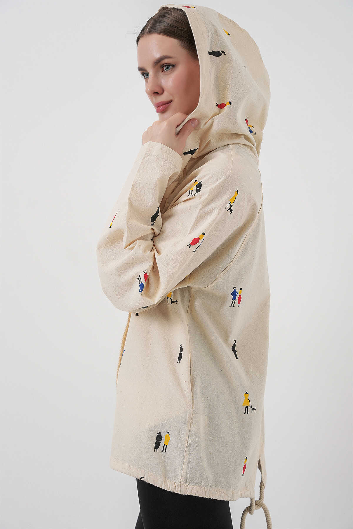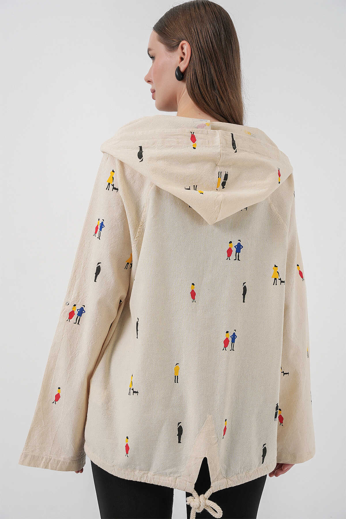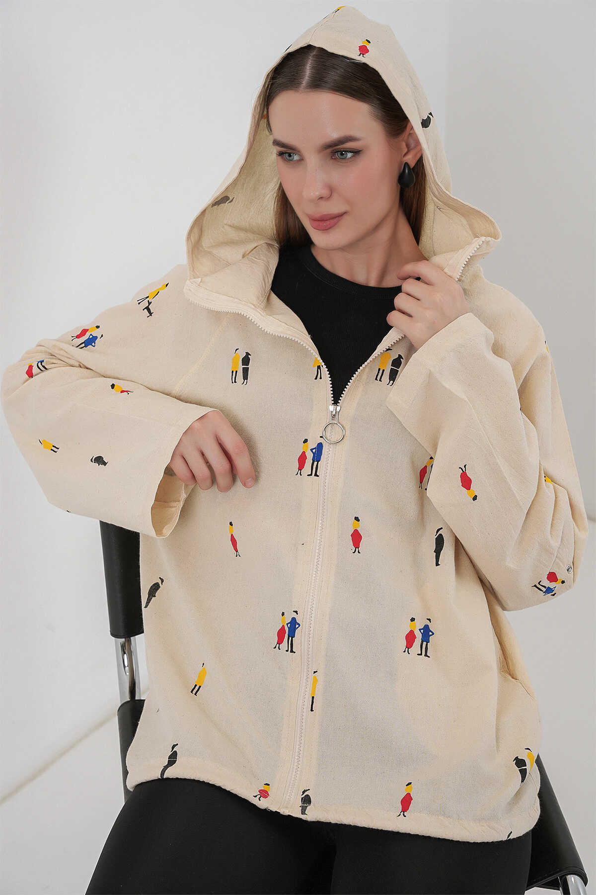 Kadin Kapüsonlu Desenli Keten Ceket 0736