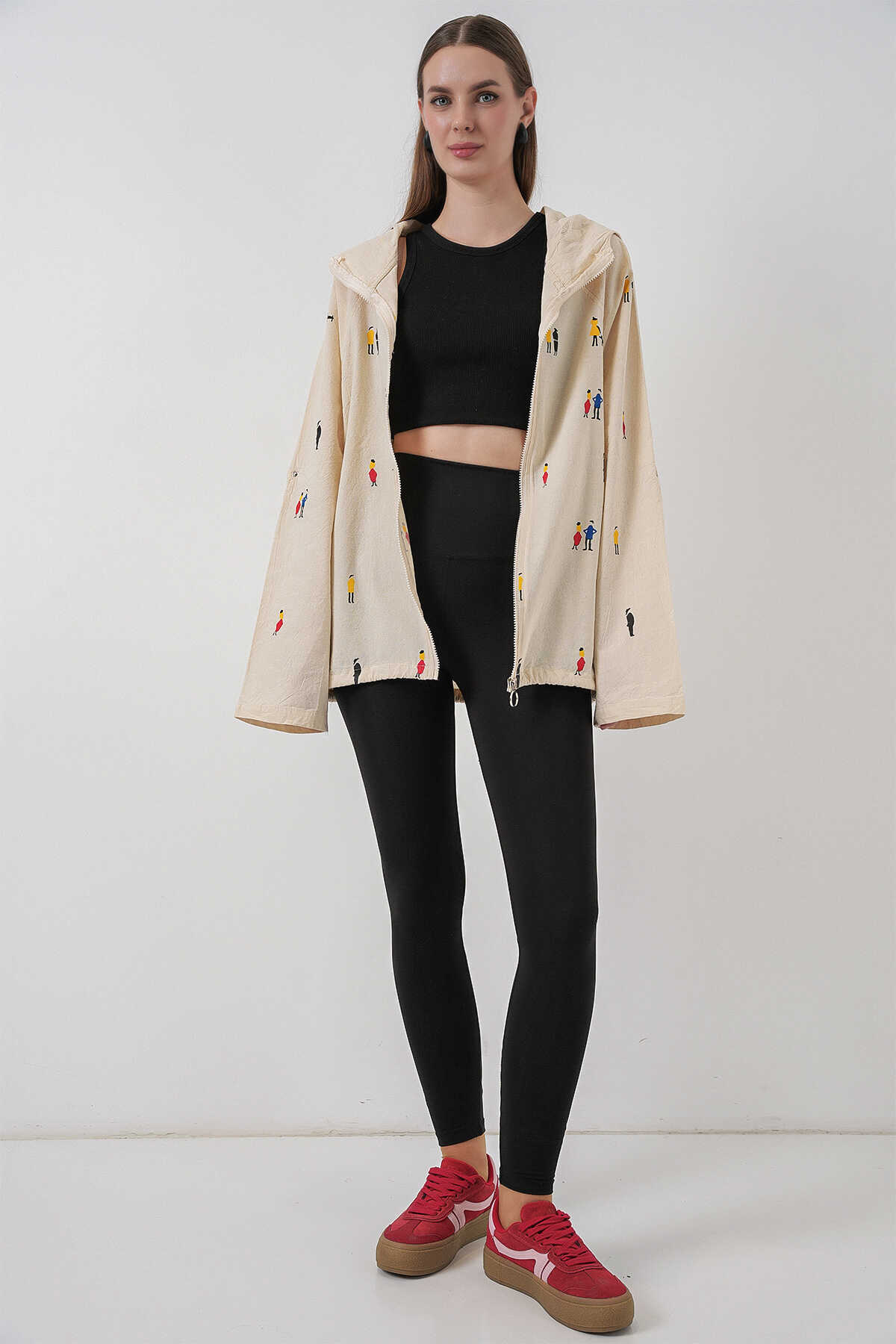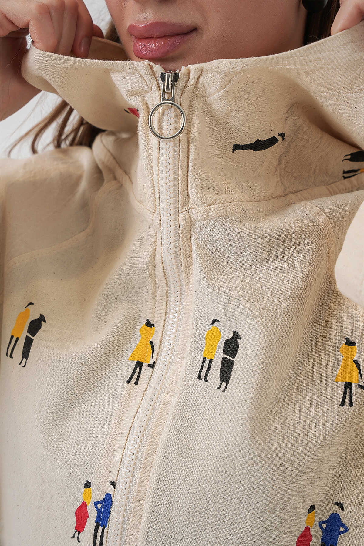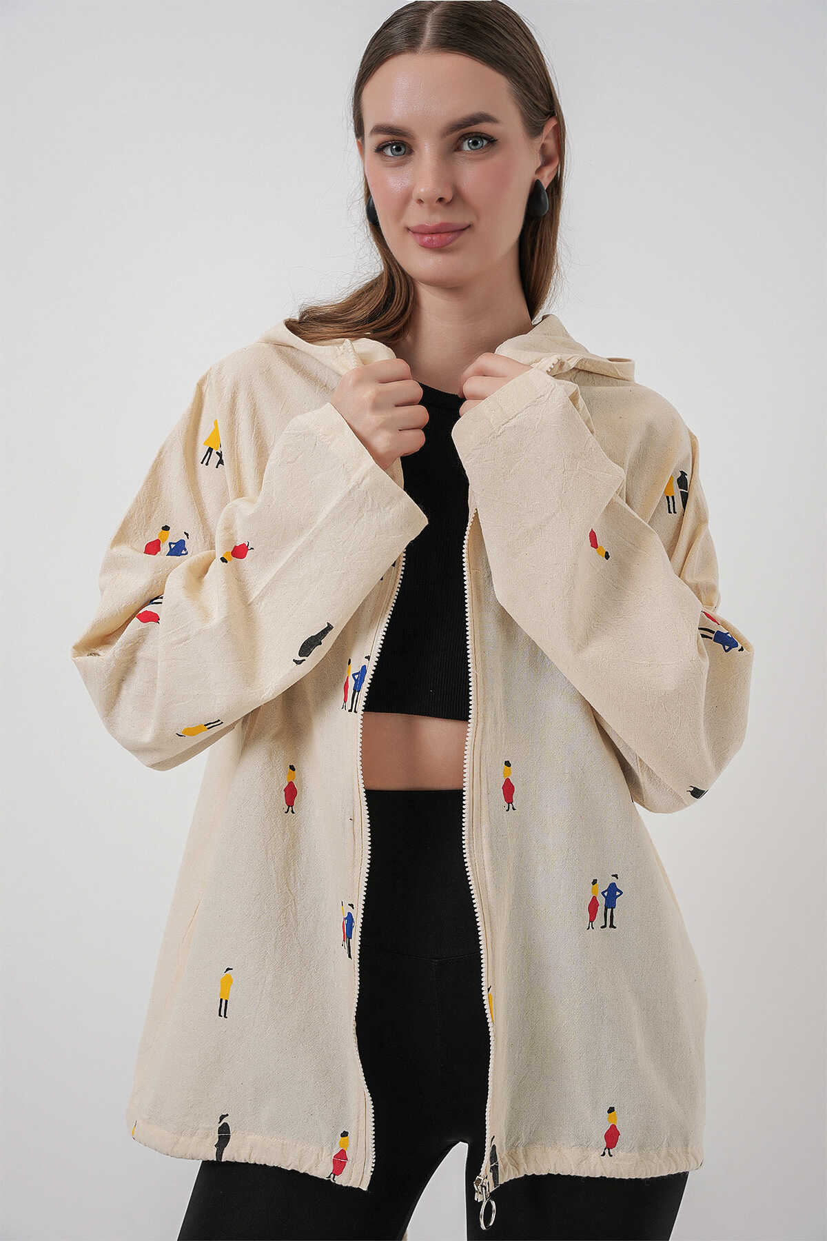 Kadin Kapüsonlu Desenli Keten Ceket 0736