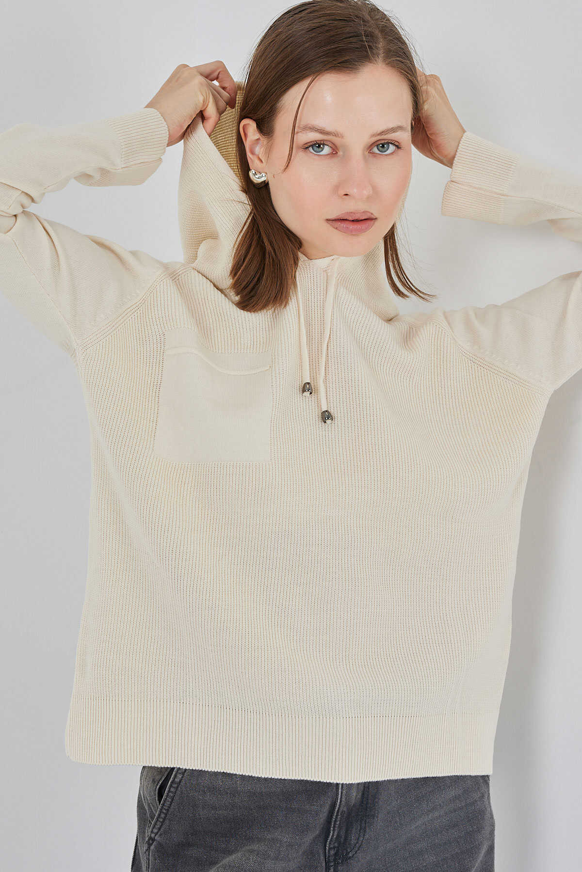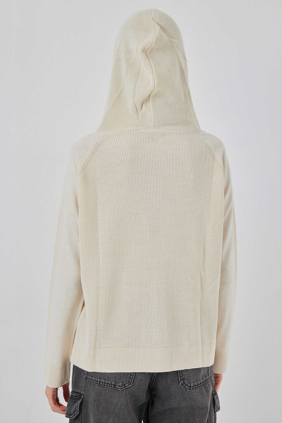 Kadın Kapüşonlu Triko Kazak 15941 - Ekru - Kombin