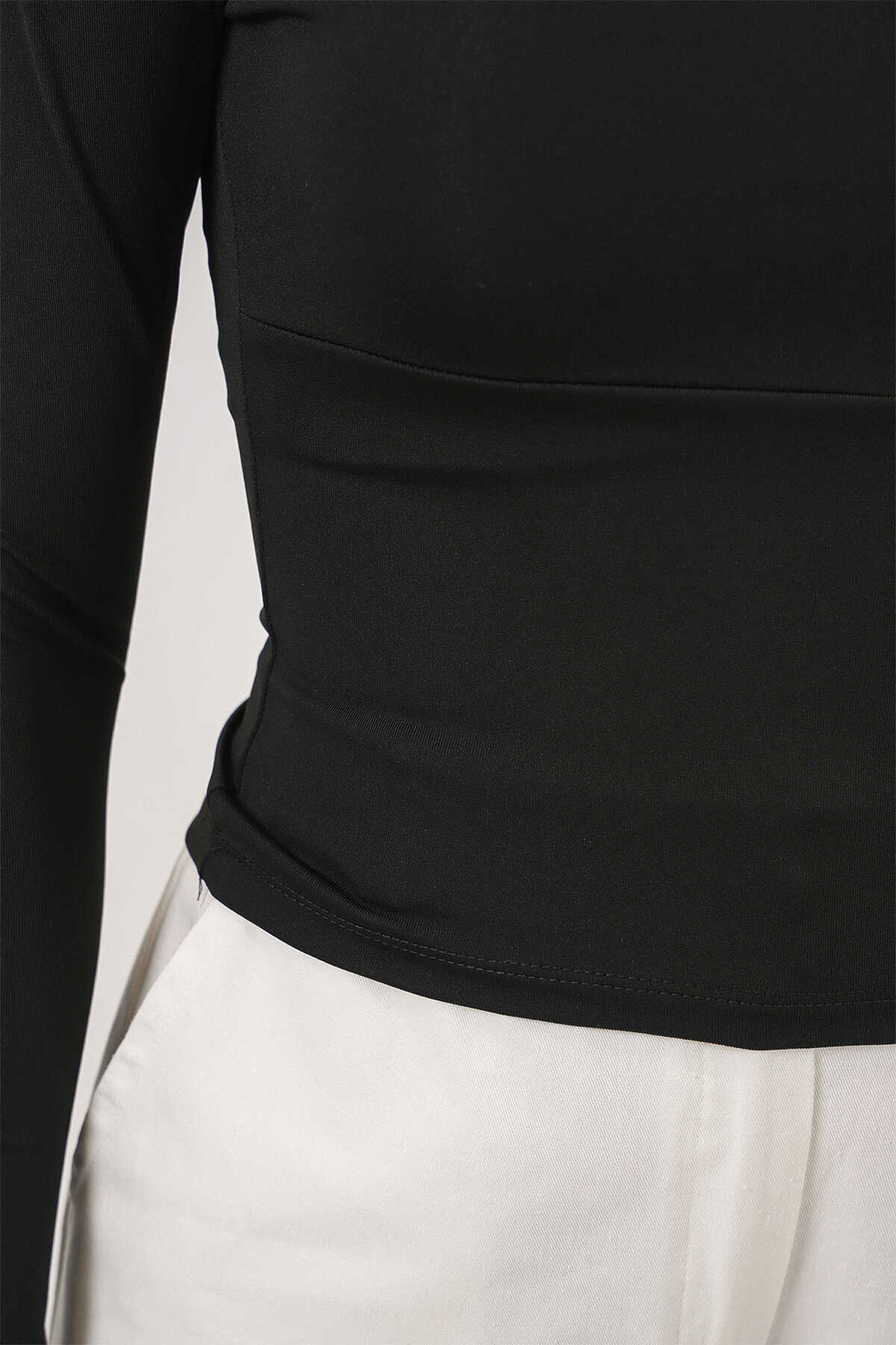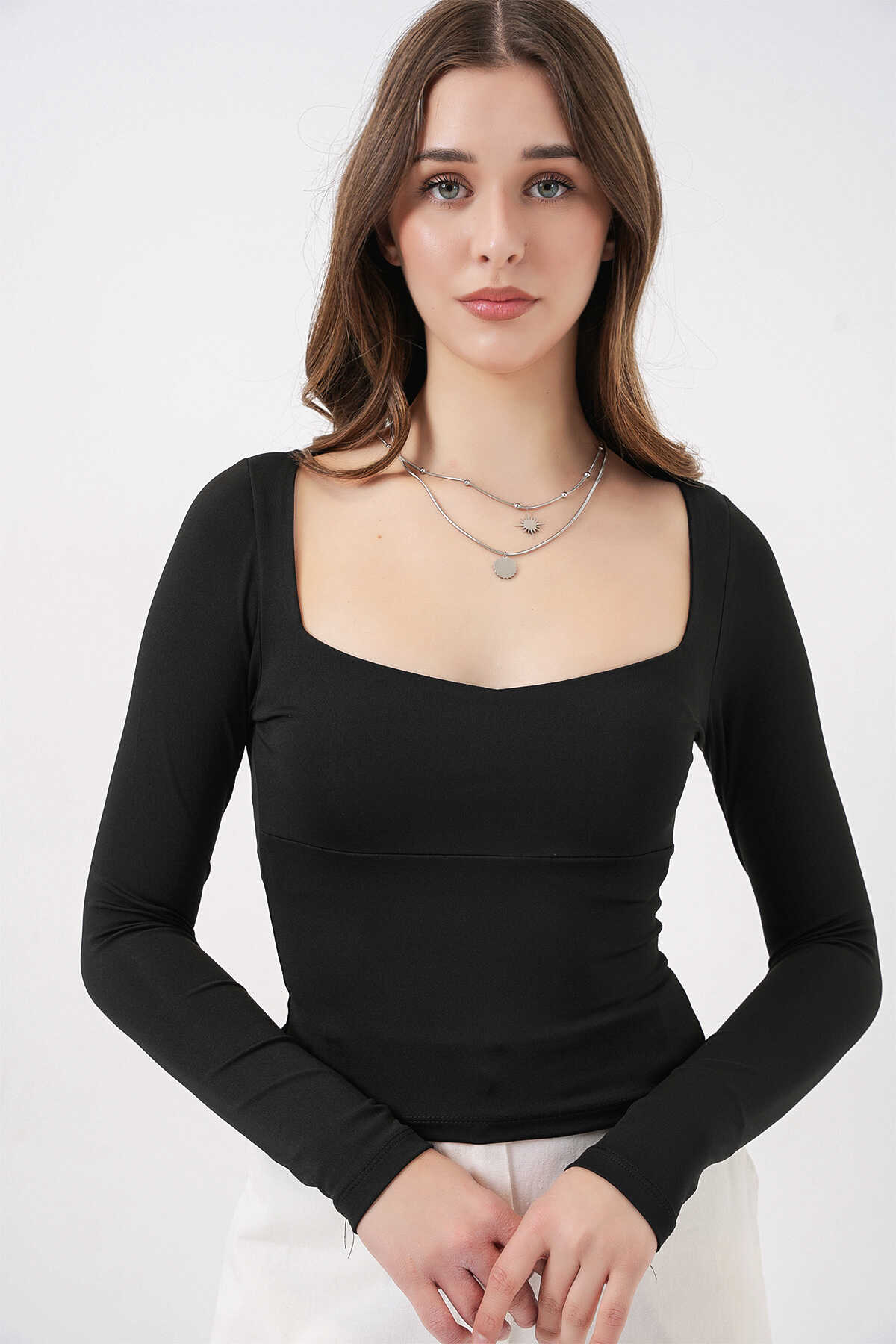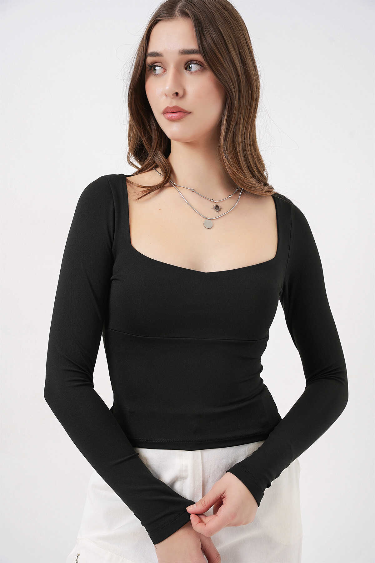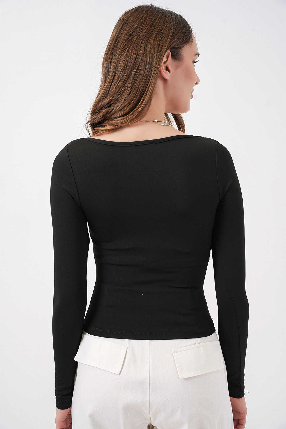Kadın Kare Yaka Slim Fit Bluz 986 - Siyah - Kombin