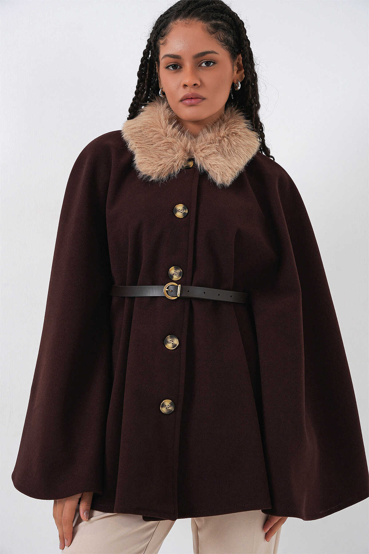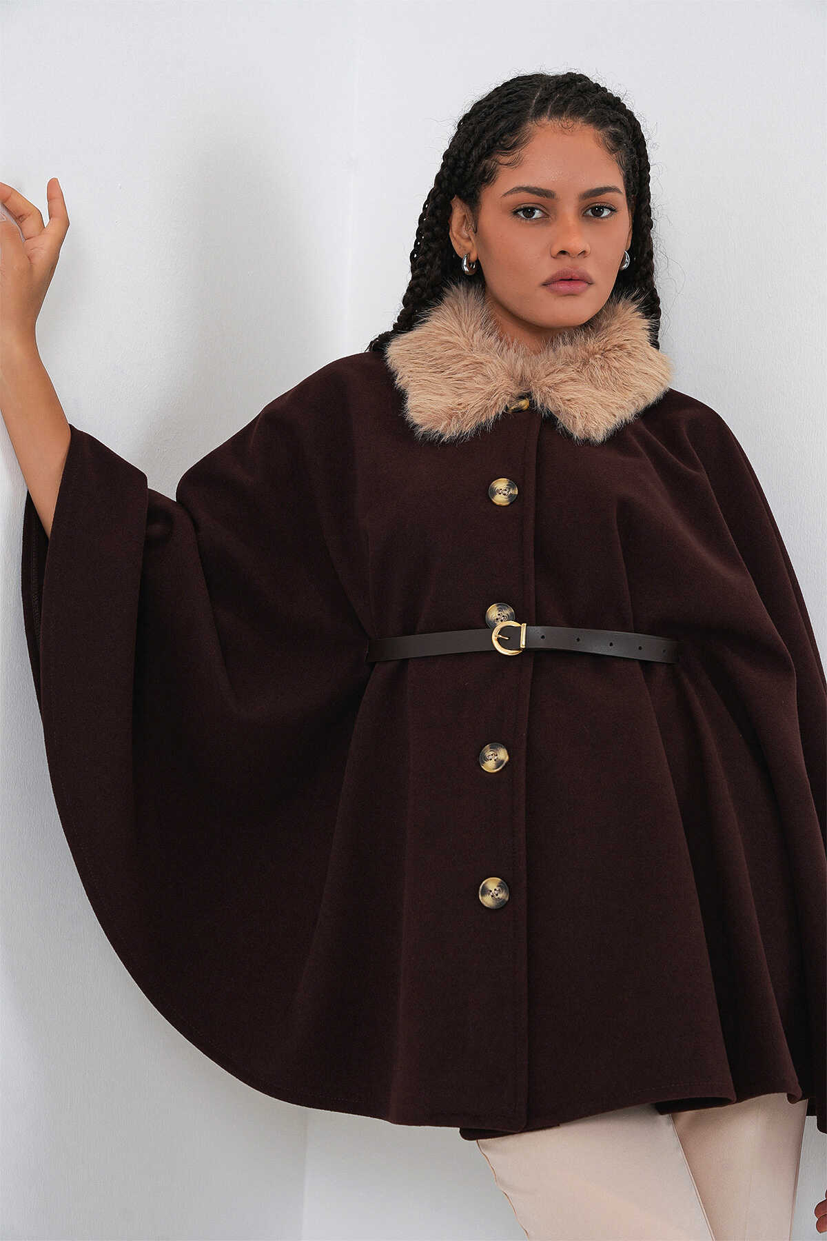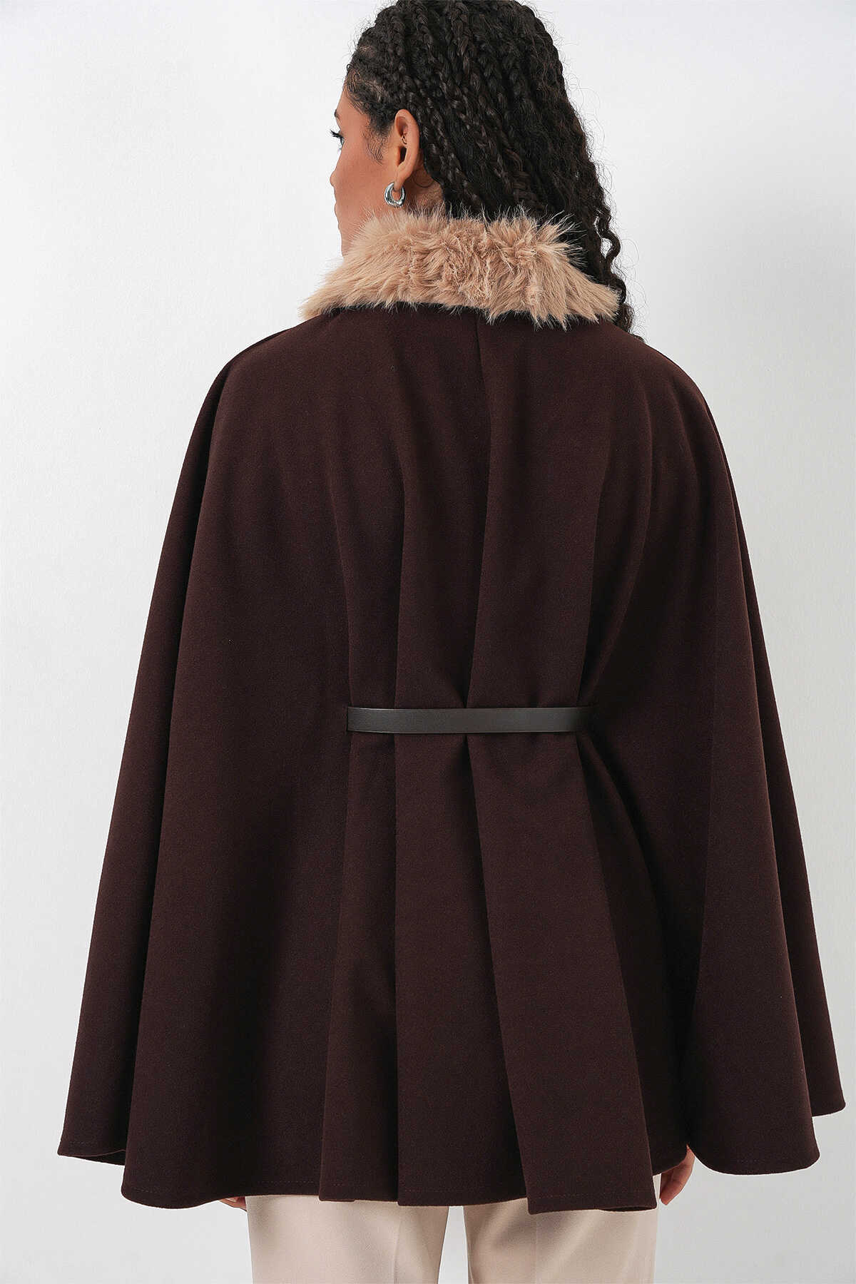 Kadın Kemerli Kaşe Panço 9165 - Kahverengi - Kombin