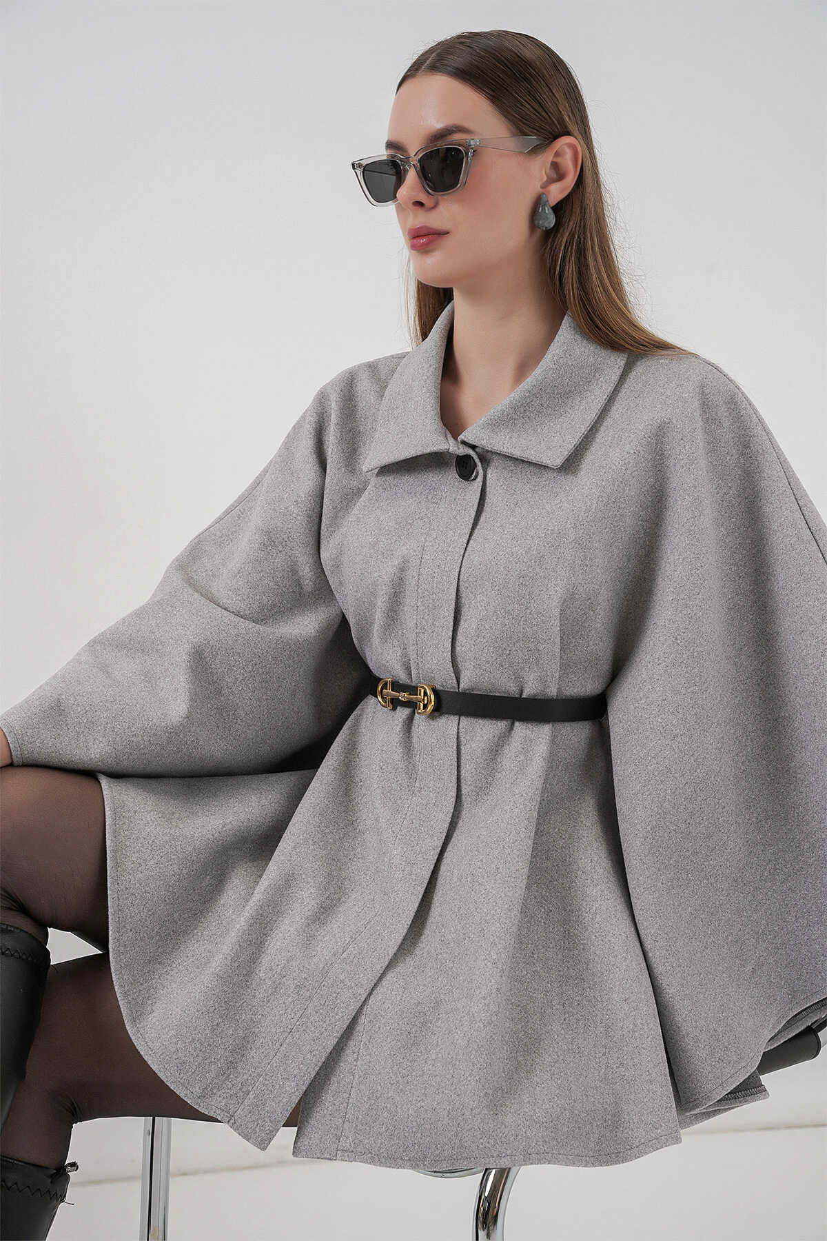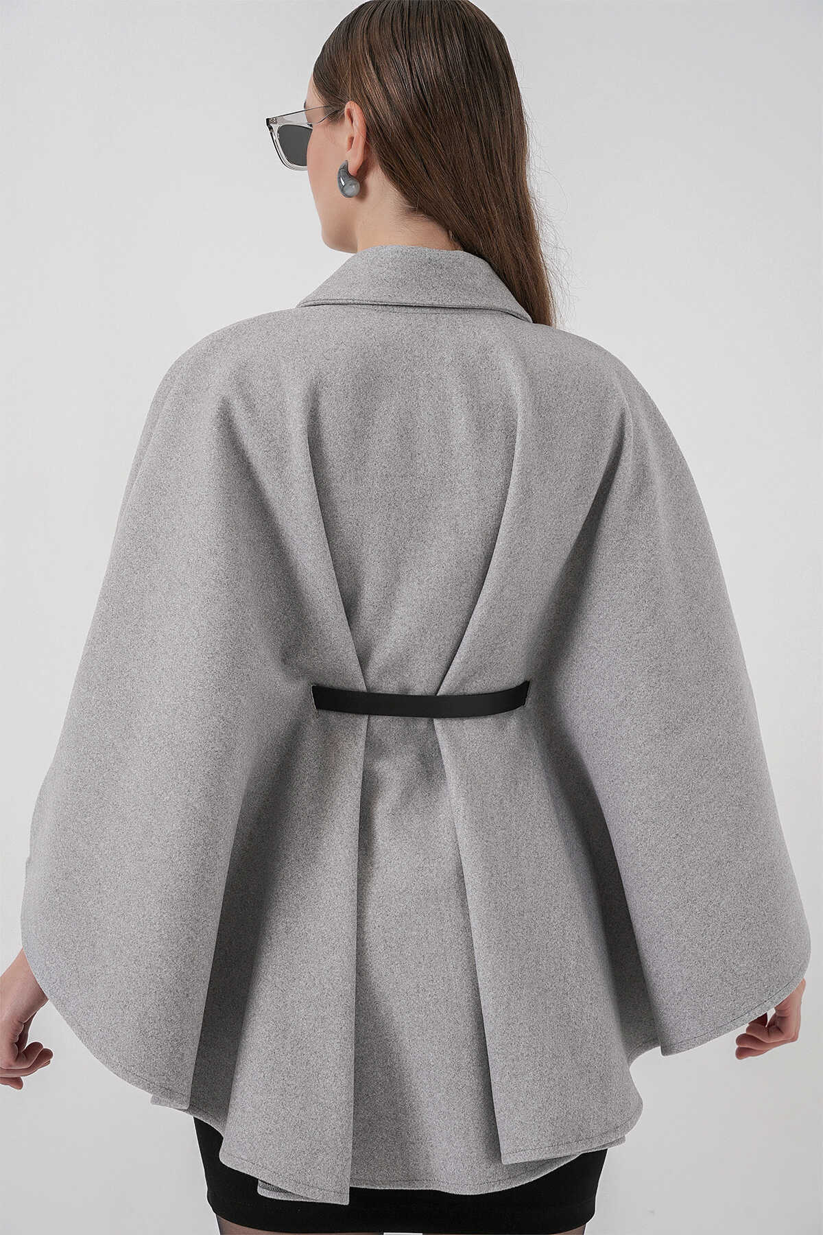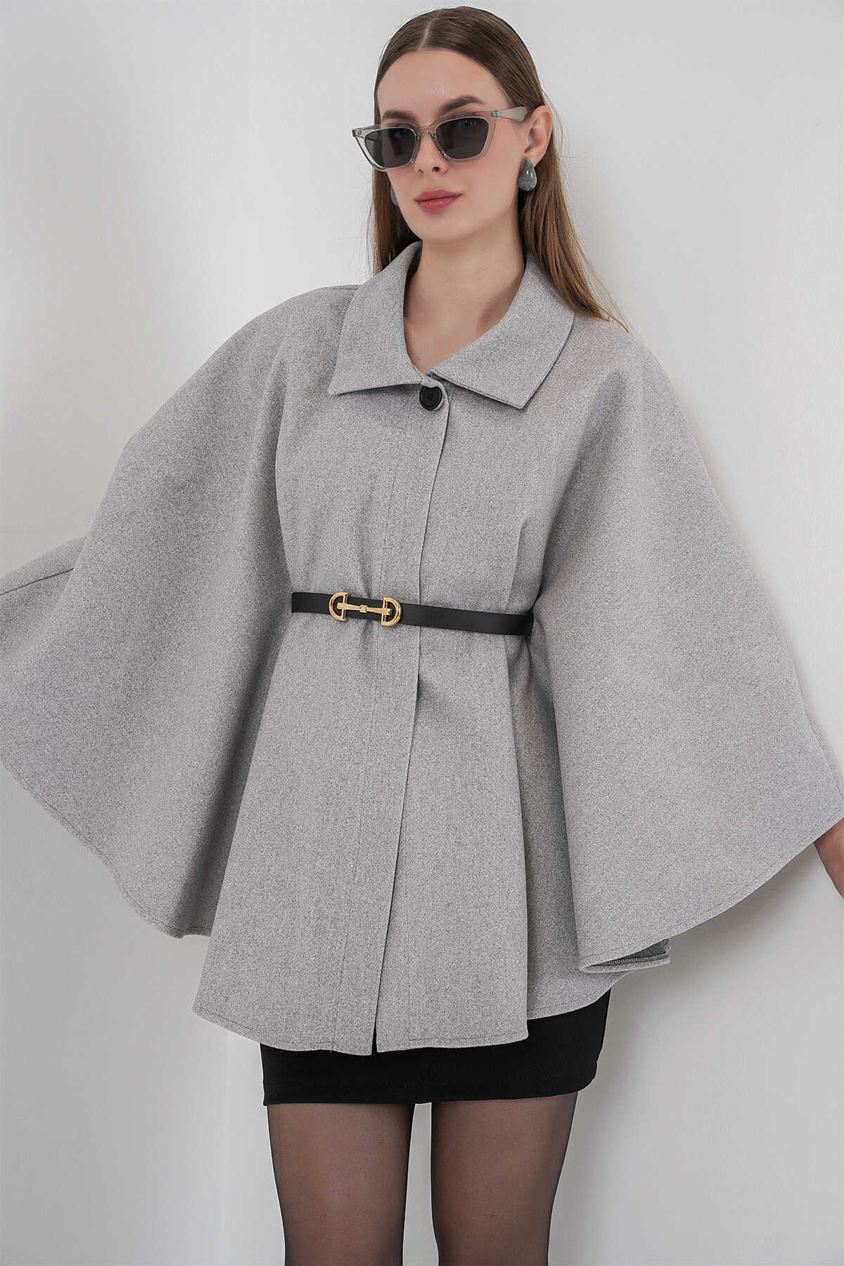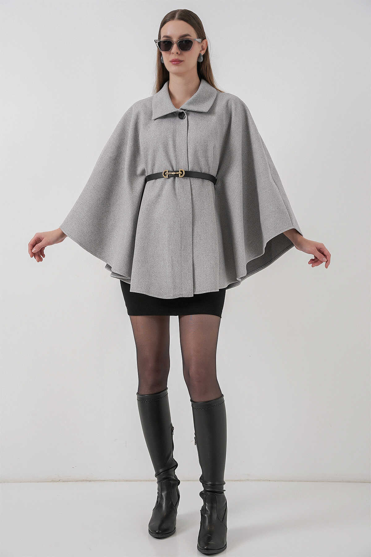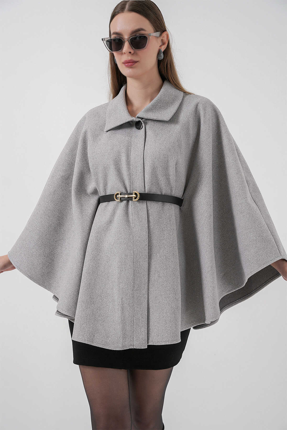Kadın Kemerli Kaşe Panço 9170 - Gri - Kombin