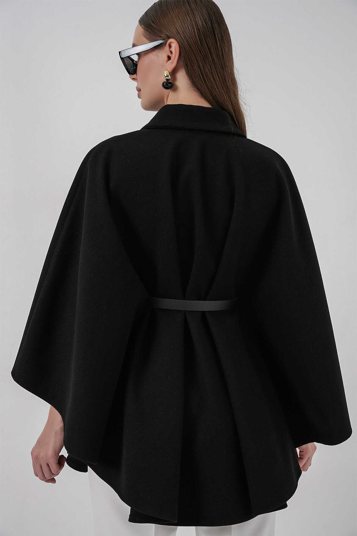 Kadın Kemerli Kaşe Panço 9170 - Siyah - Kombin