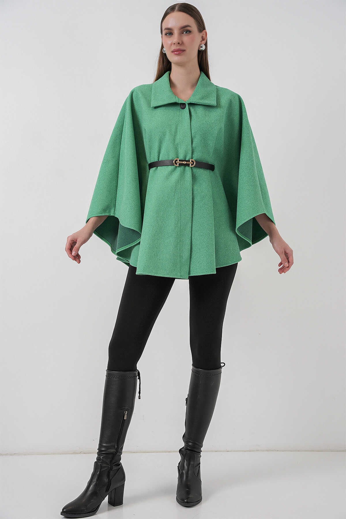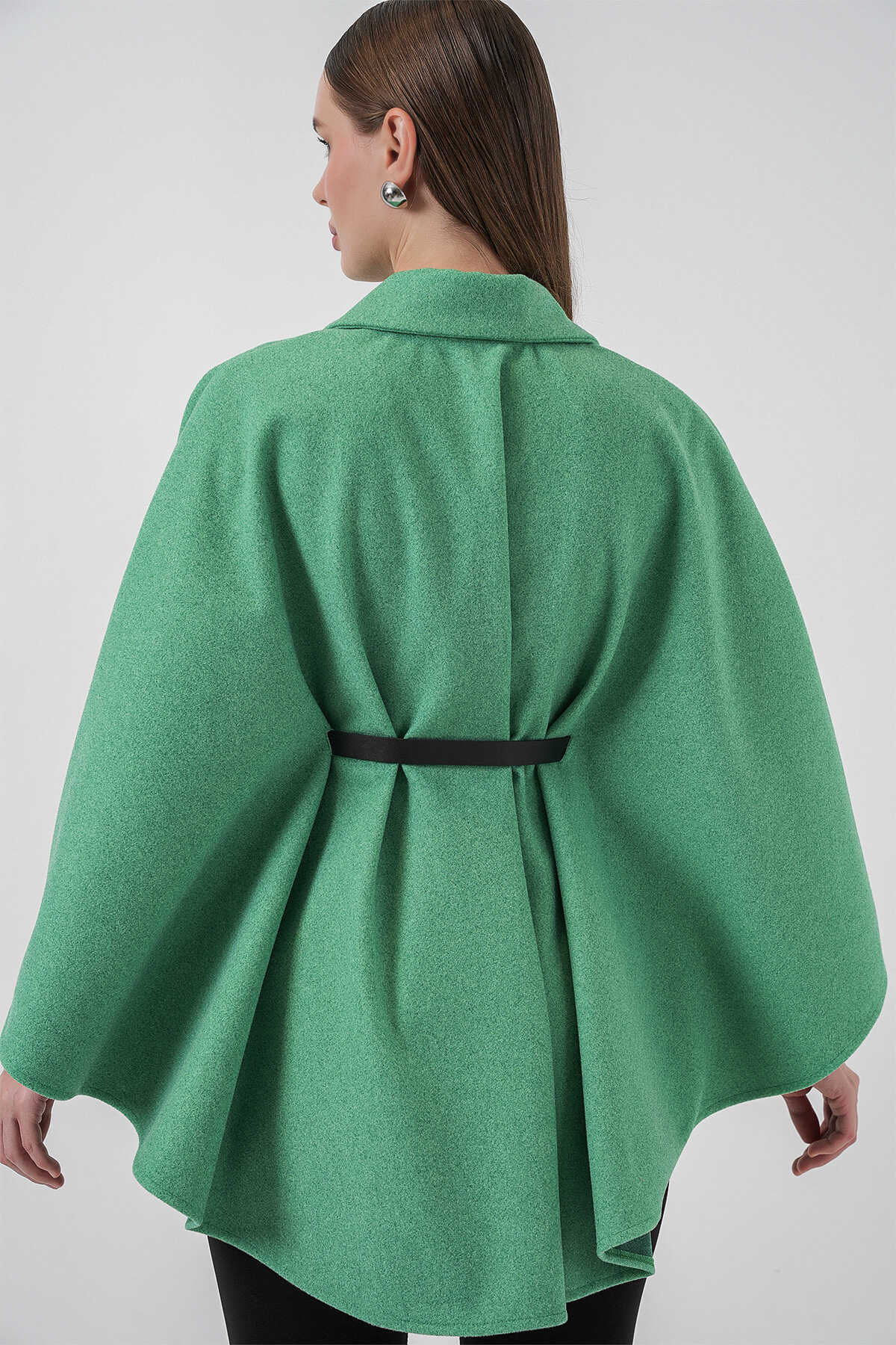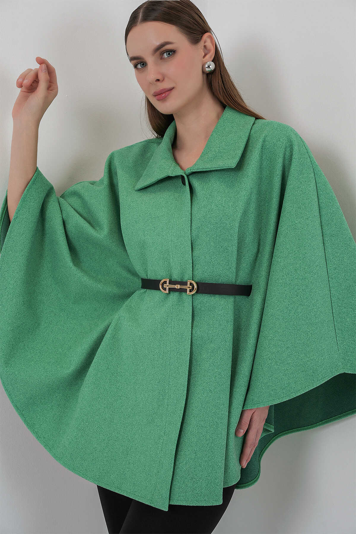 Kadın Kemerli Kaşe Panço 9170 - Yeşil - Kombin