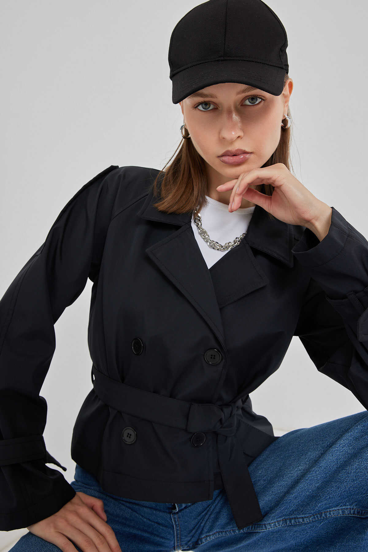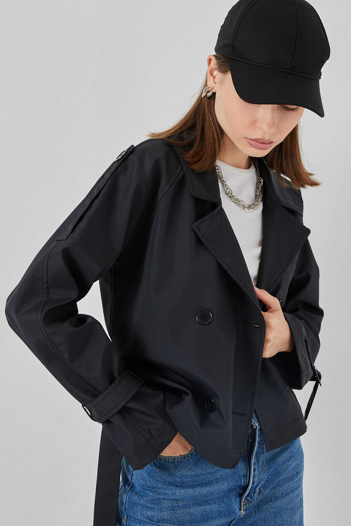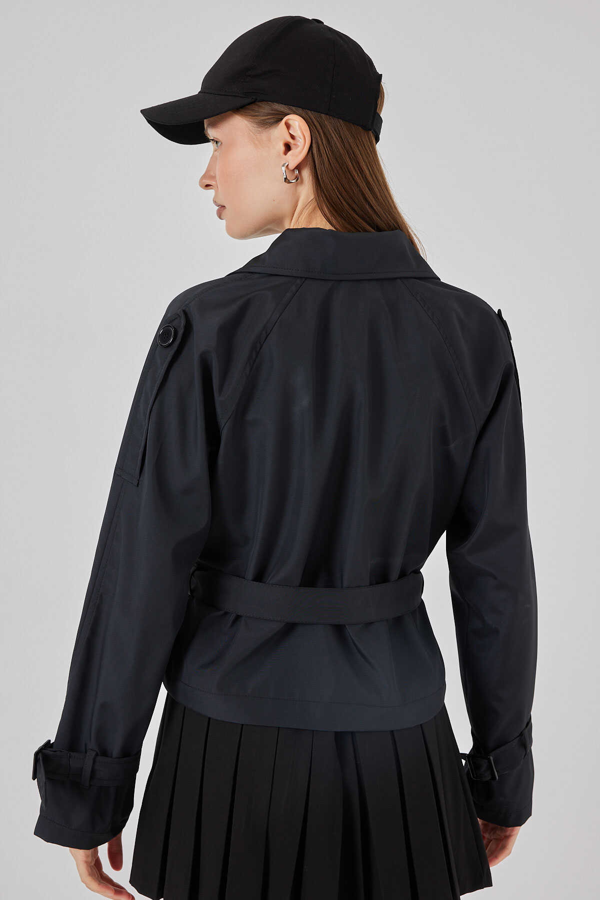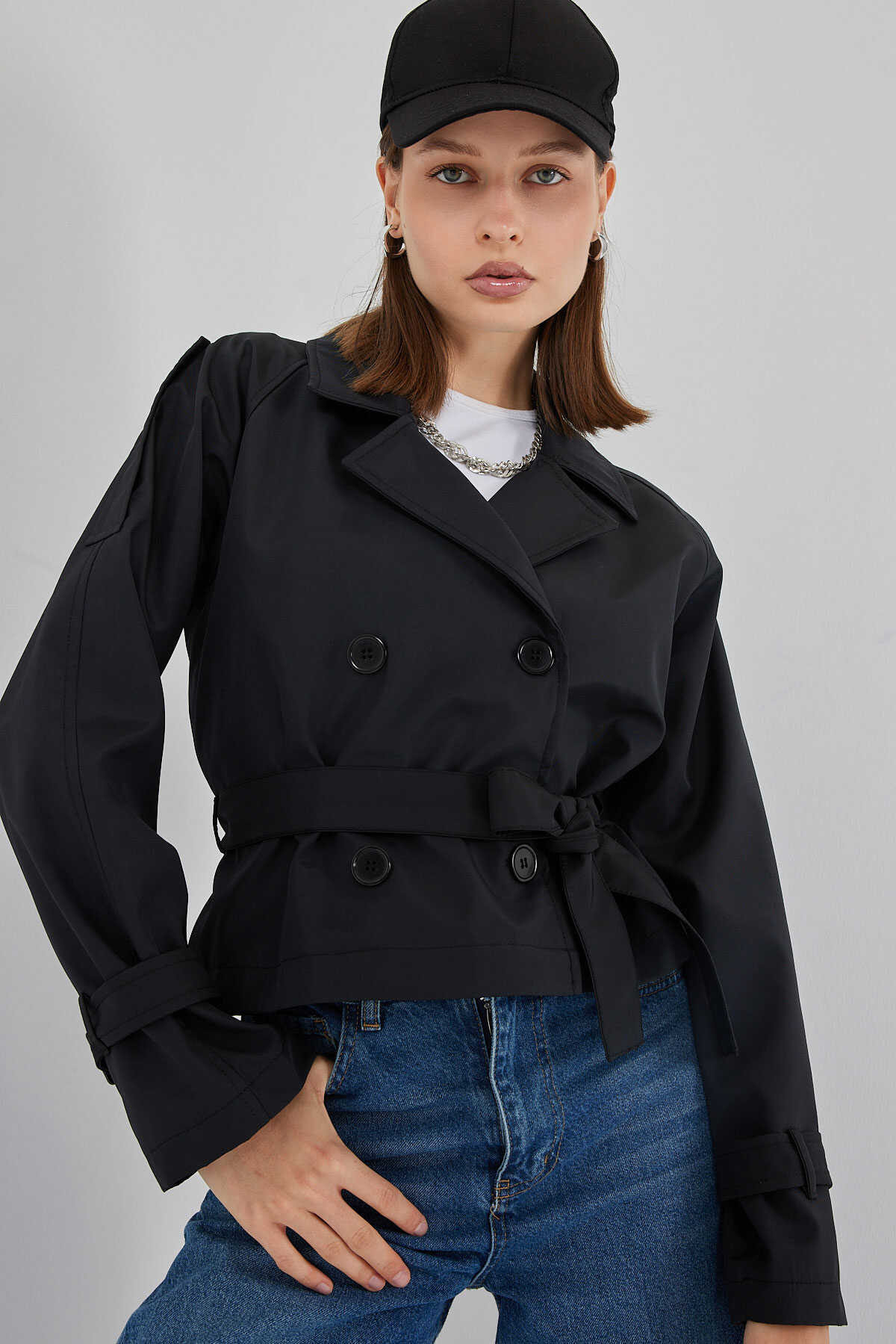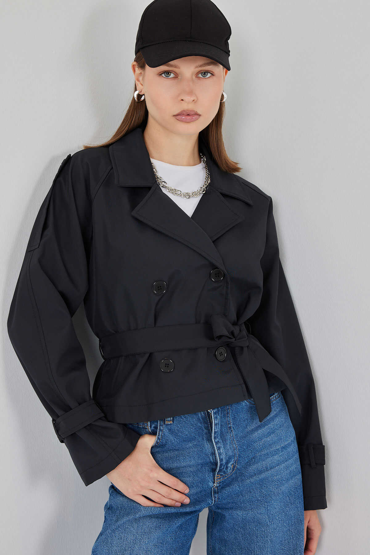 Kadın Kemerli Kısa Trençkot 5970 - Siyah - Kombin