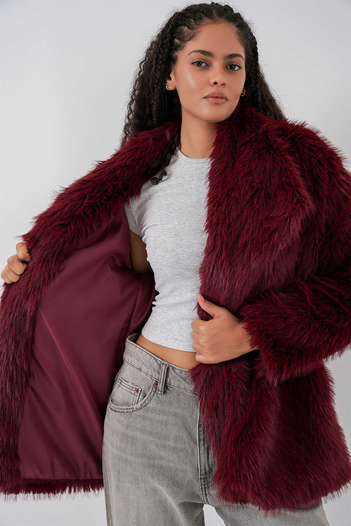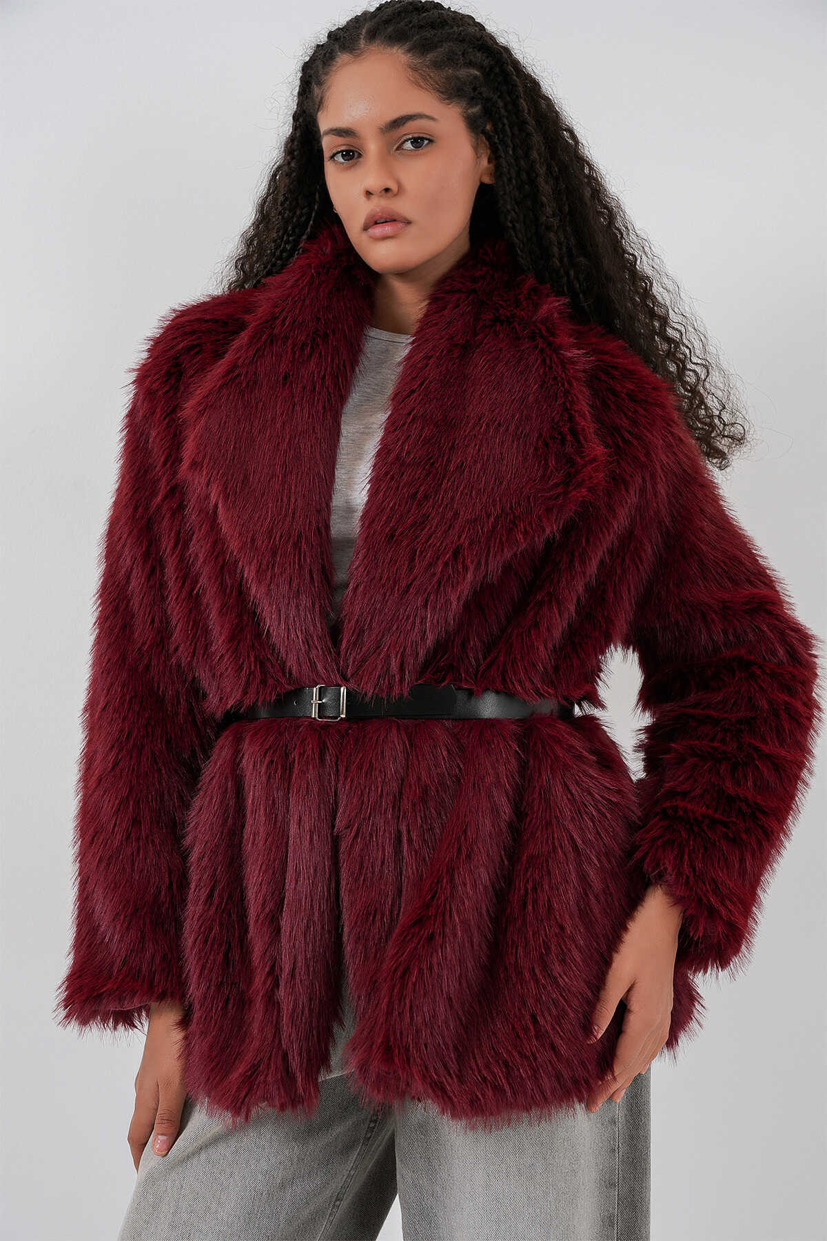 Kadın Kemerli Oversize Kürklü Kaban 9156 - Bordo - Kombin