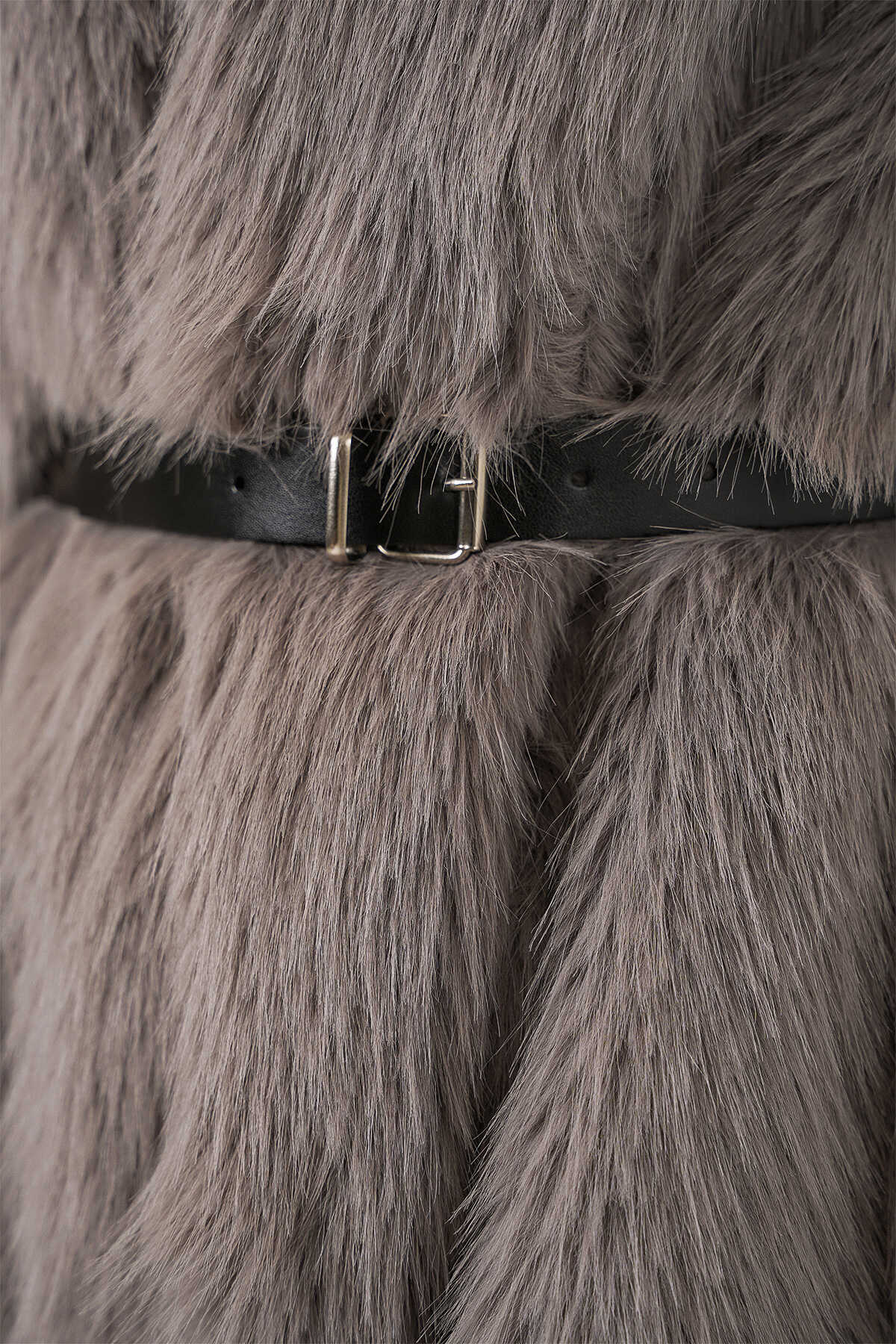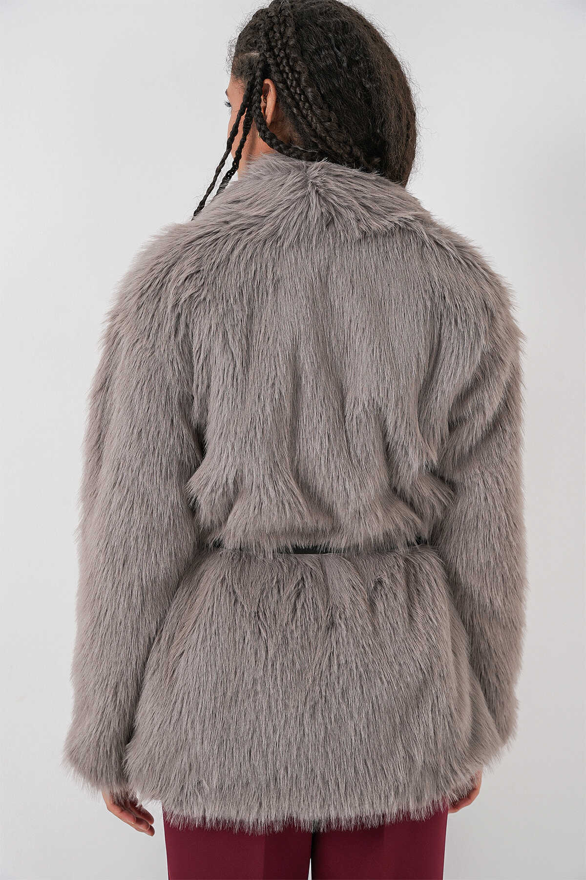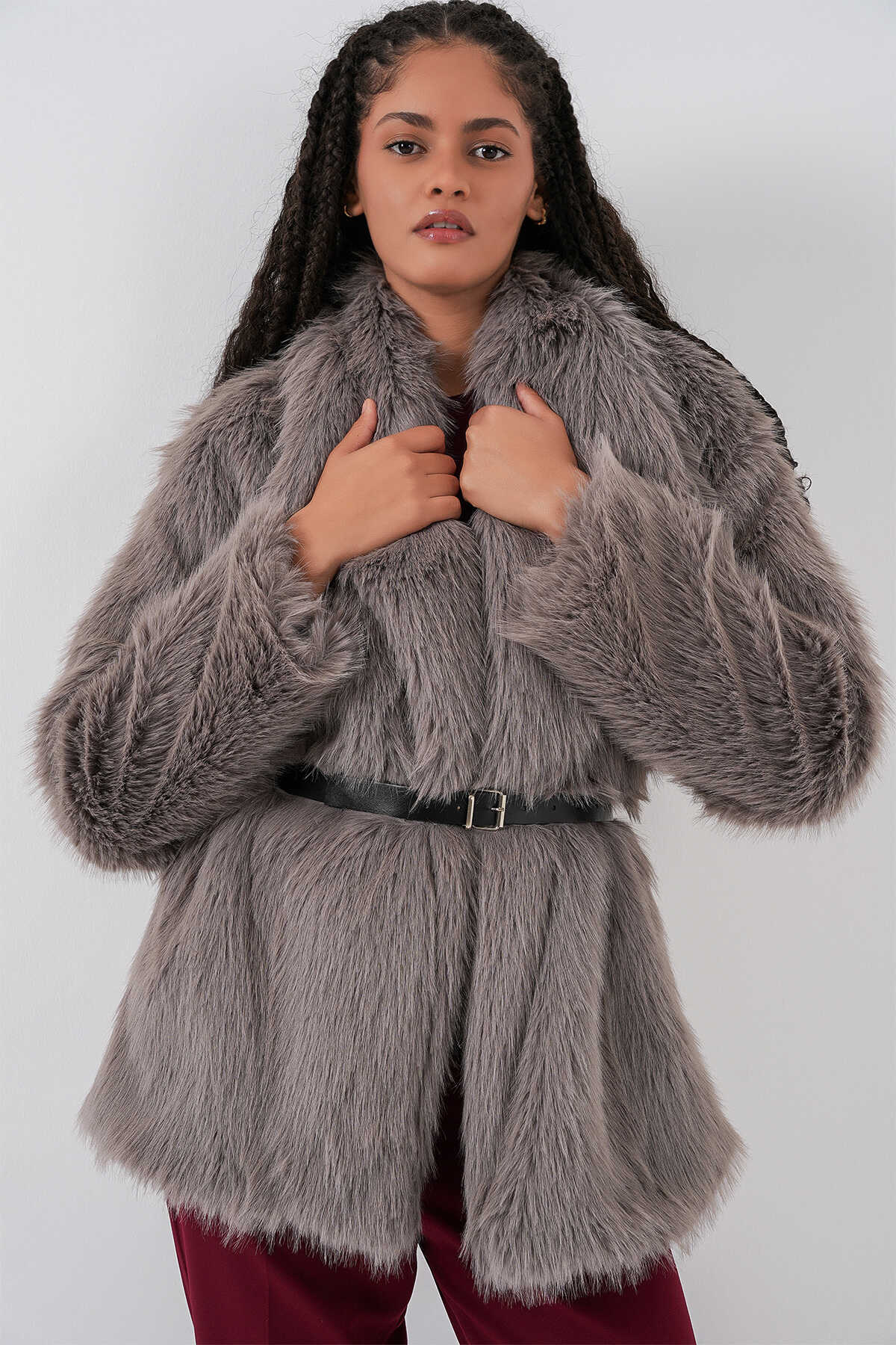 Kadın Kemerli Oversize Kürklü Kaban 9156 - Füme - Kombin