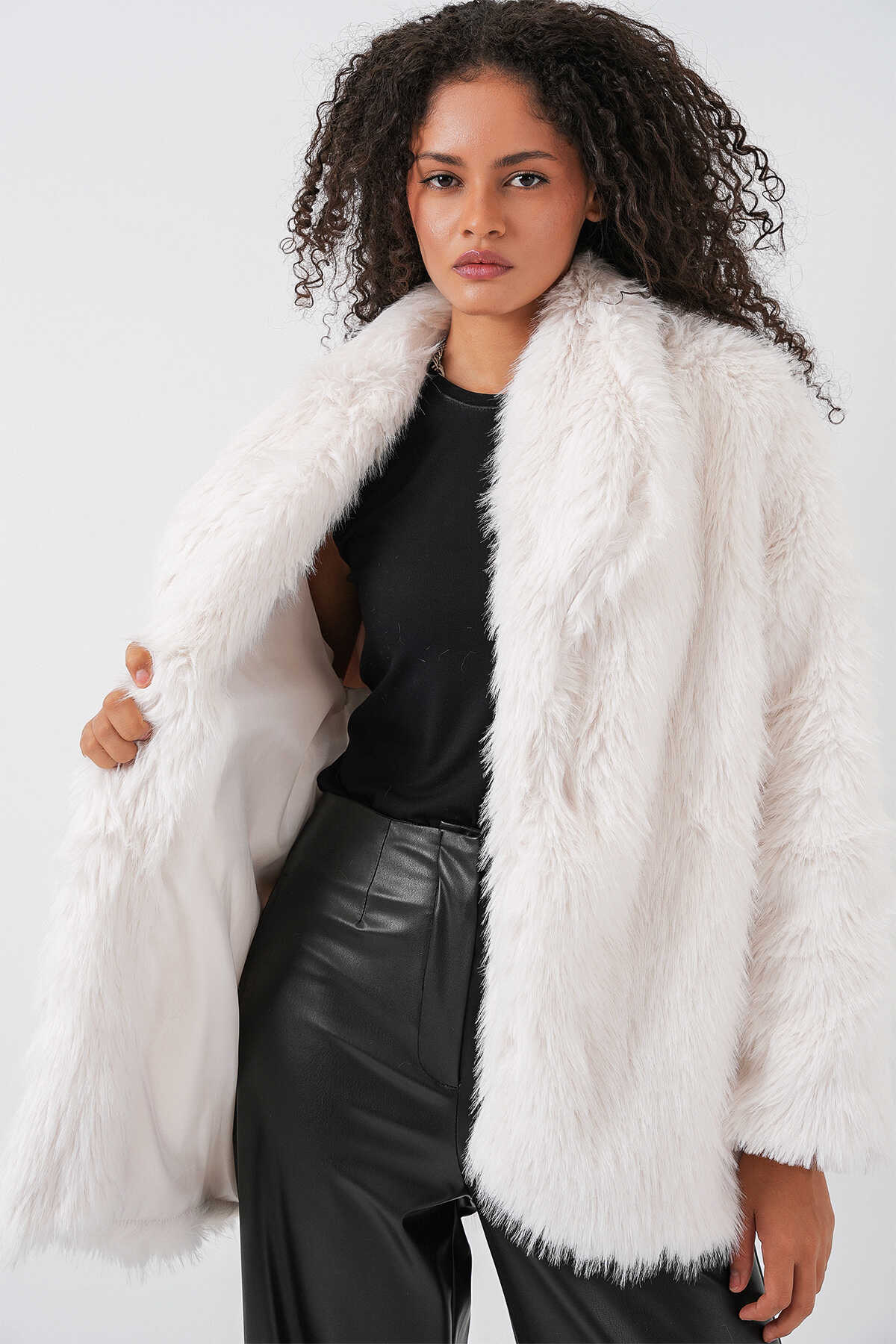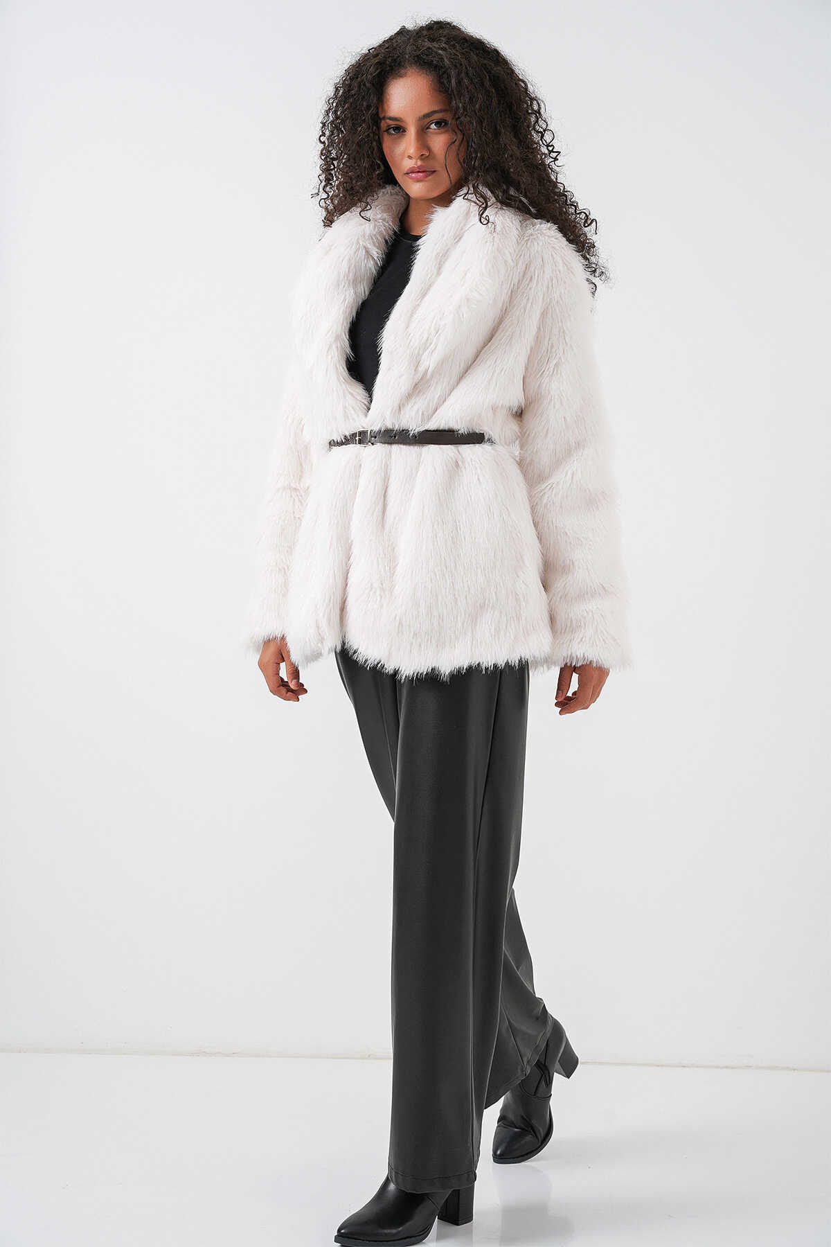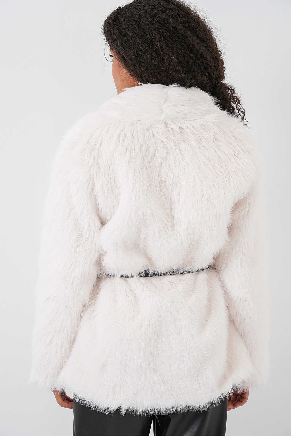 Kadın Kemerli Oversize Kürklü Kaban 9156 - Beyaz - Kombin