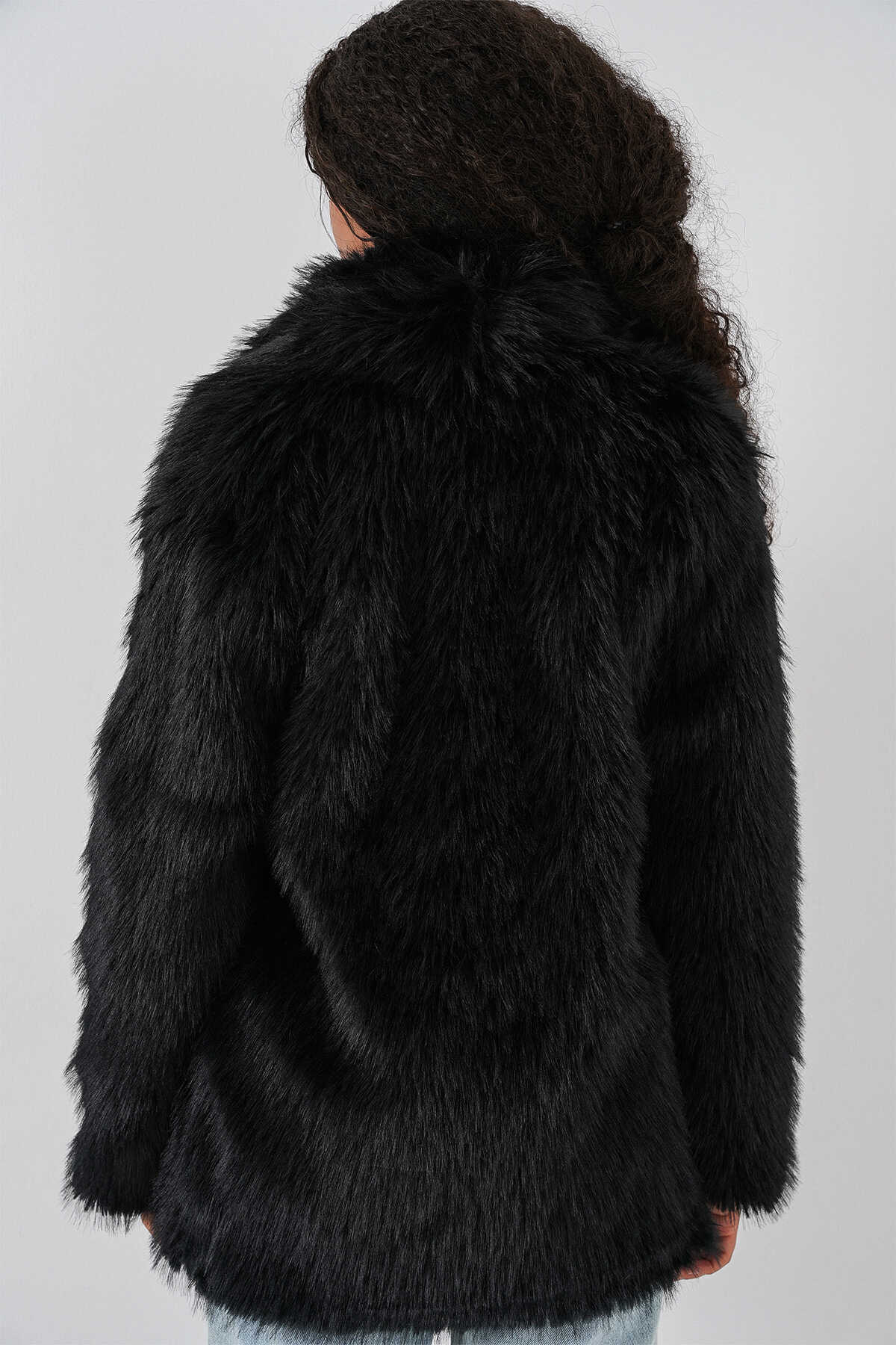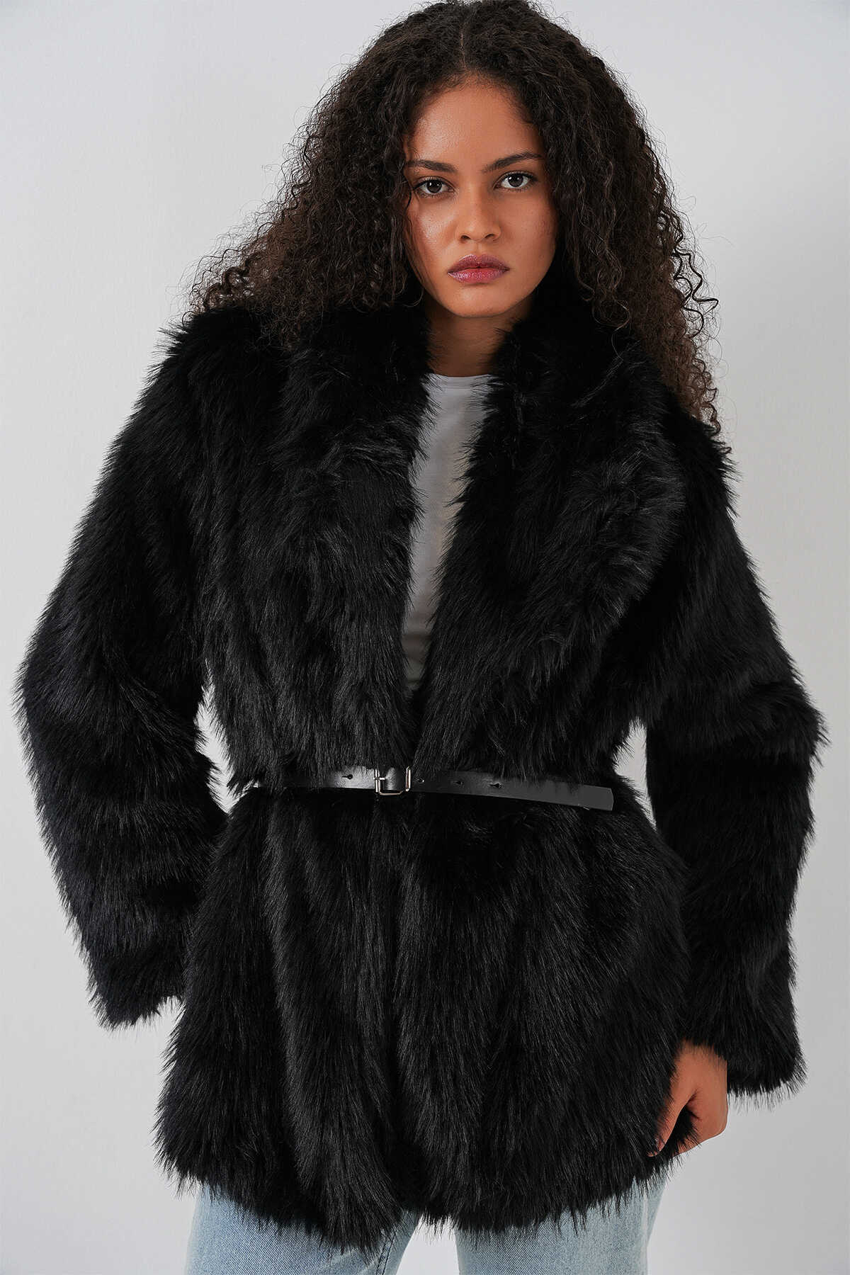 Kadın Kemerli Oversize Kürklü Kaban 9156 - Siyah