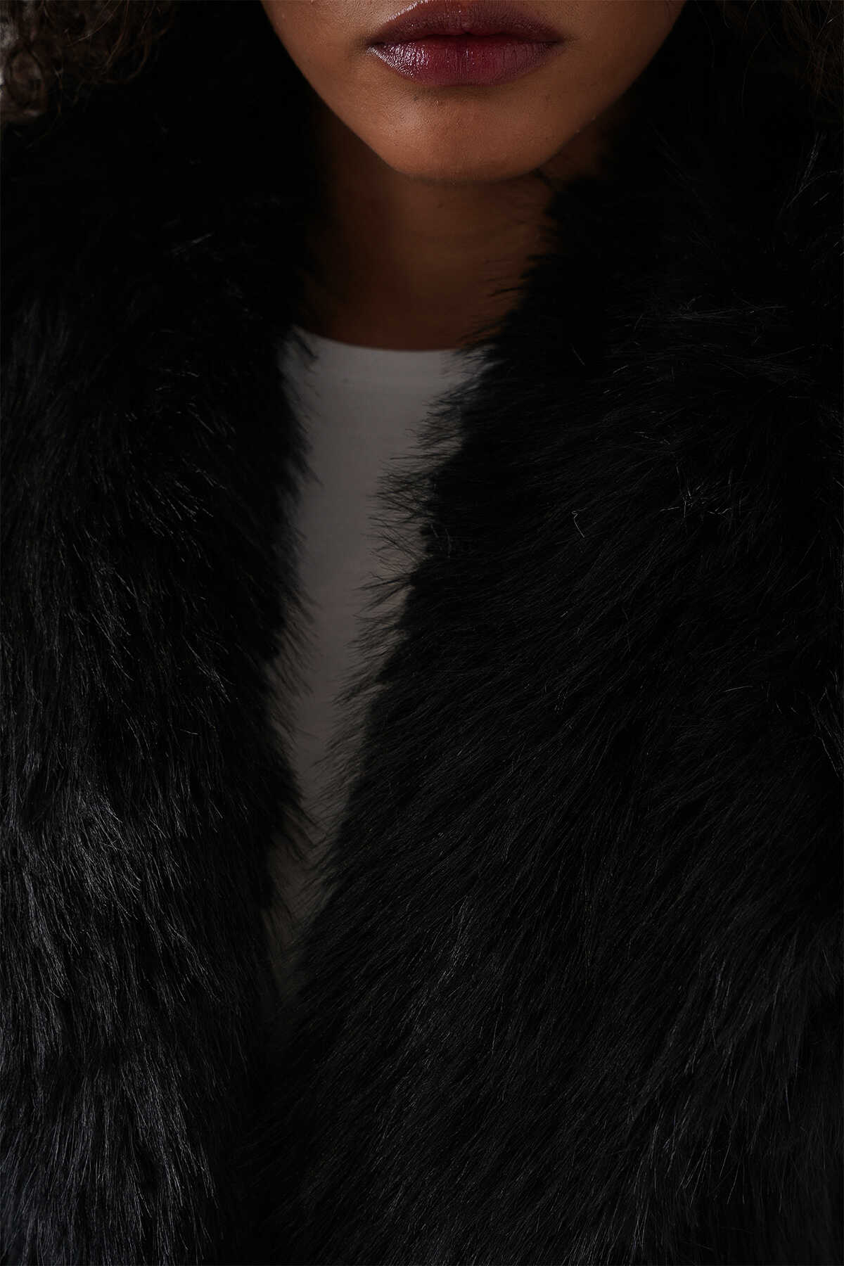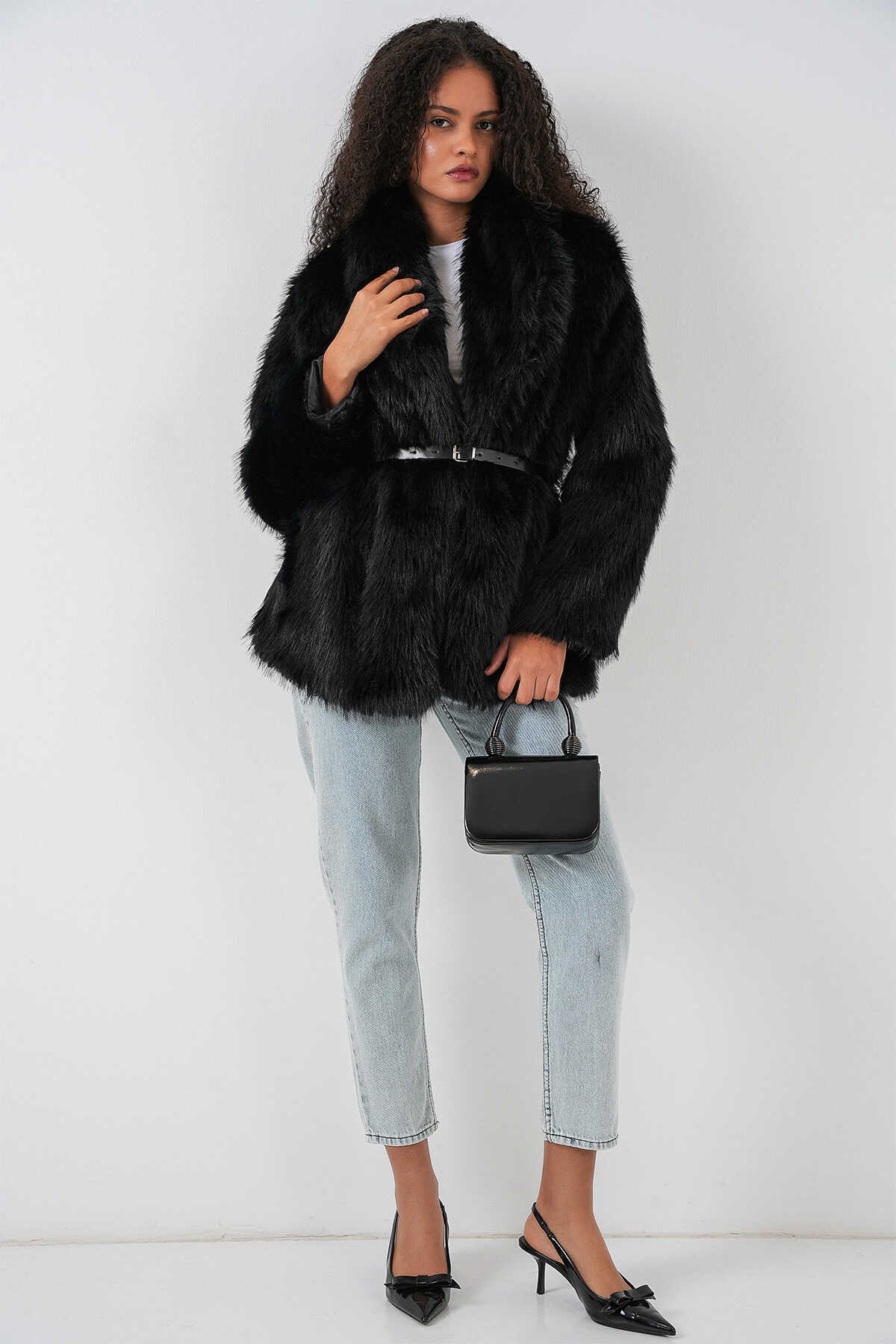 Kadın Kemerli Oversize Kürklü Kaban 9156 - Siyah - Kombin