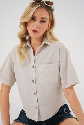 Kadın Keten Görünümlü Crop Gömlek 20339 - Krem