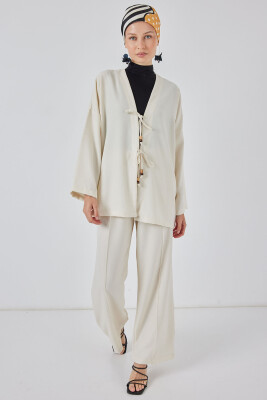 Kadın Keten Kimono İkili Takım 6727 - Ekru - Kombin
