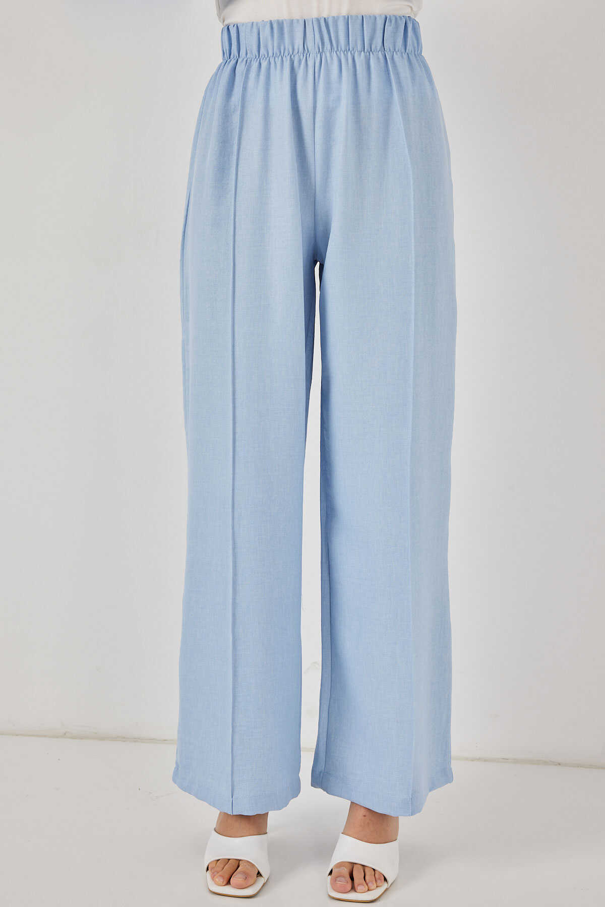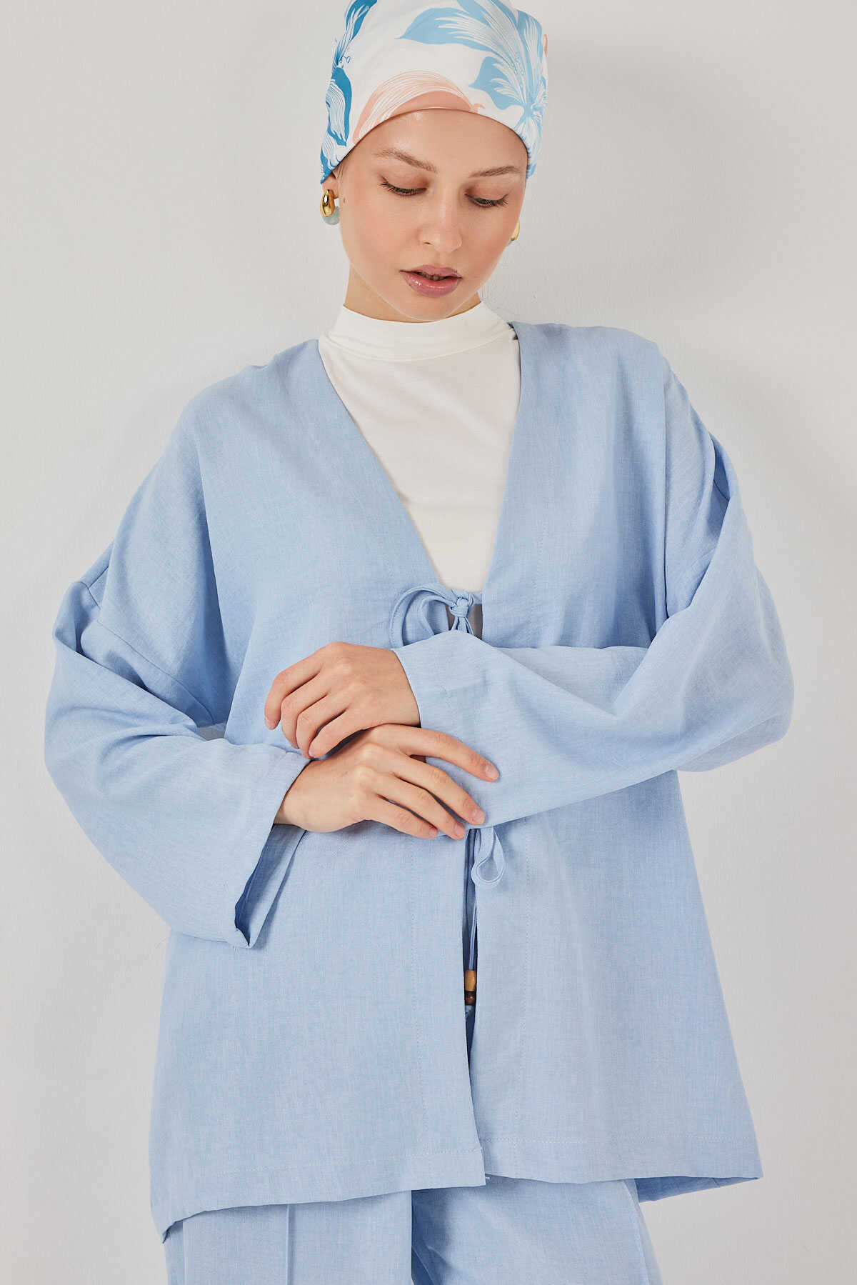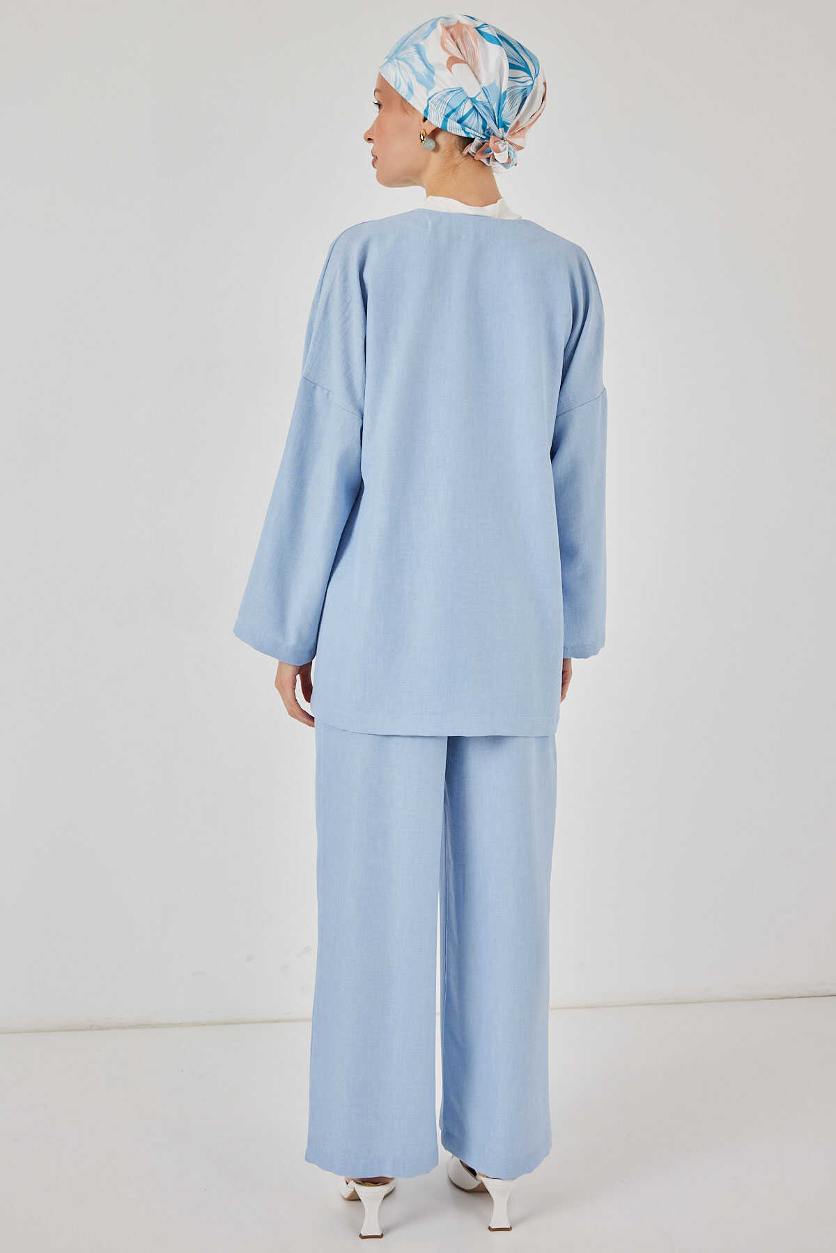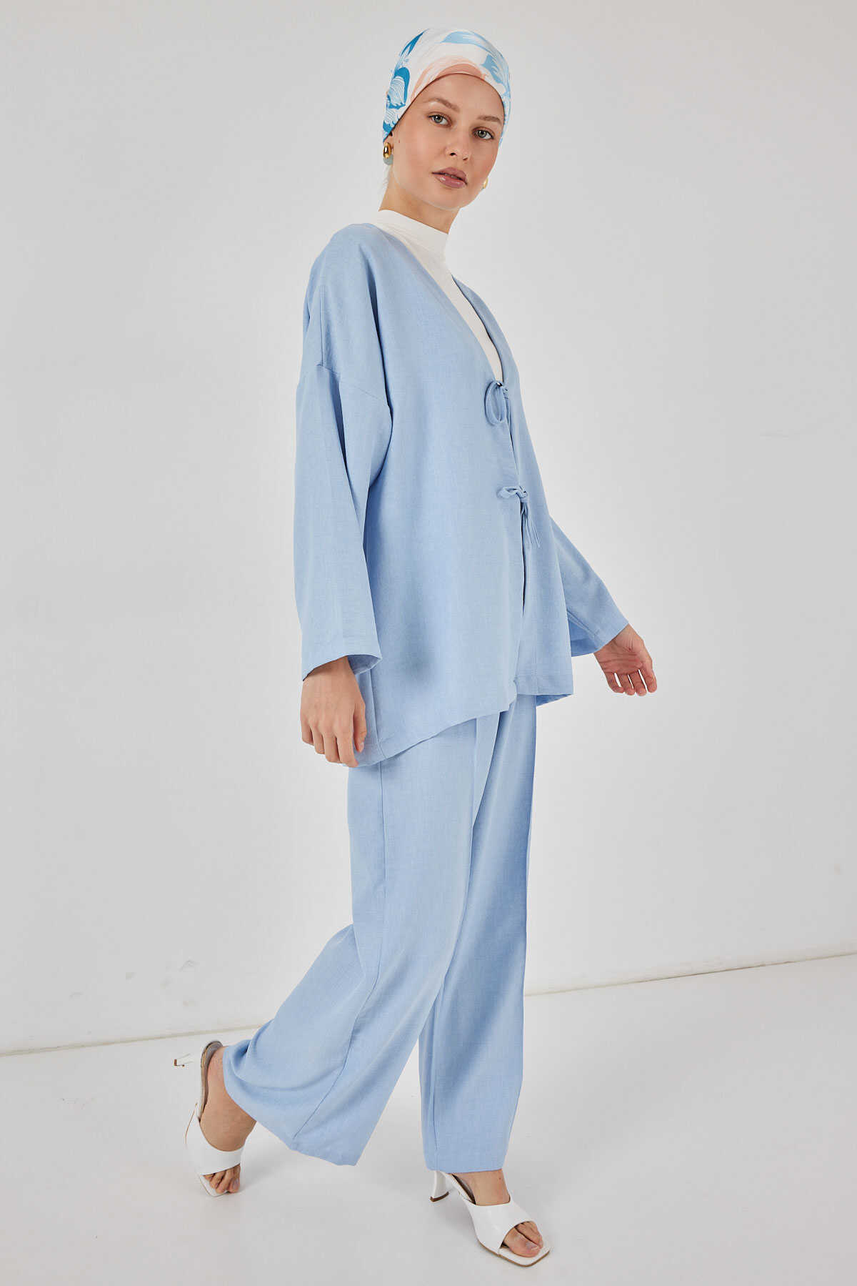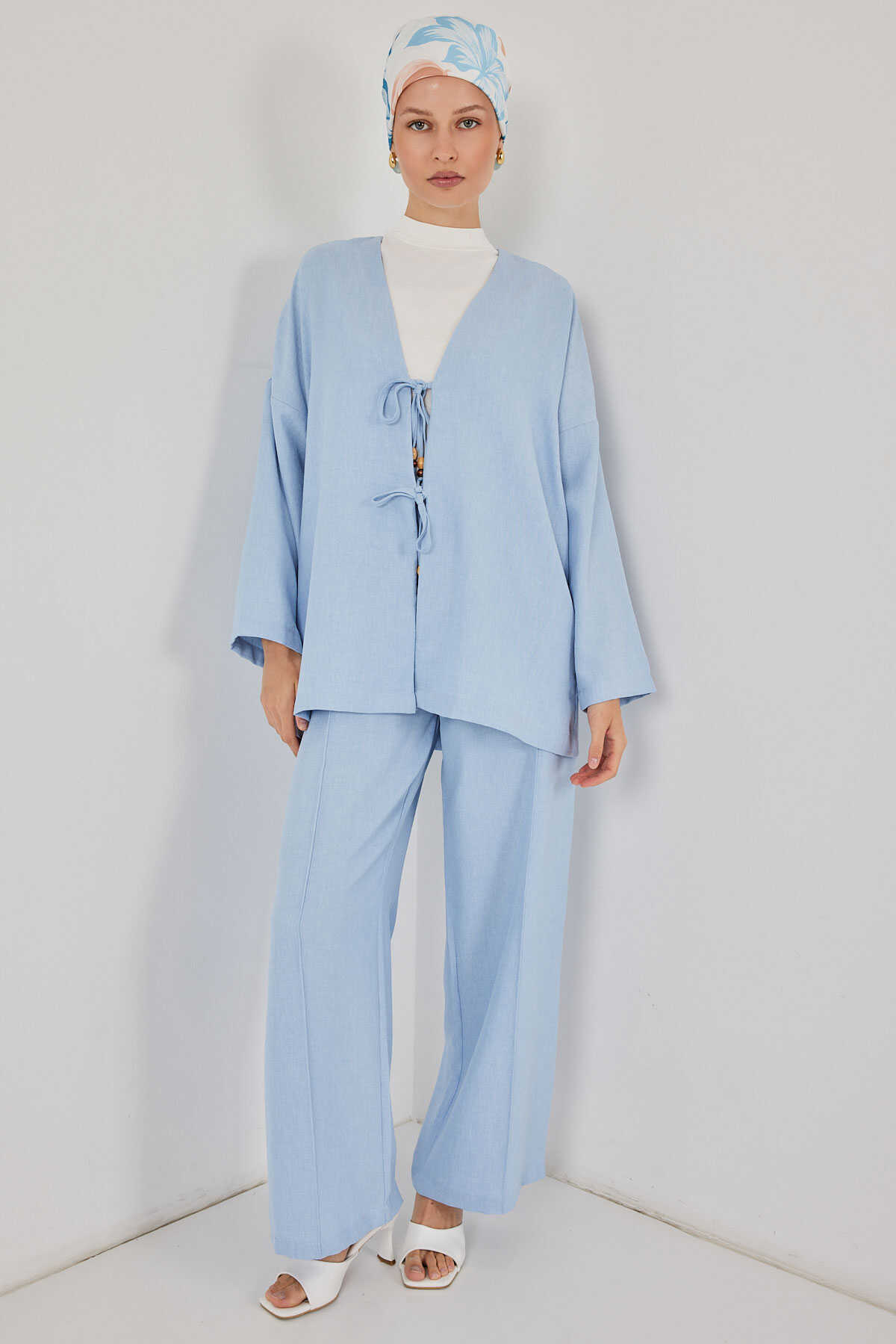 Kadın Keten Kimono İkili Takım 6727 - Mavi - Kombin