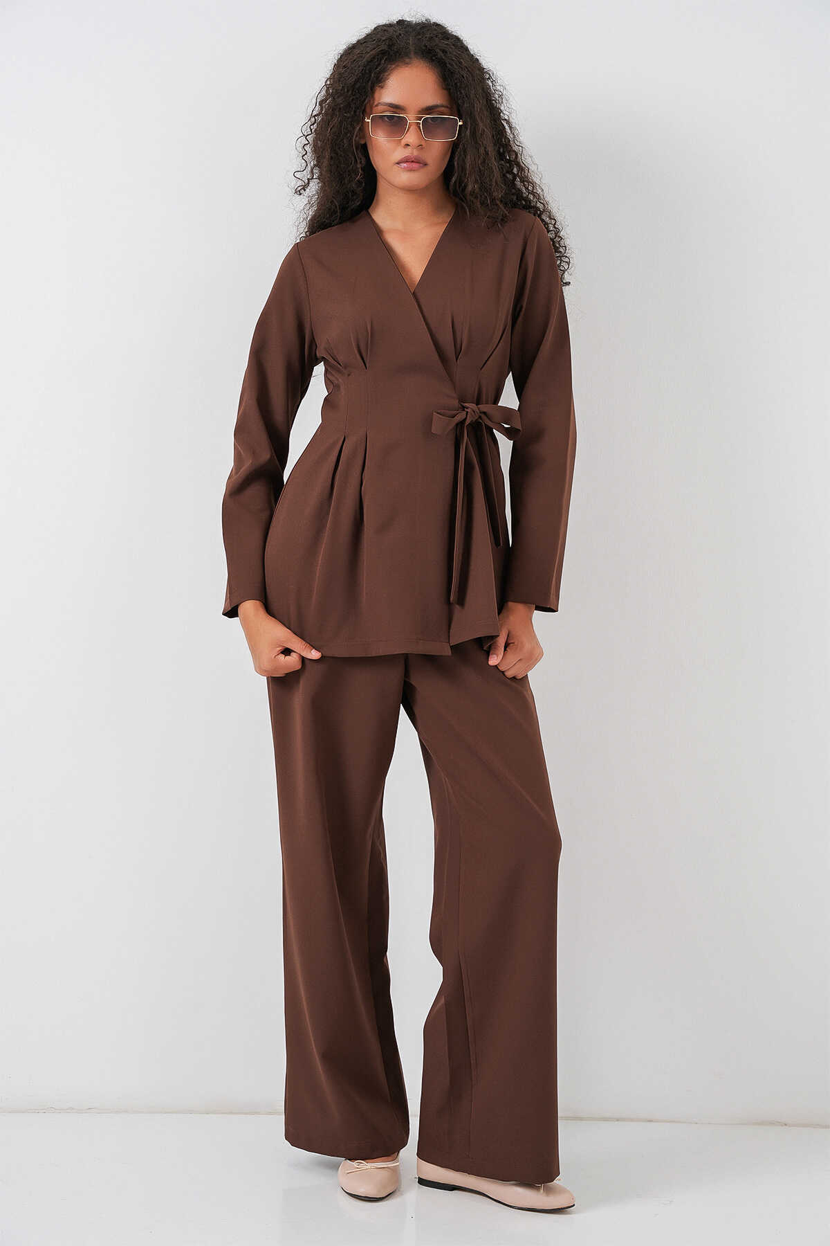 Kadın Kimono Pantolon Kumaş Takım 30054 - Kahverengi