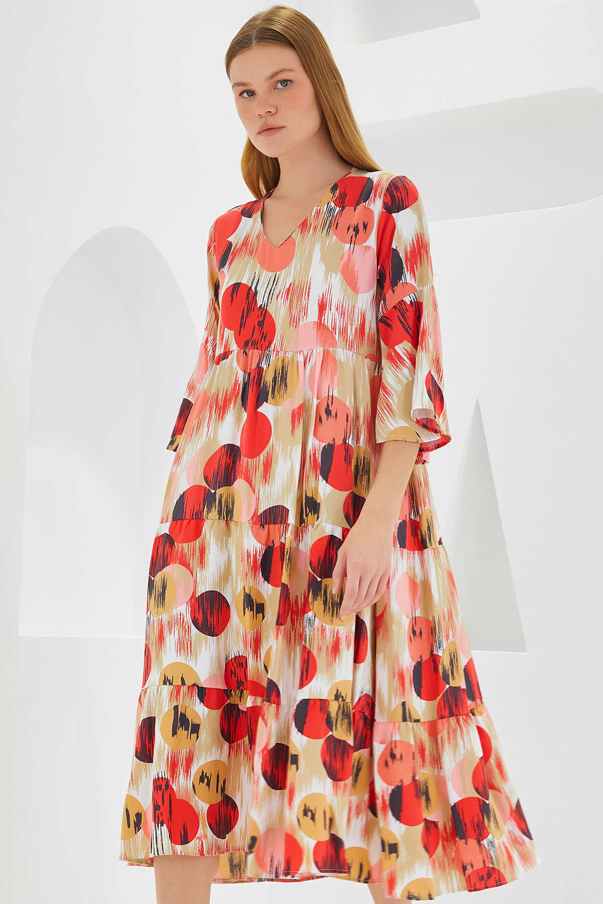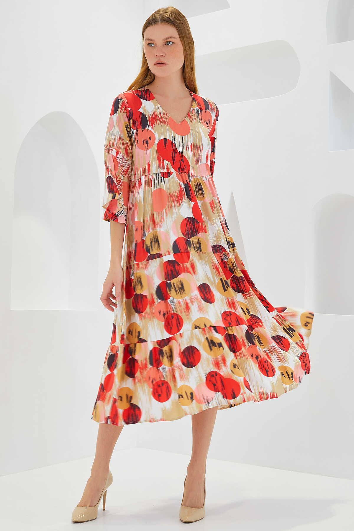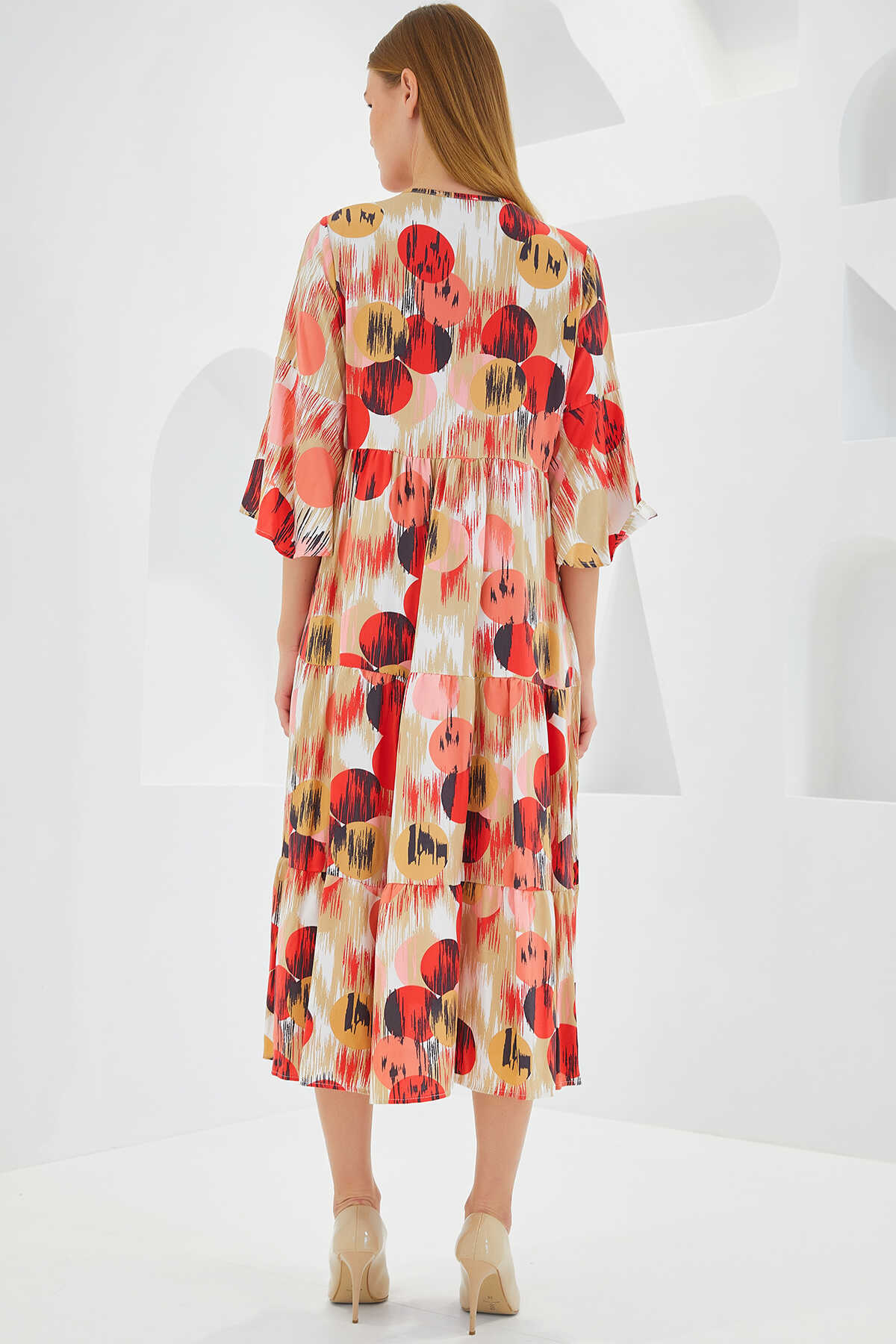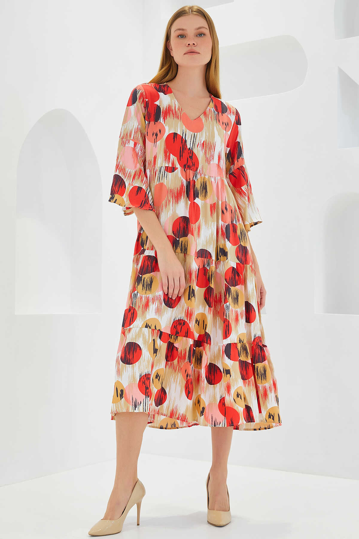 Kadın Kiremit Ekru Desenli Kısa Kol Viskon Elbise 1959