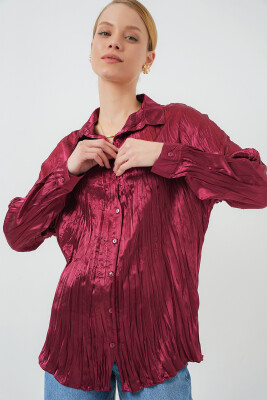 Kadın Kırışık Saten Gömlek 20316 - Bordo