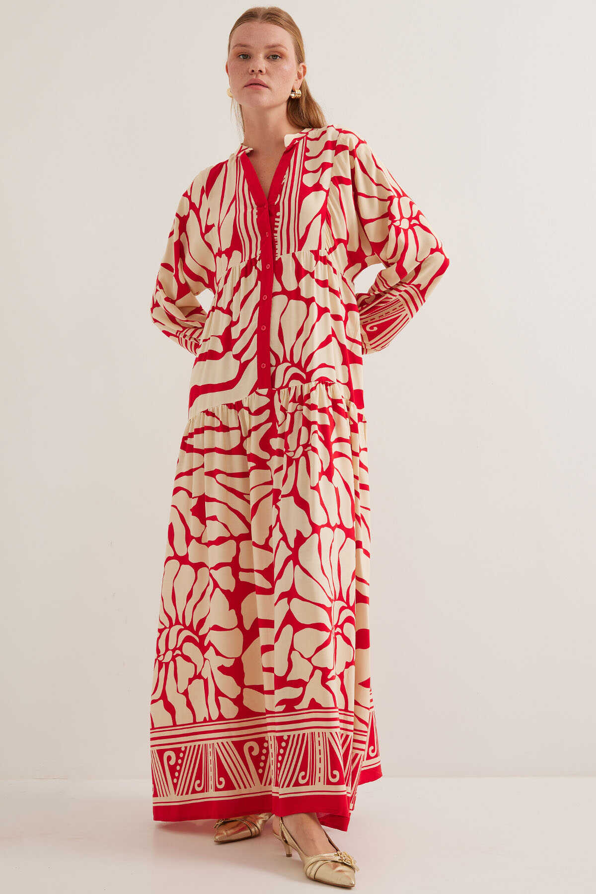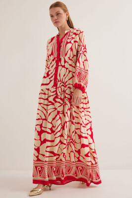 Kadın Kırmızı Bej Viskon Tesettür Elbise 2423 - Kombin