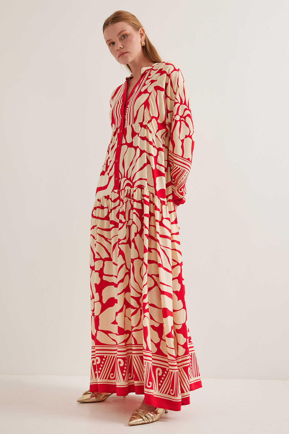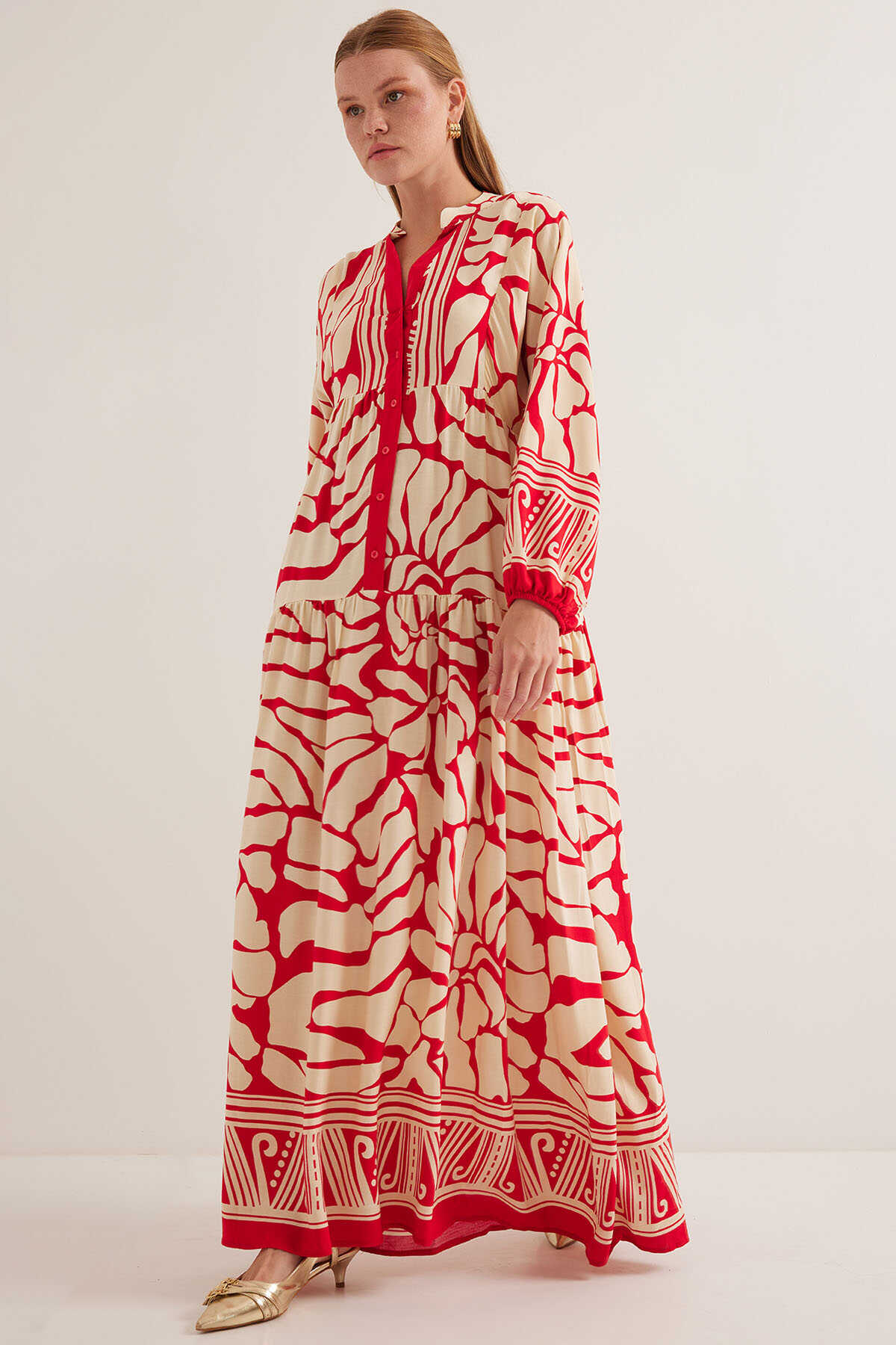 Kadın Kırmızı Bej Viskon Tesettür Elbise 2423