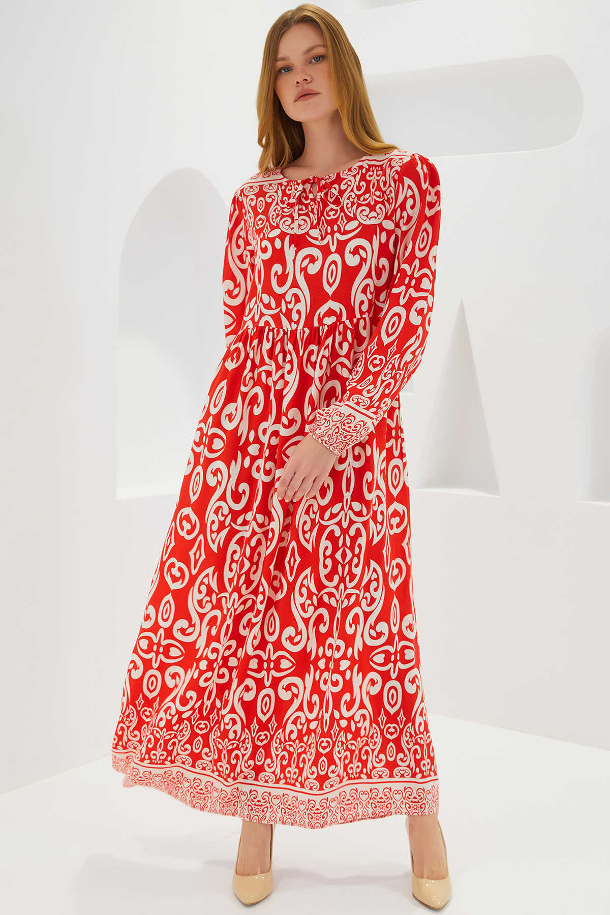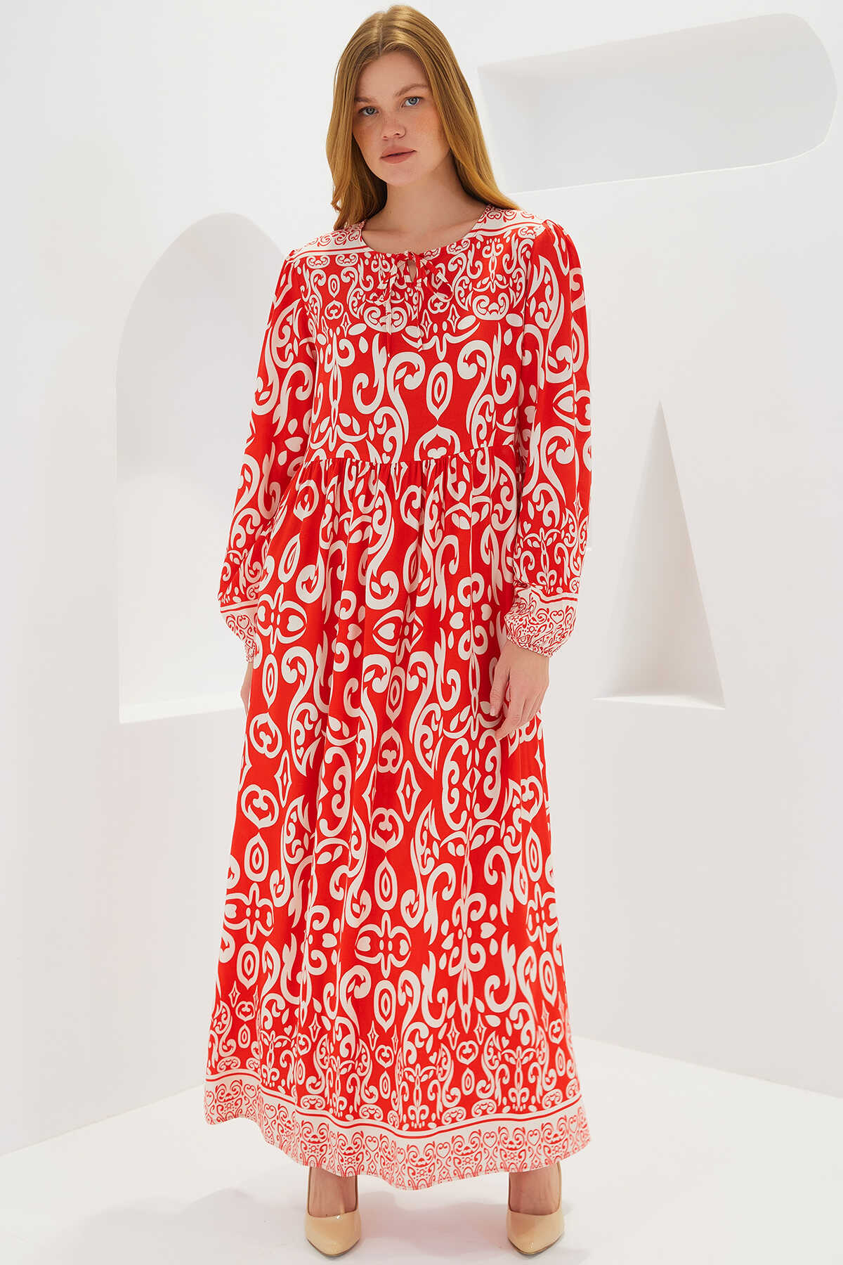 Kadın Kırmızı Desenli Uzun Viskon Elbise 1947