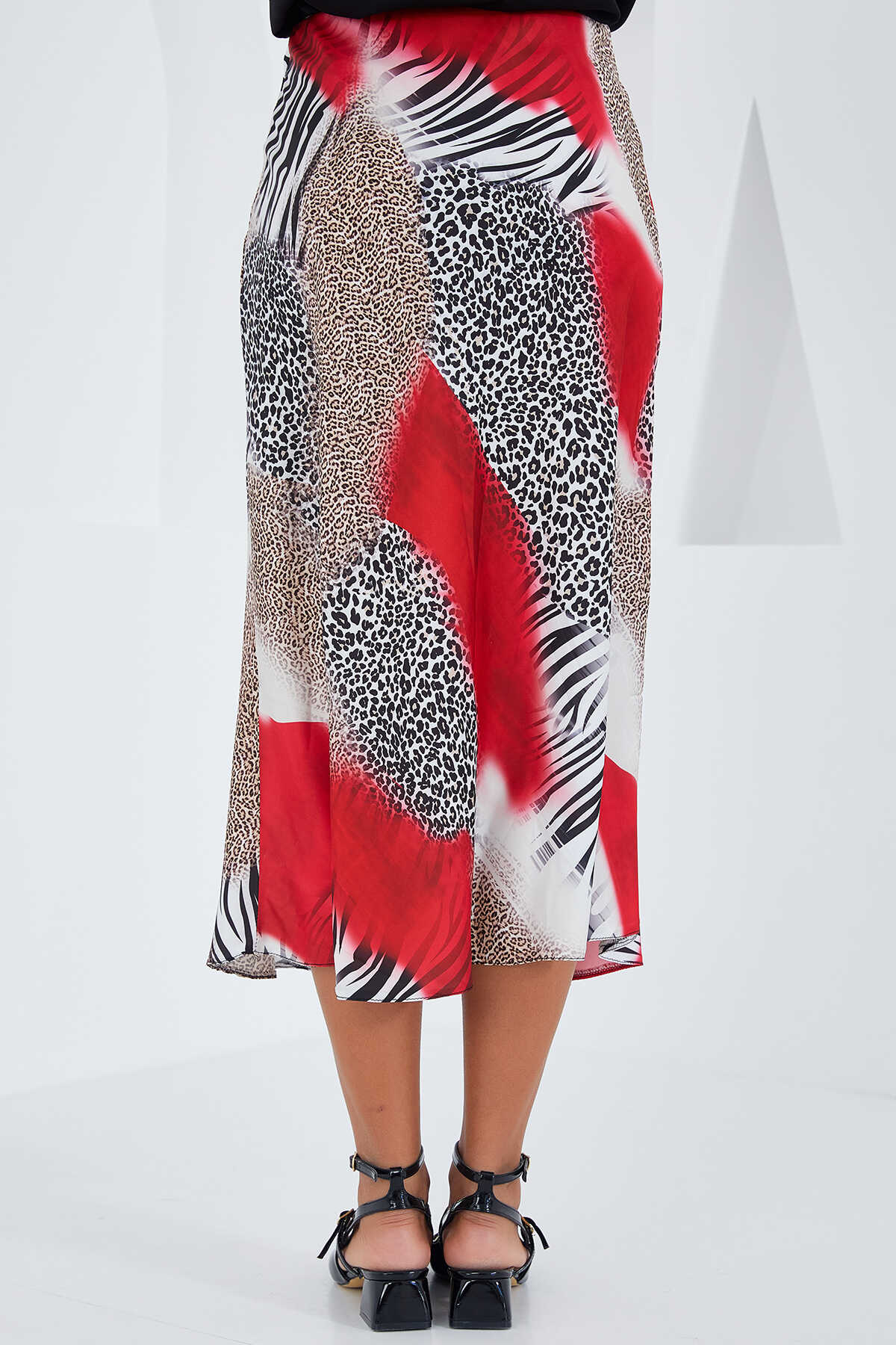 Kadın Kırmızı Siyah Desenli Saten Etek 15806 - Kombin