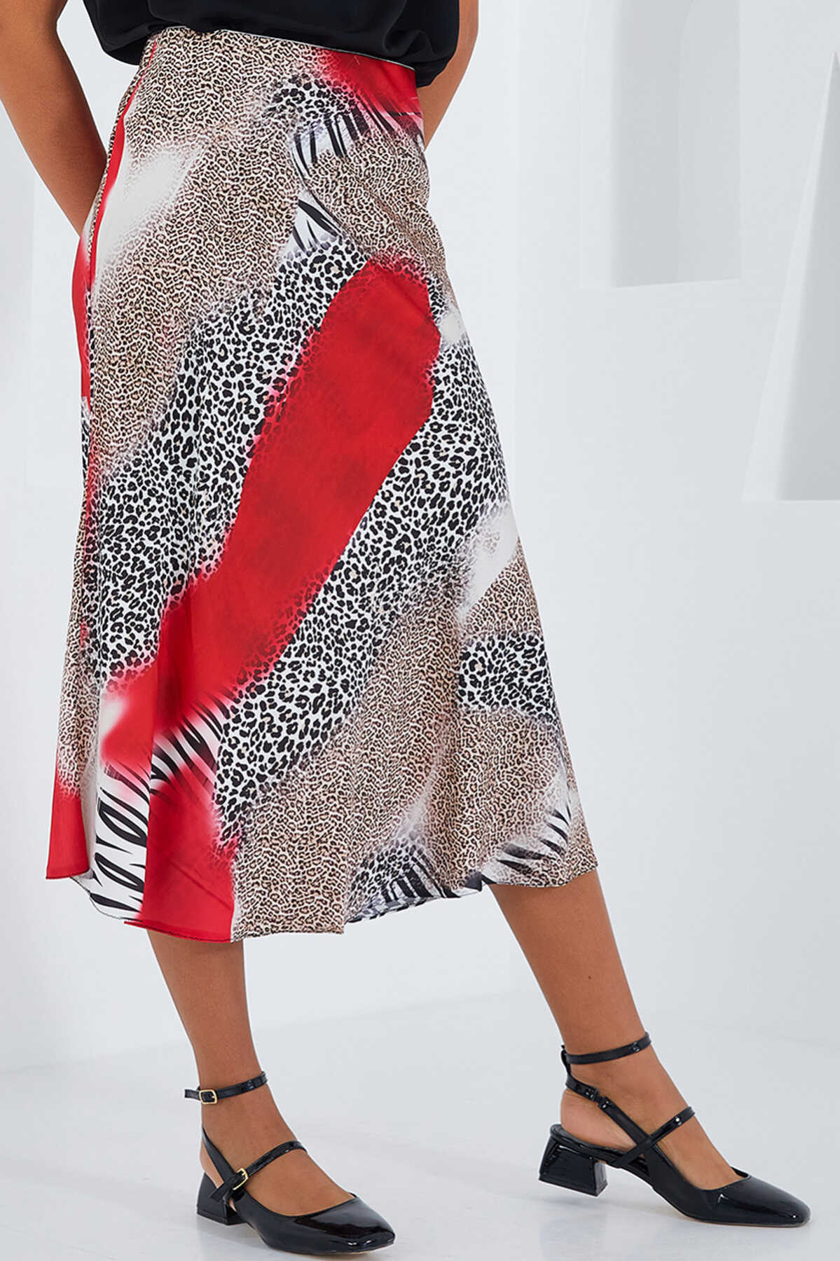 Kadın Kırmızı Siyah Desenli Saten Etek 15806