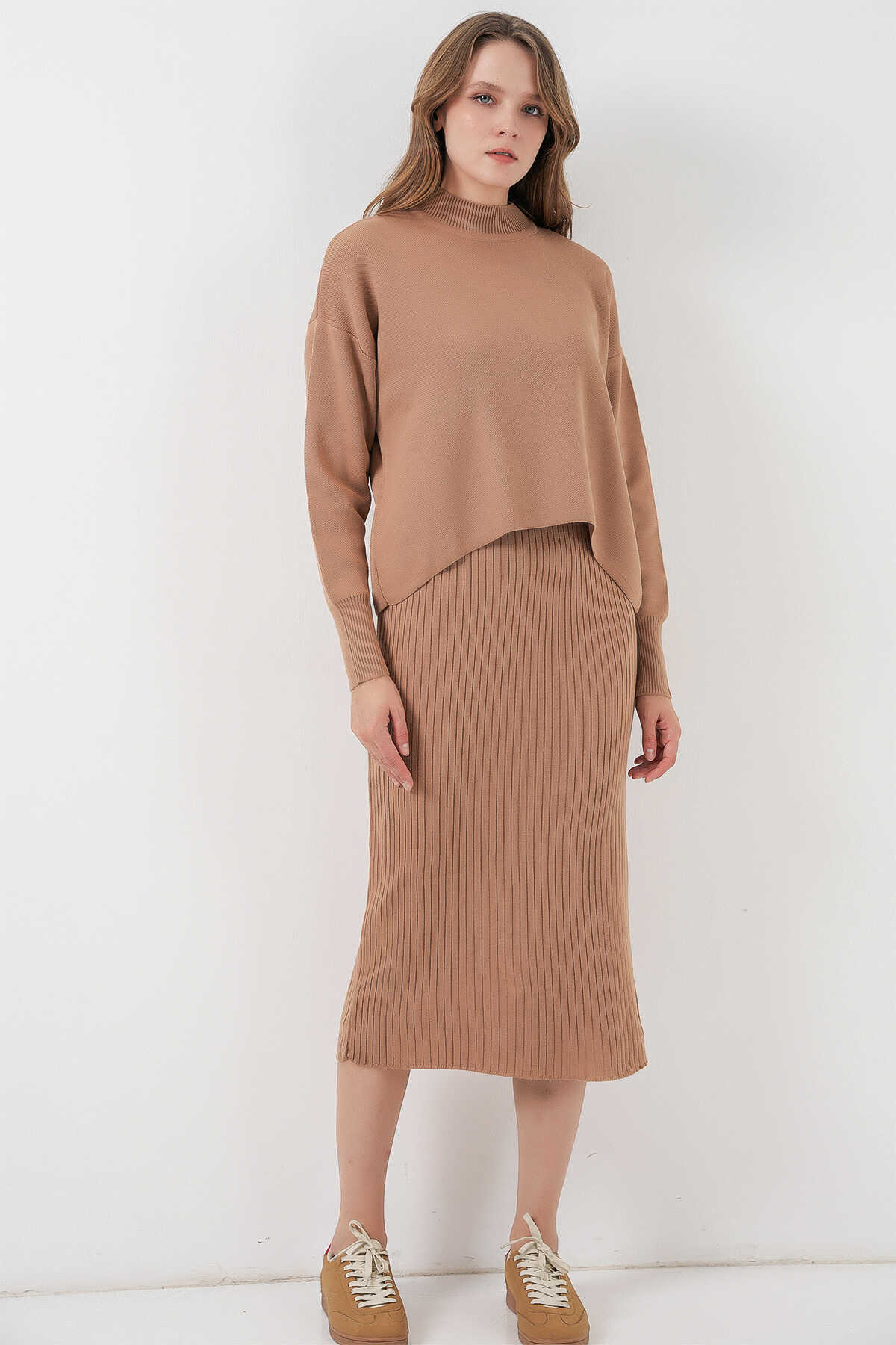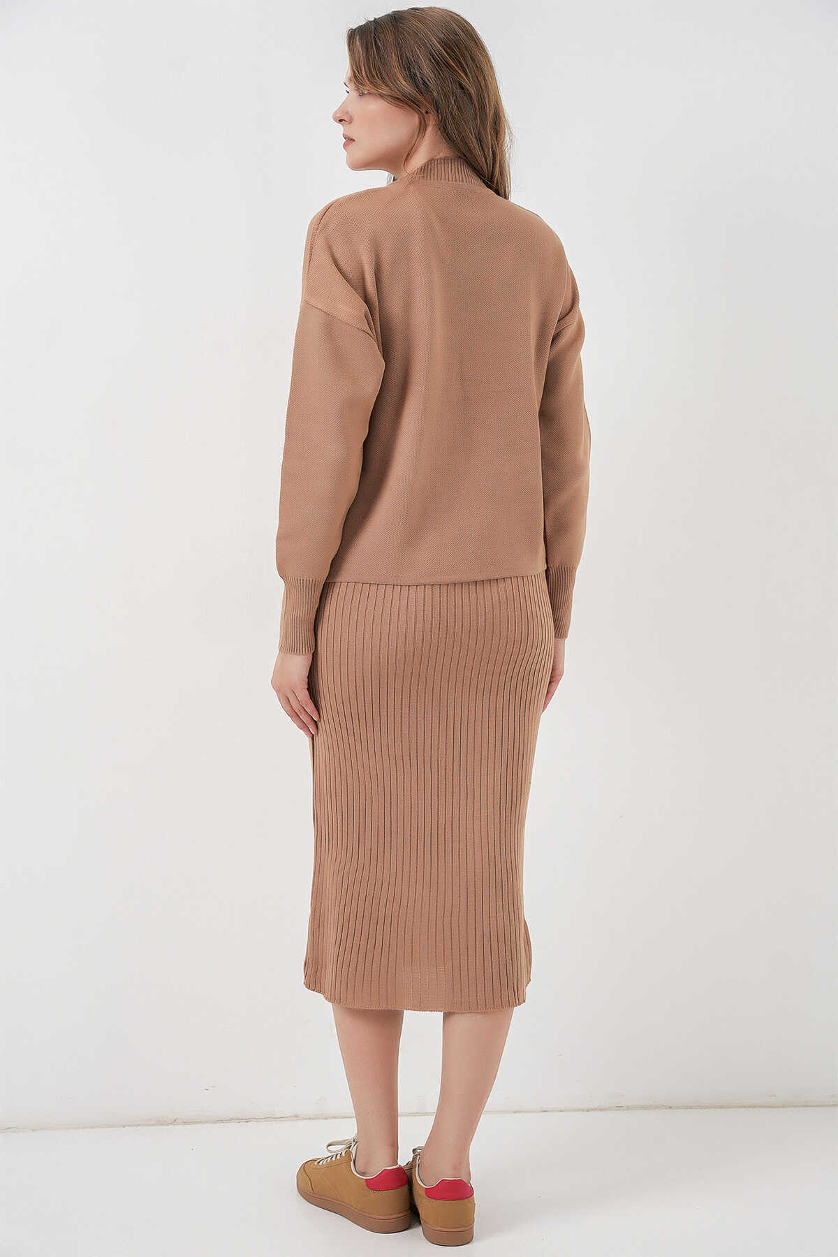 Kadın Kısa Kazaklı Triko Elbise 15958 - Camel