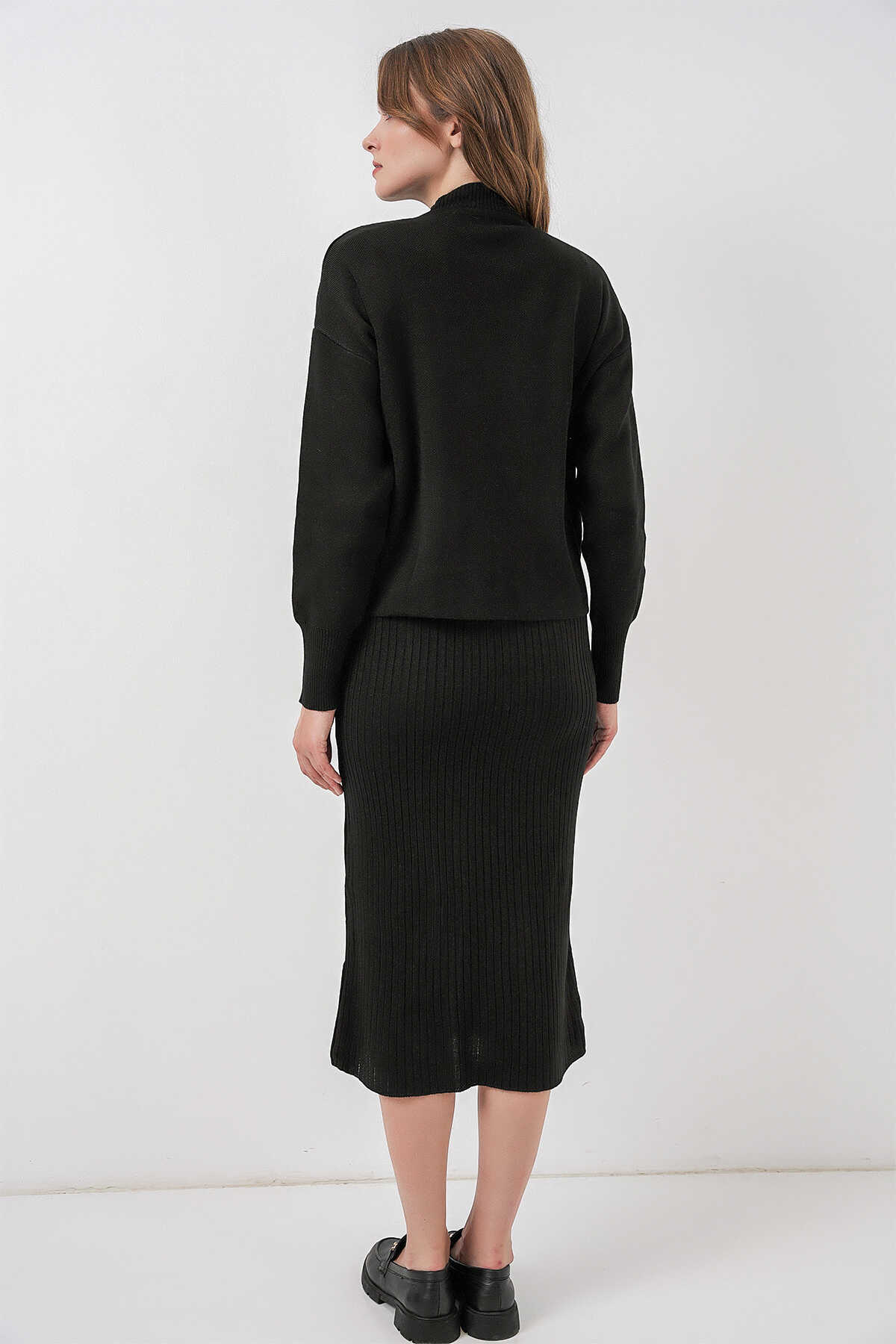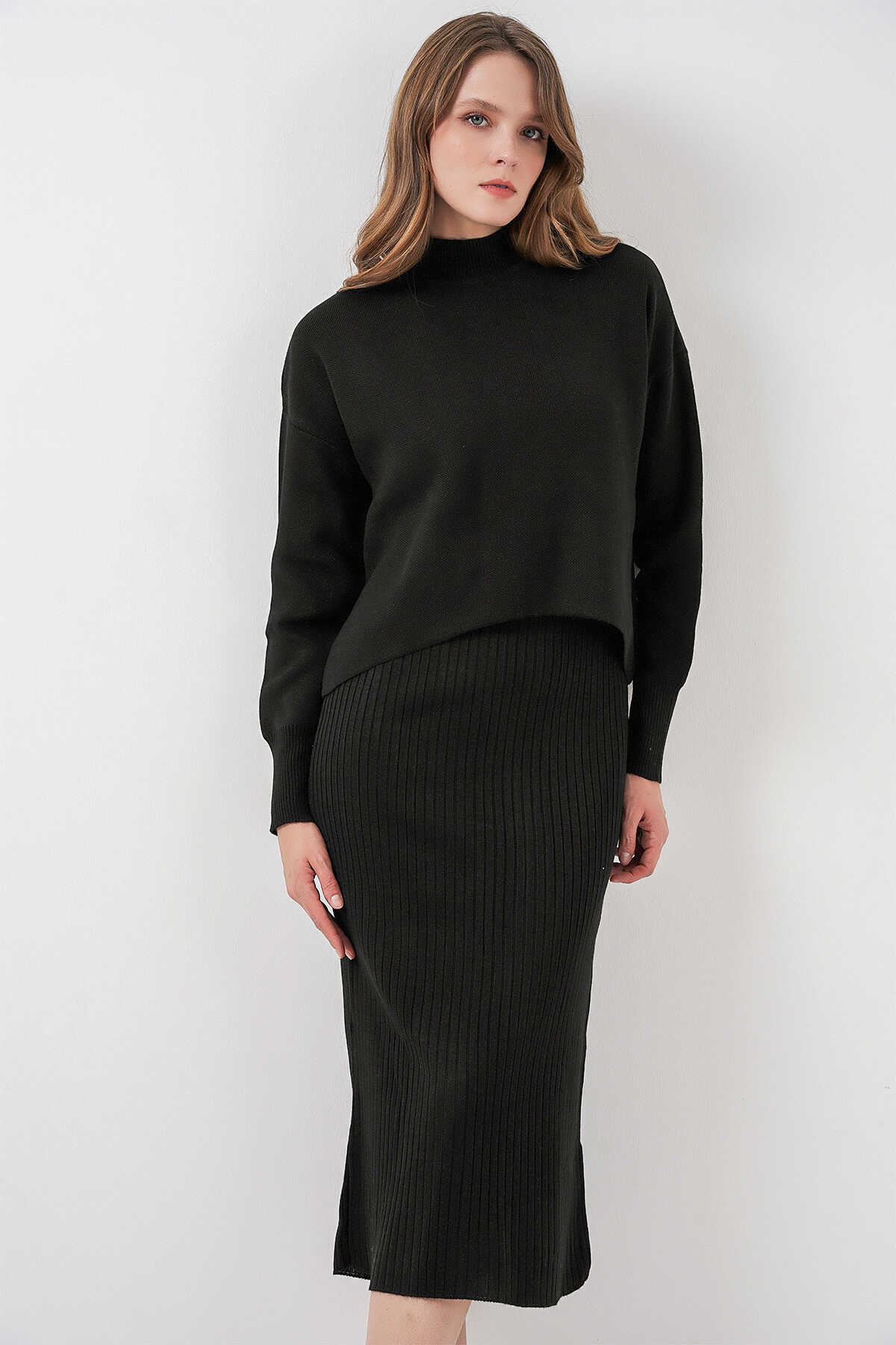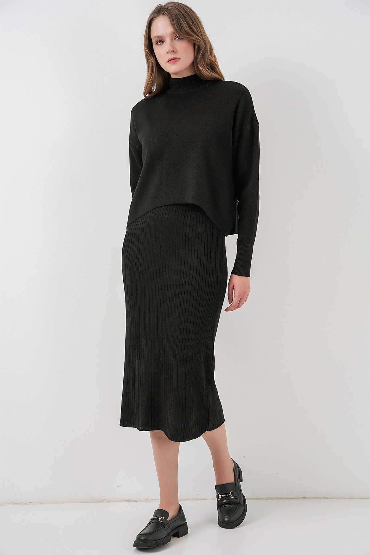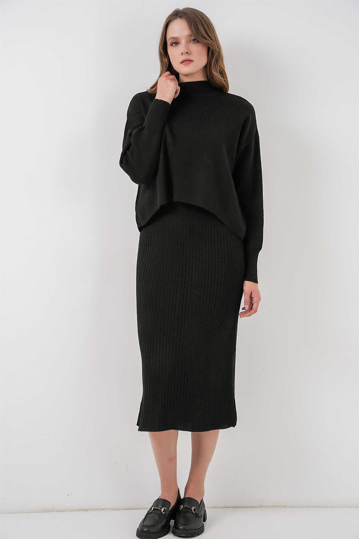 Kadın Kısa Kazaklı Triko Elbise 15958 - Siyah - Kombin