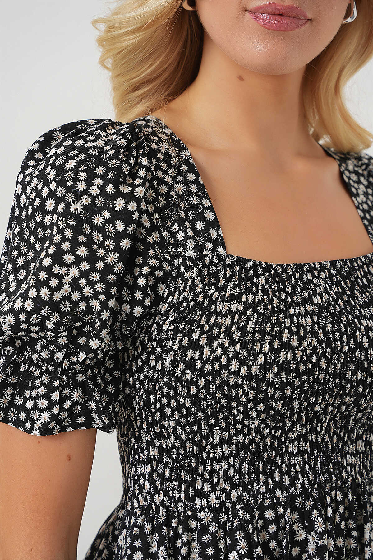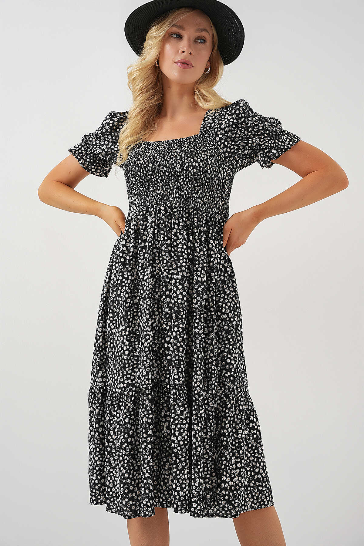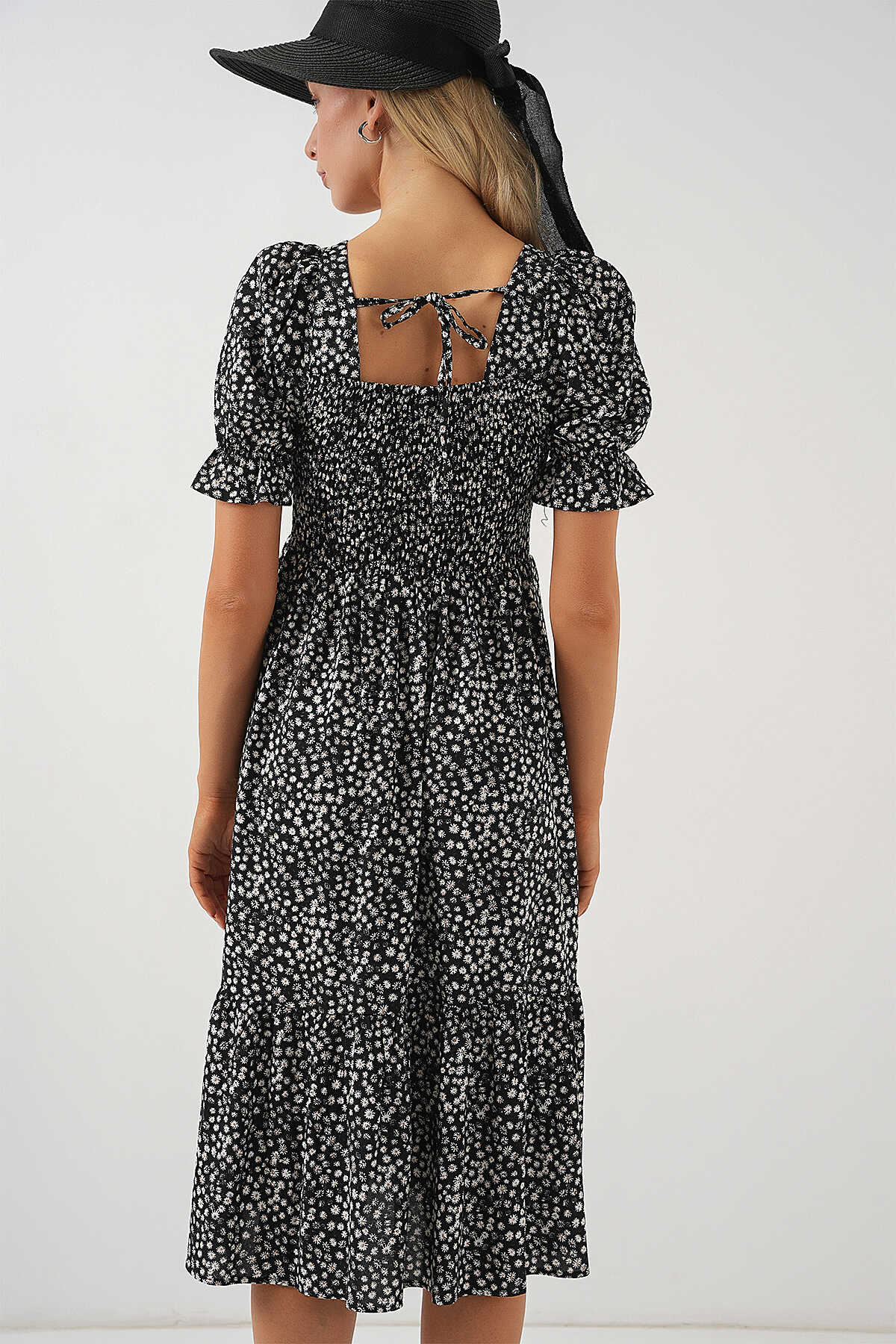 Kadın Kısa Kol Çiçekli Elbise 2556 - Siyah - Kombin