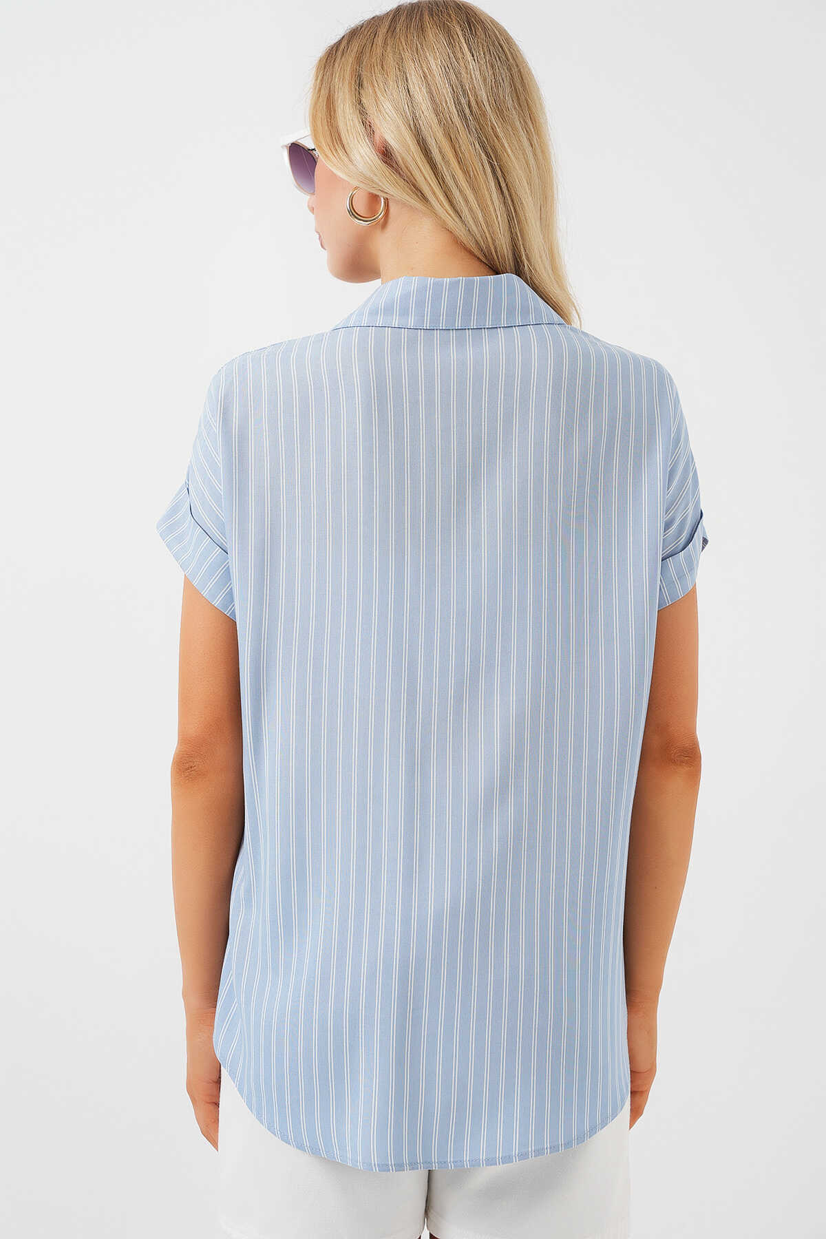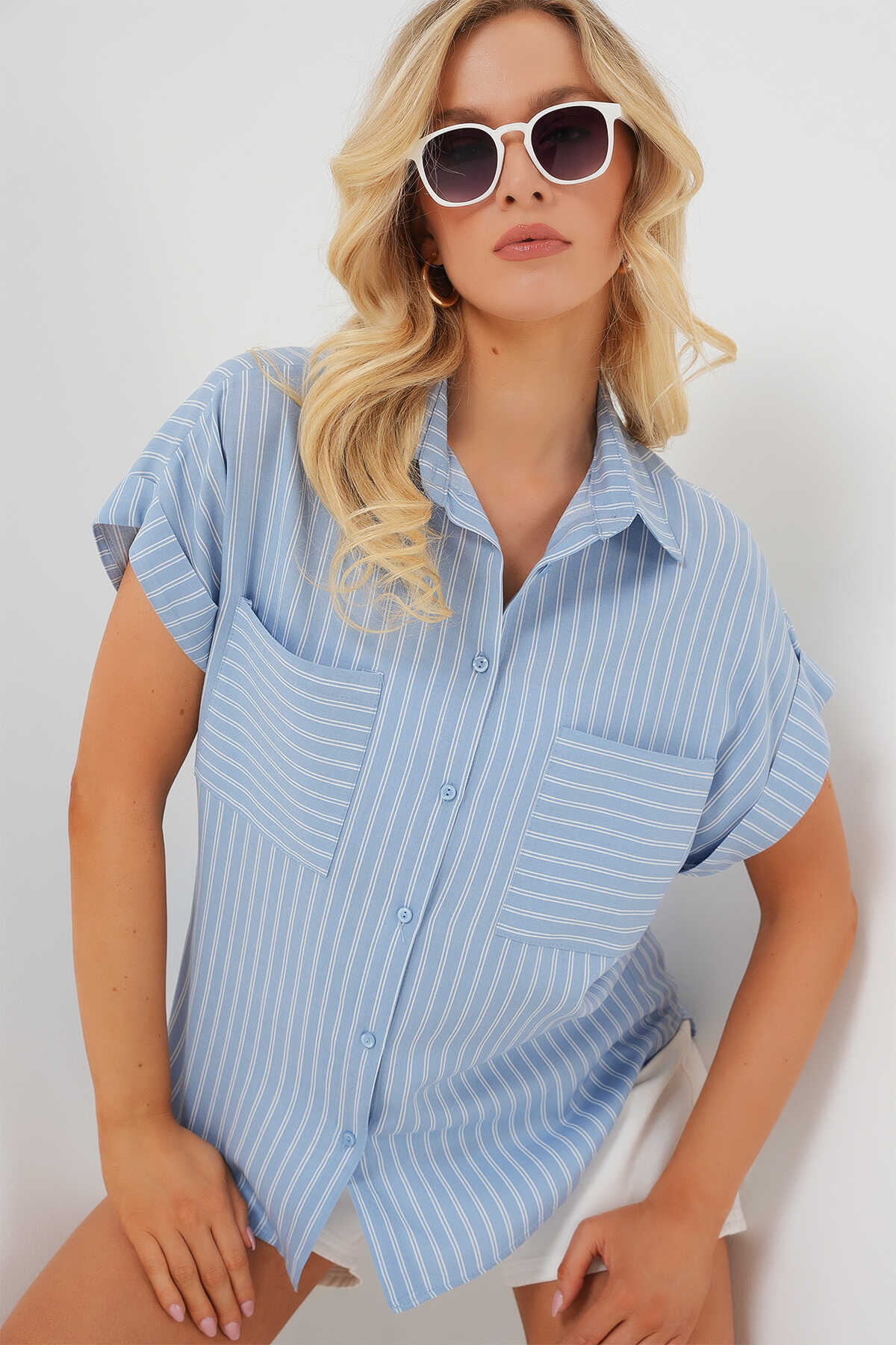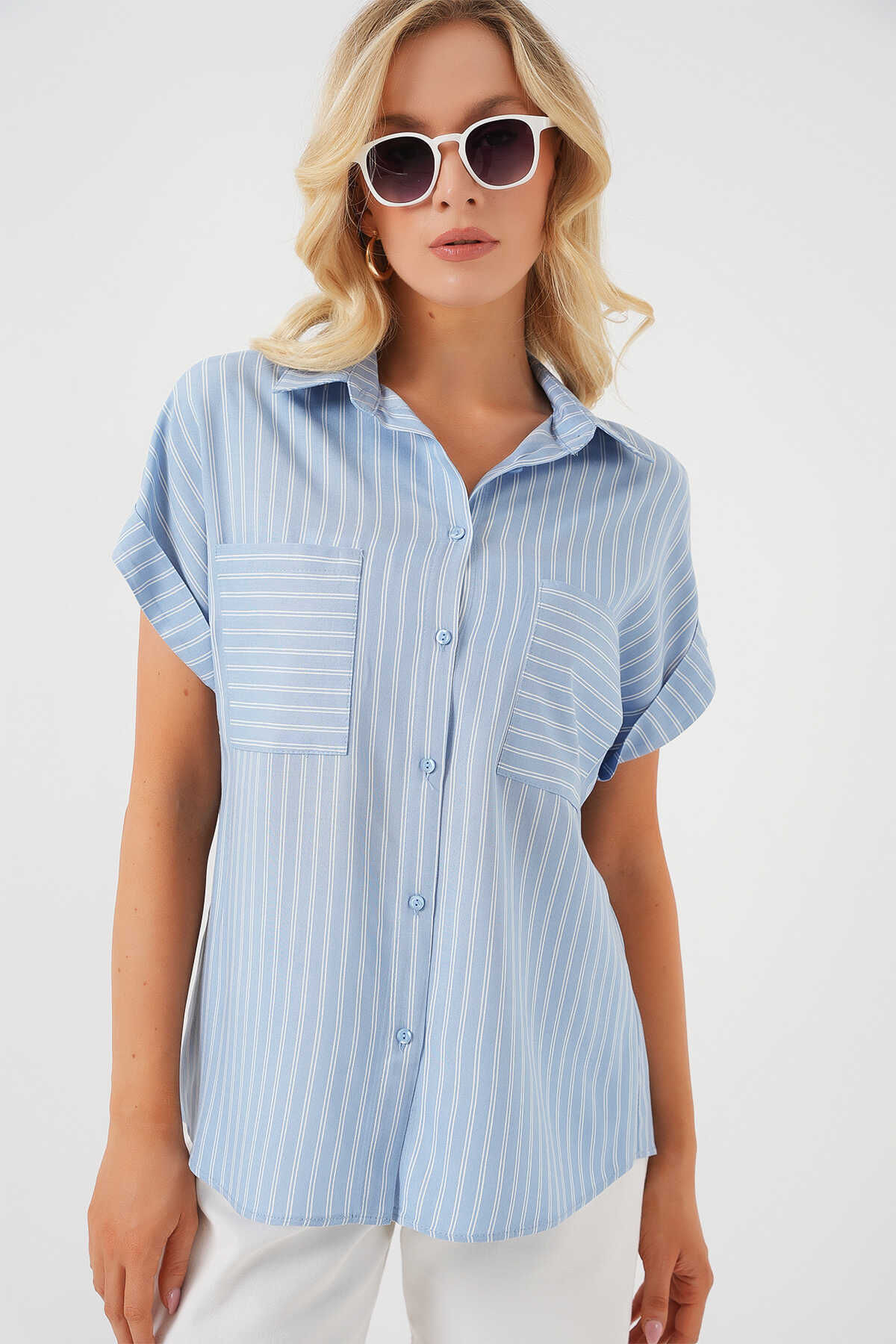 Kadin Kisa Kol Çizgili Oversize Gömlek