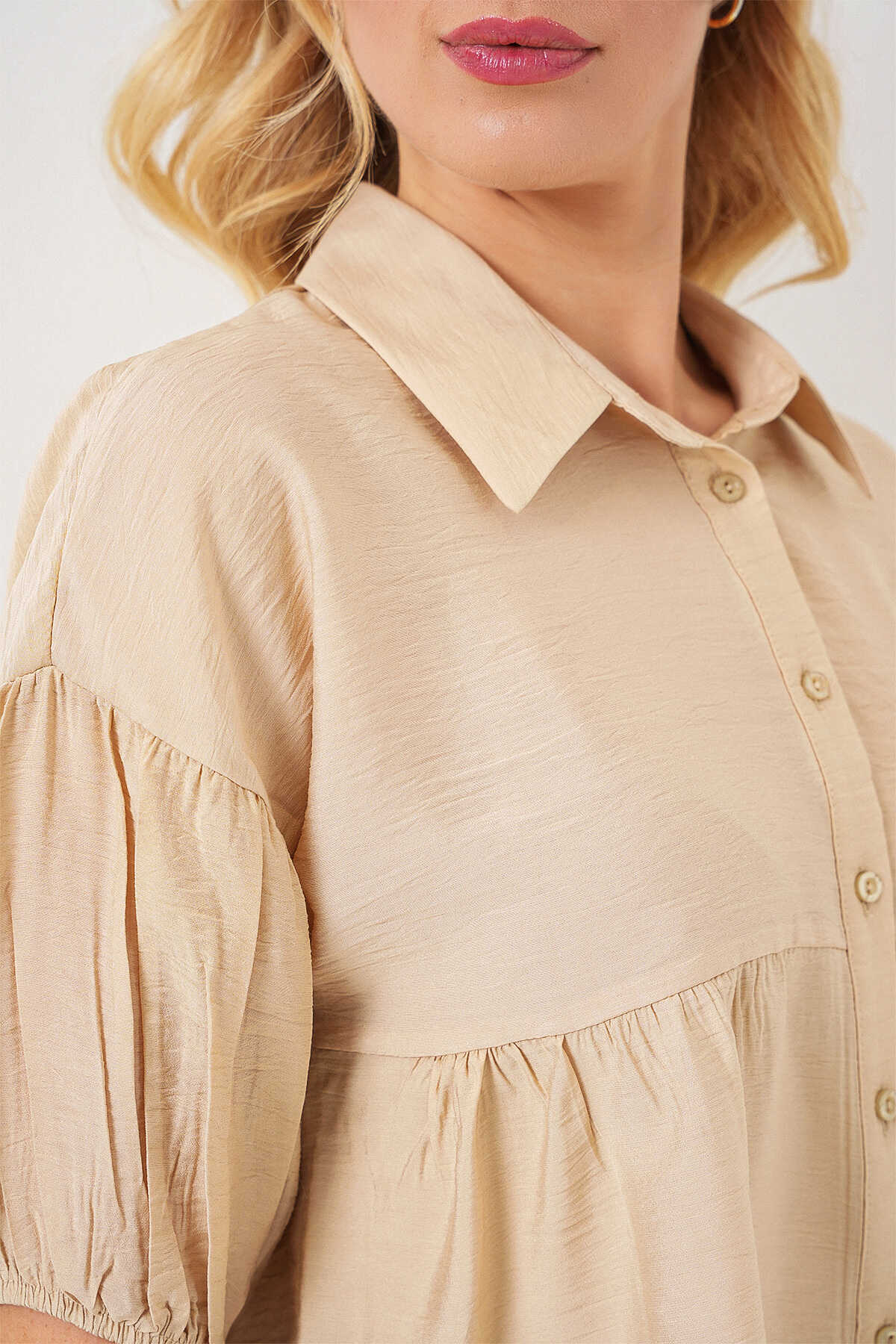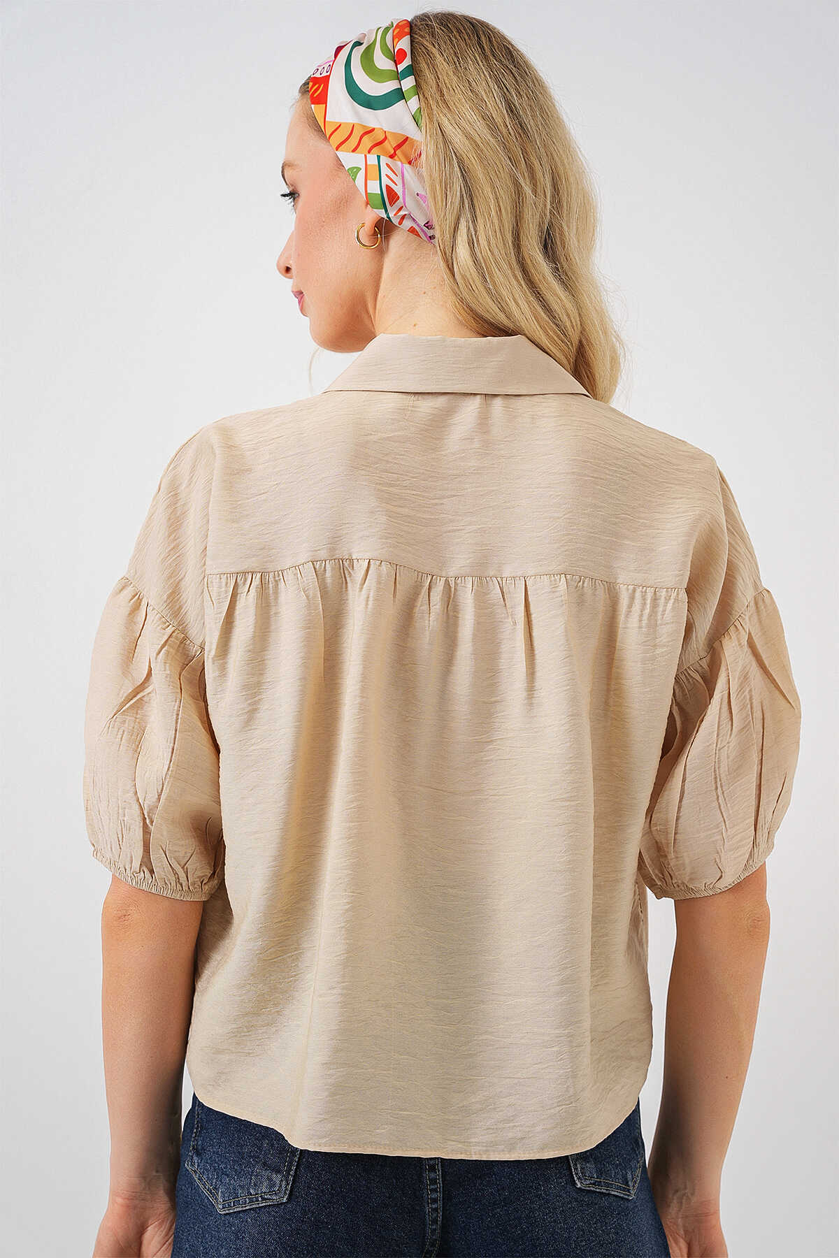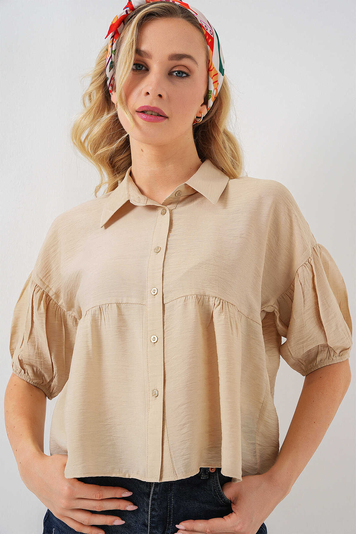 Kadın Kısa Kol Crop Gömlek 20335 - Bej - Kombin