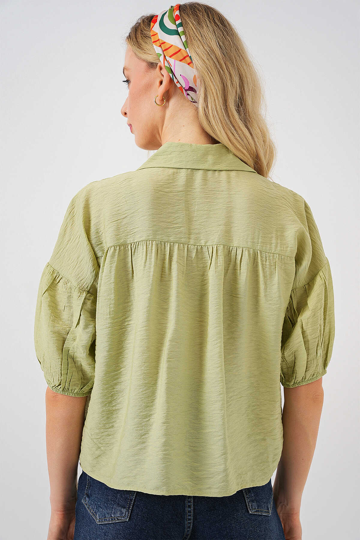 Kadın Kısa Kol Crop Gömlek 20335 - E.Yeşil