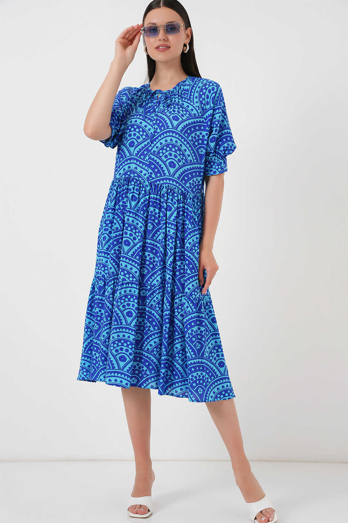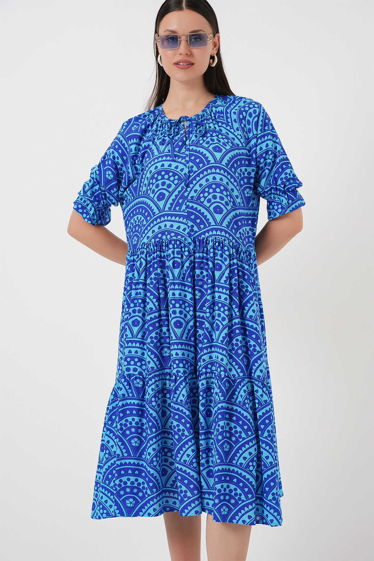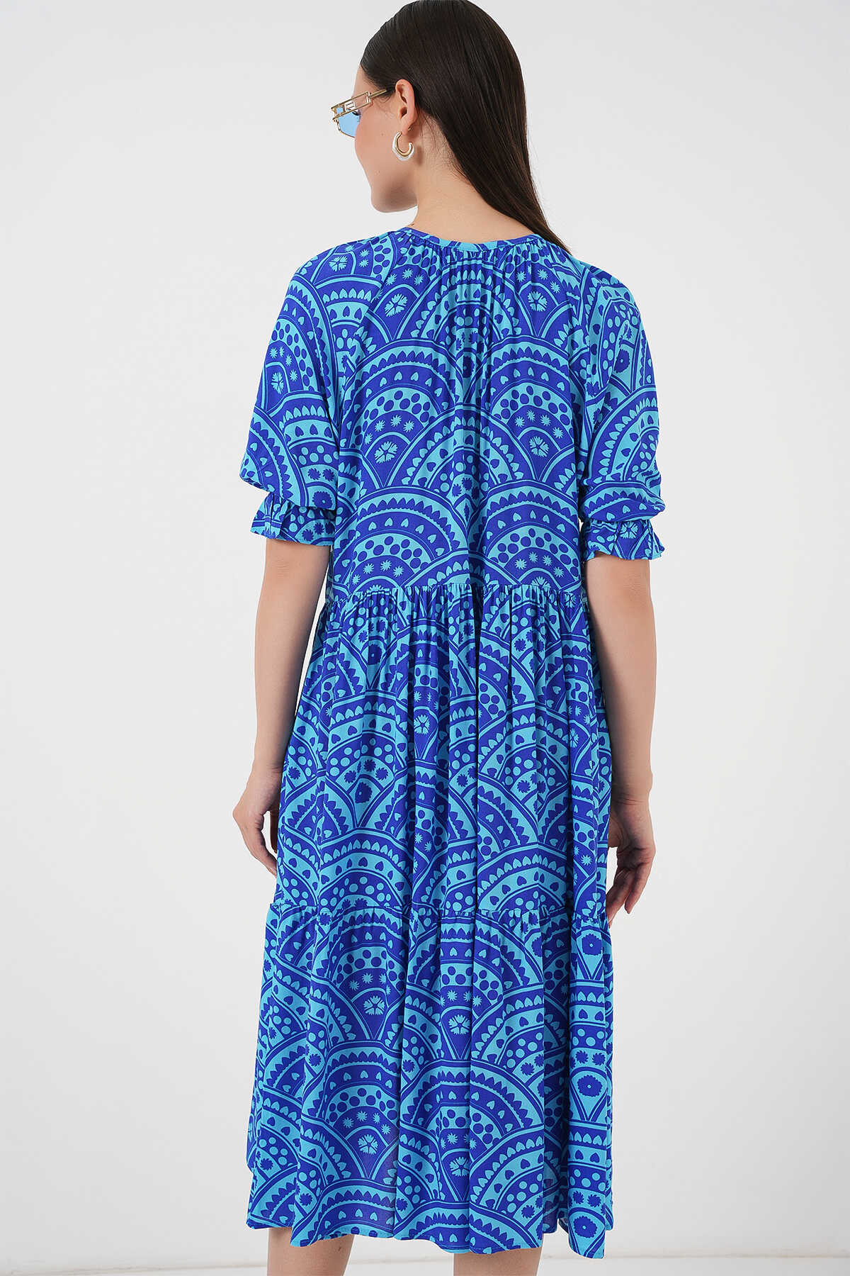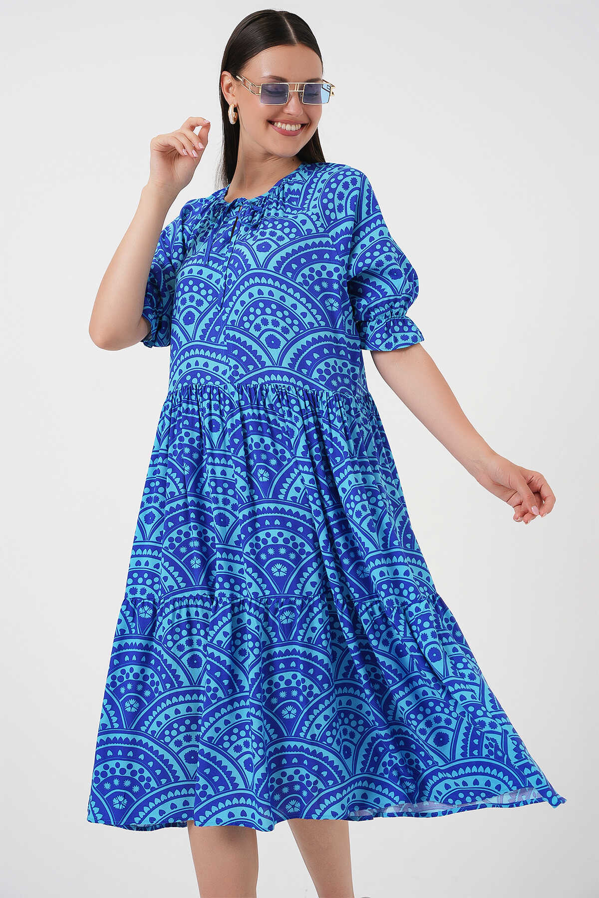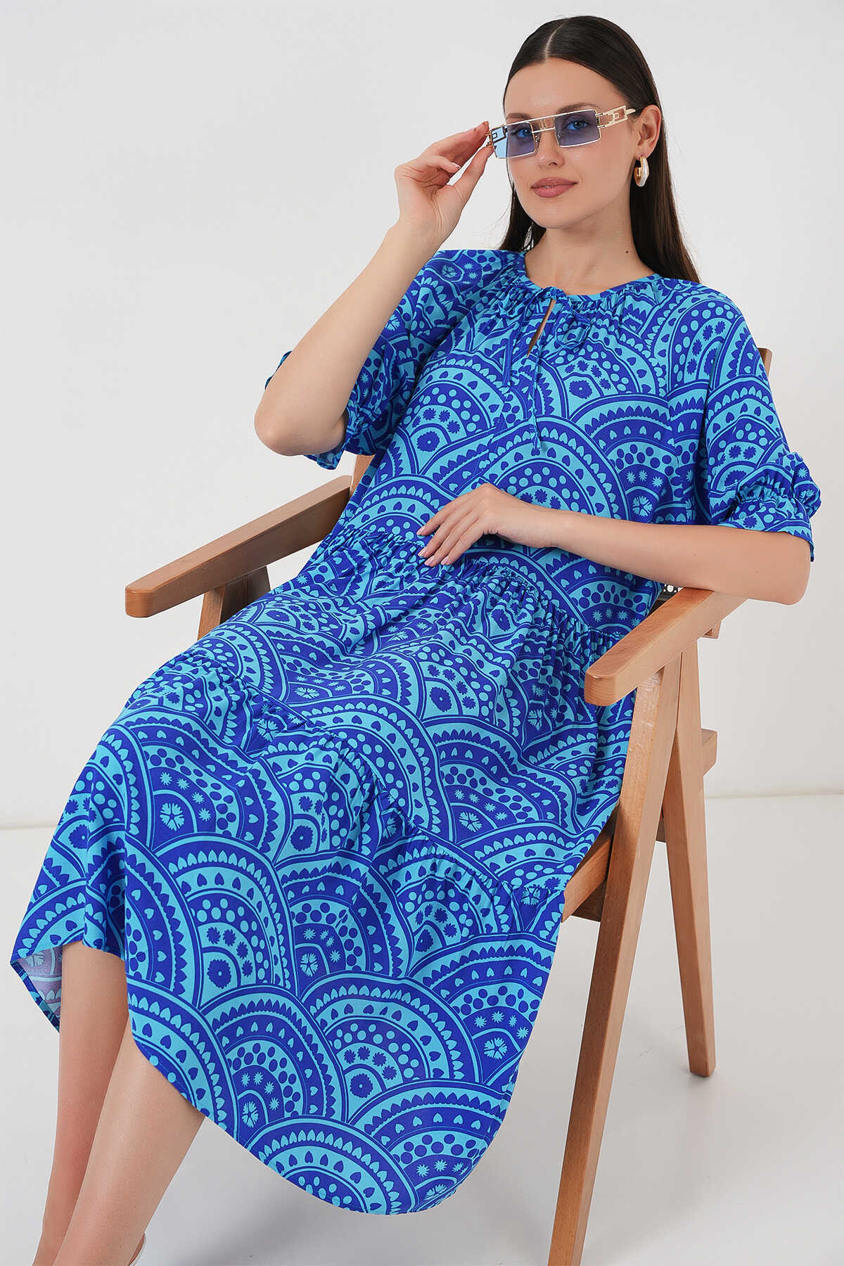 Kadın Kısa Kol Desenli Elbise 2553 - Saks - Kombin