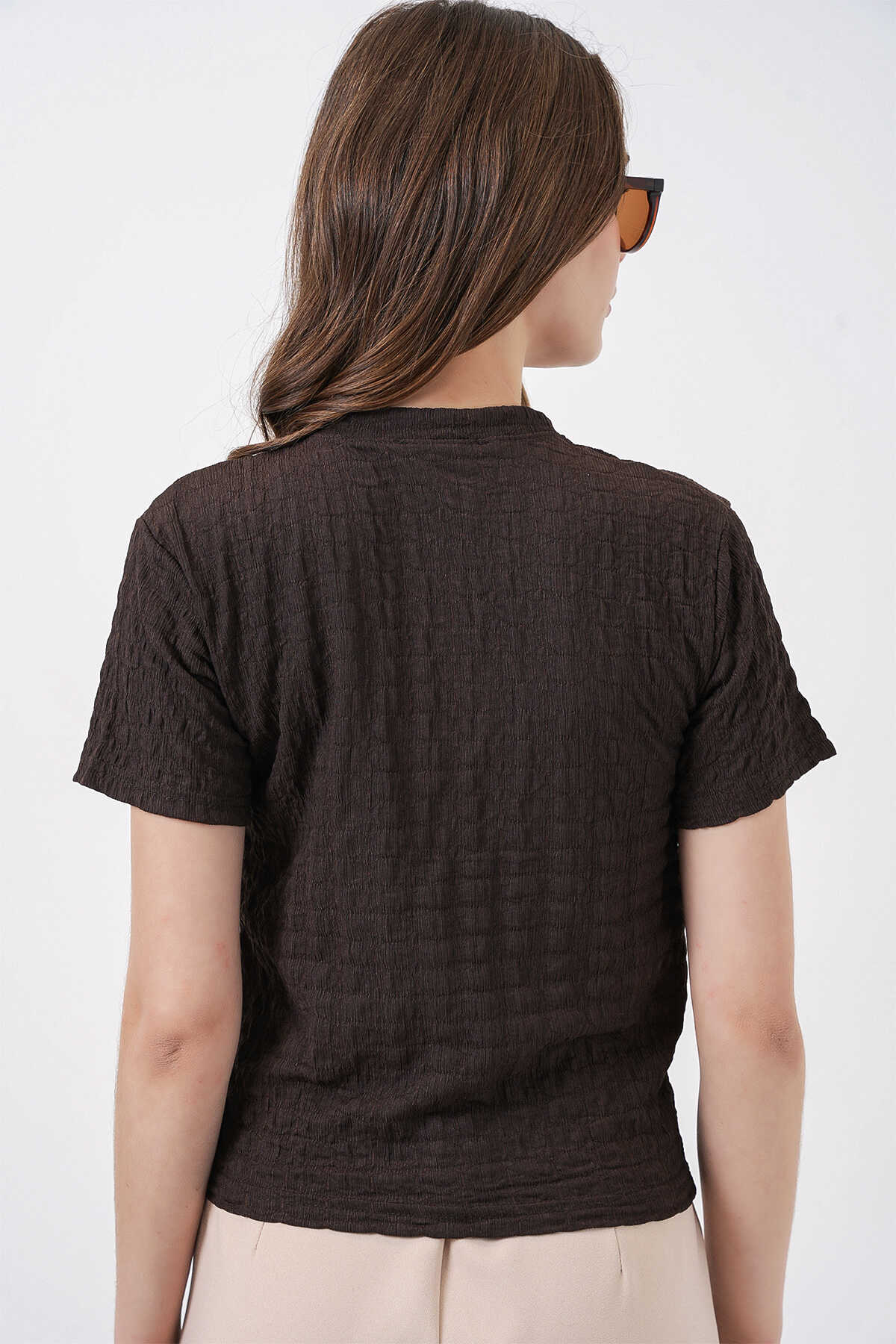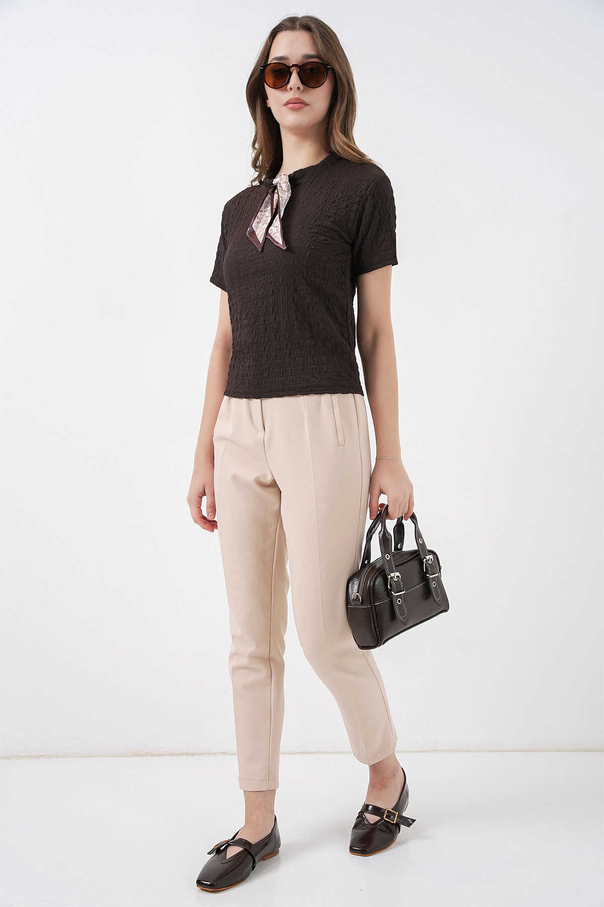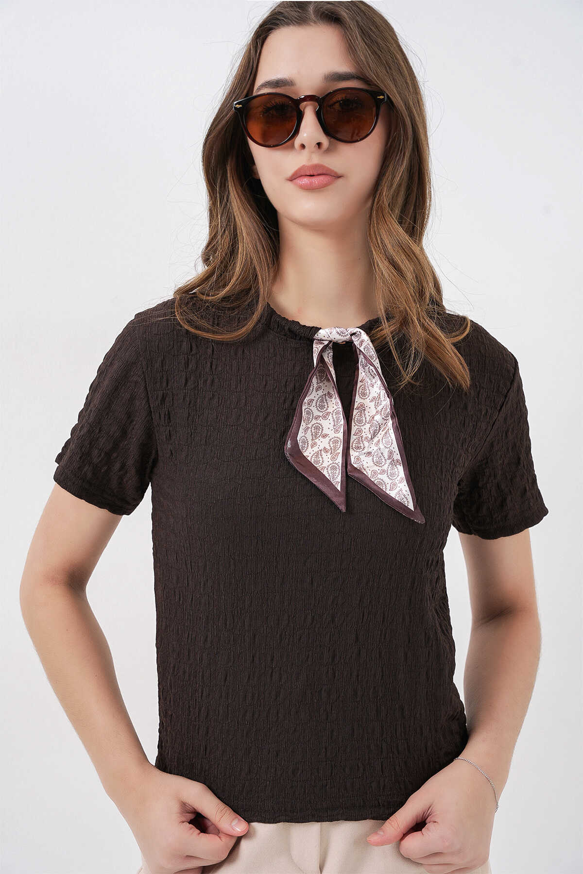 Kadin Kisa Kol Fularli Örme Bluz 981
