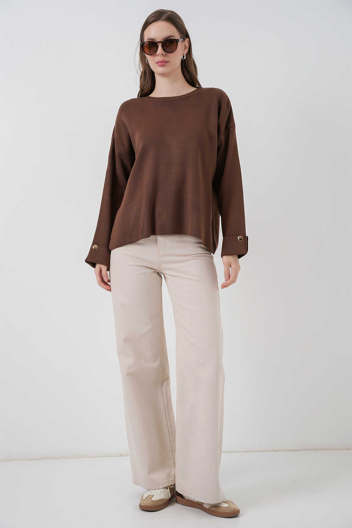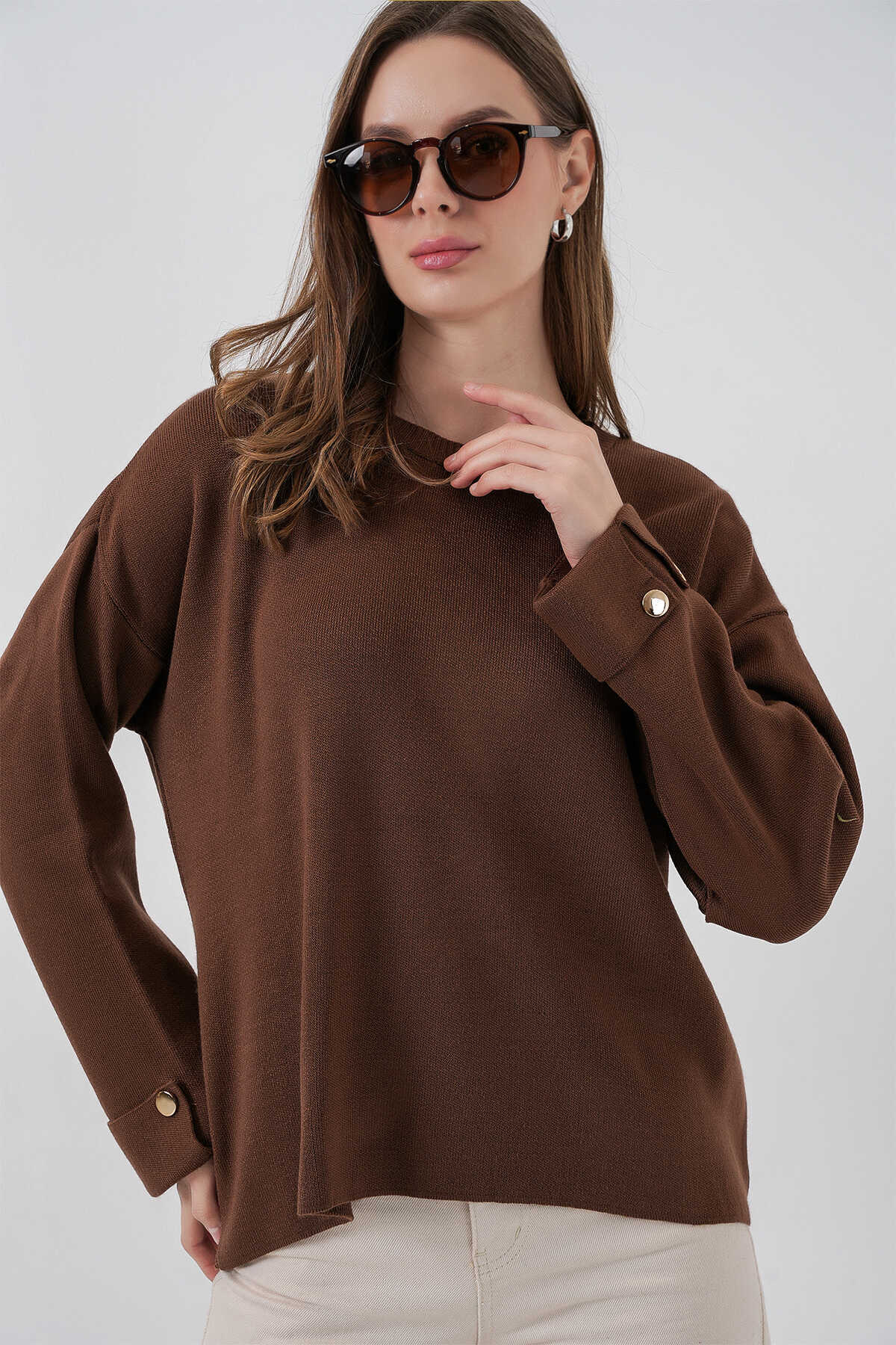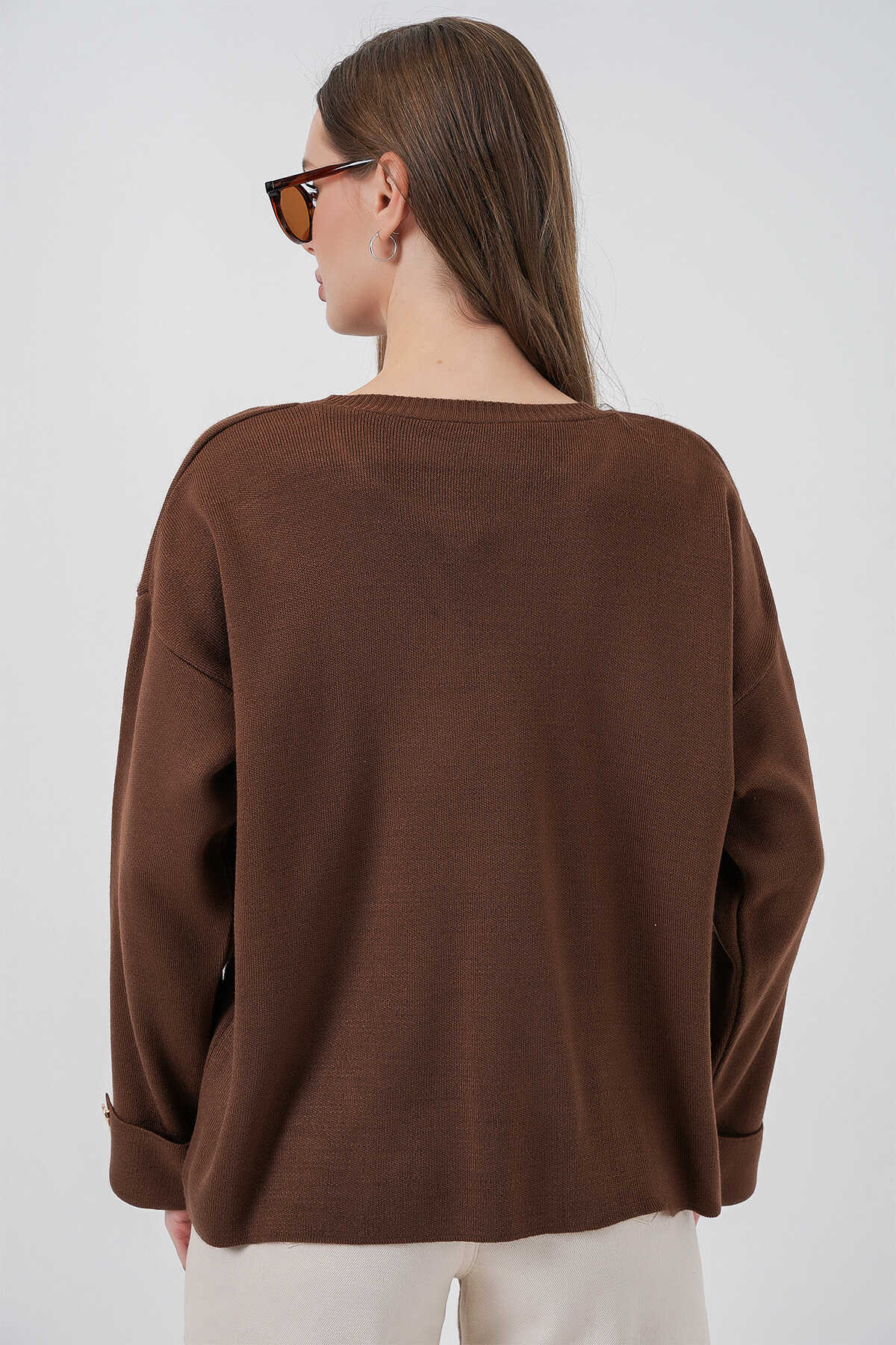 Kadın Kol Düğmeli Oversize Triko Kazak 15981 - Kahverengi - Kombin
