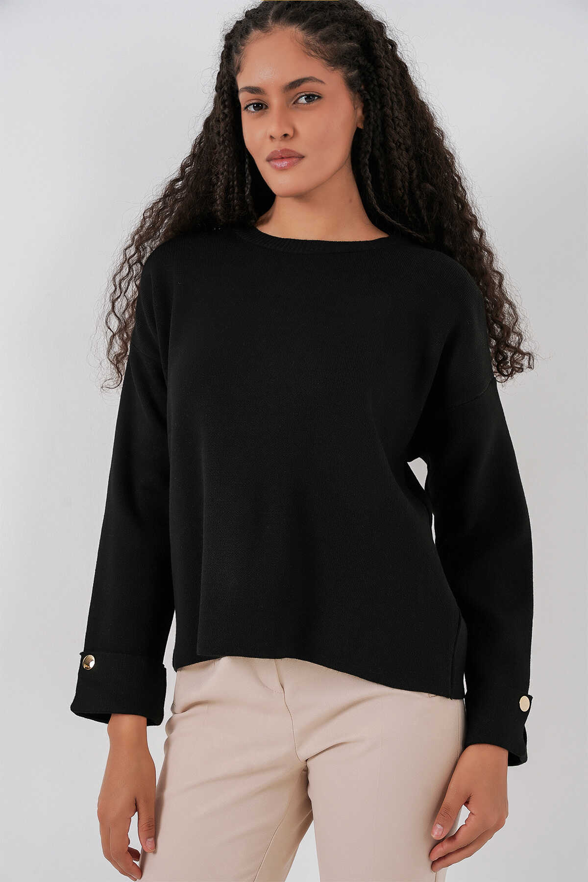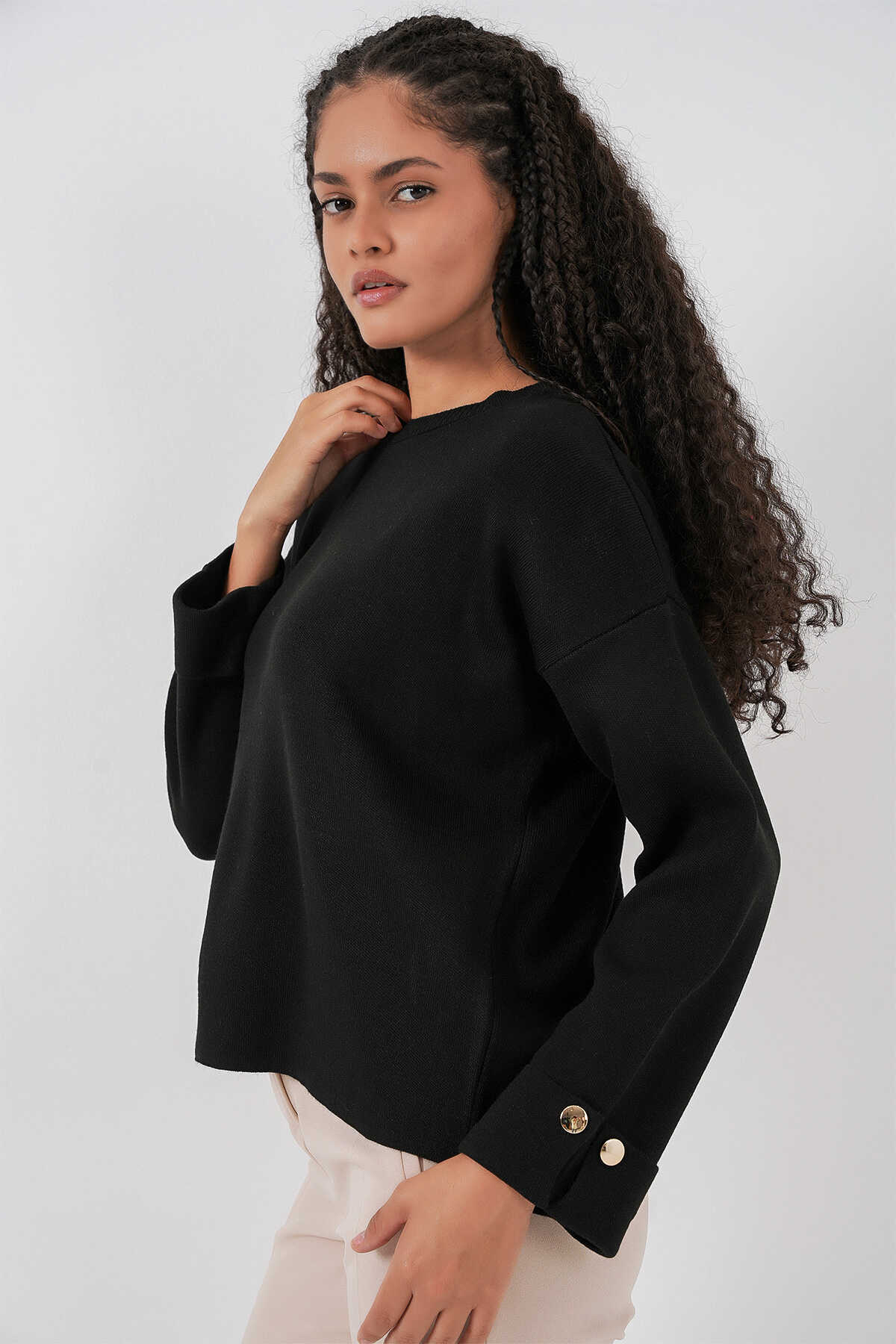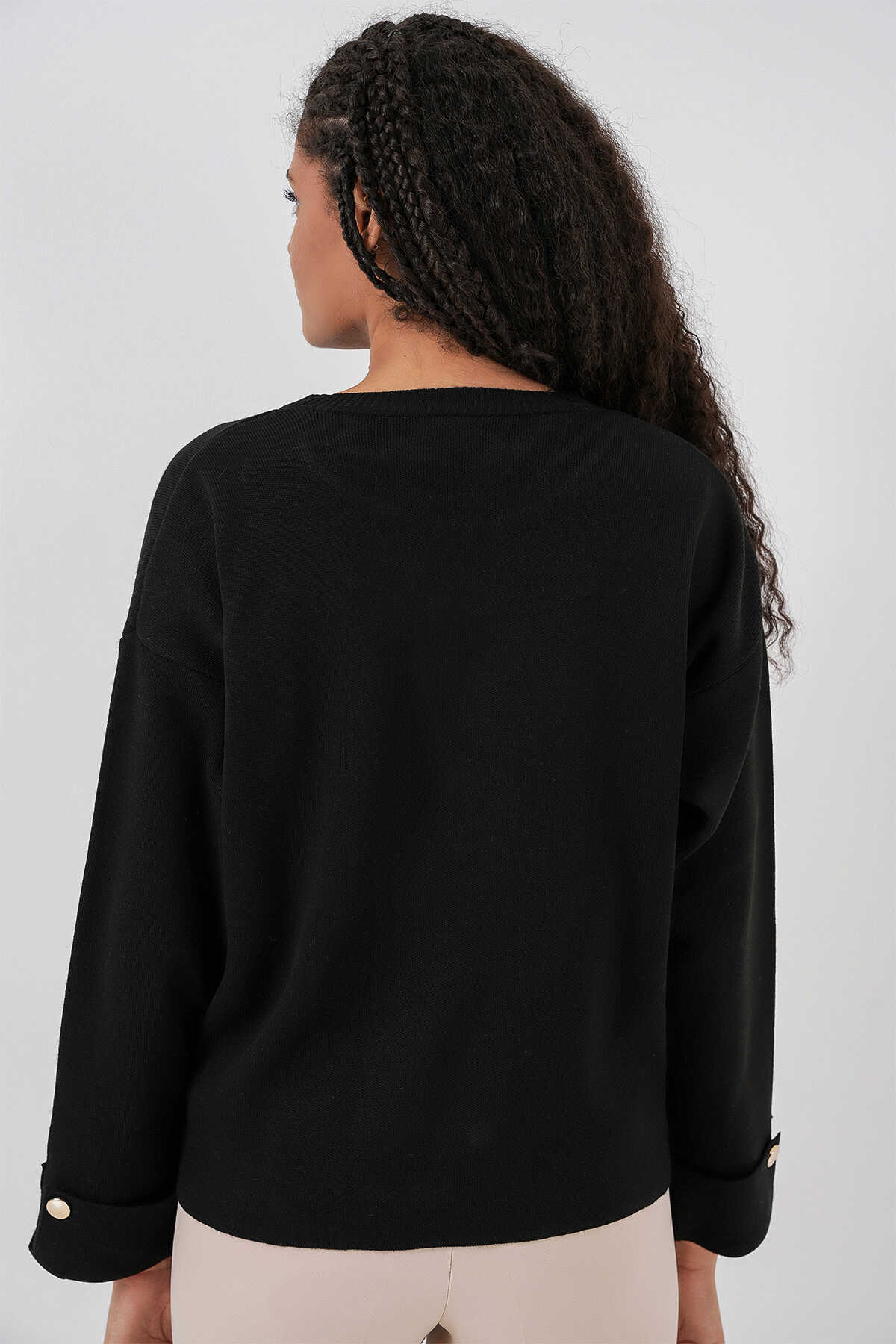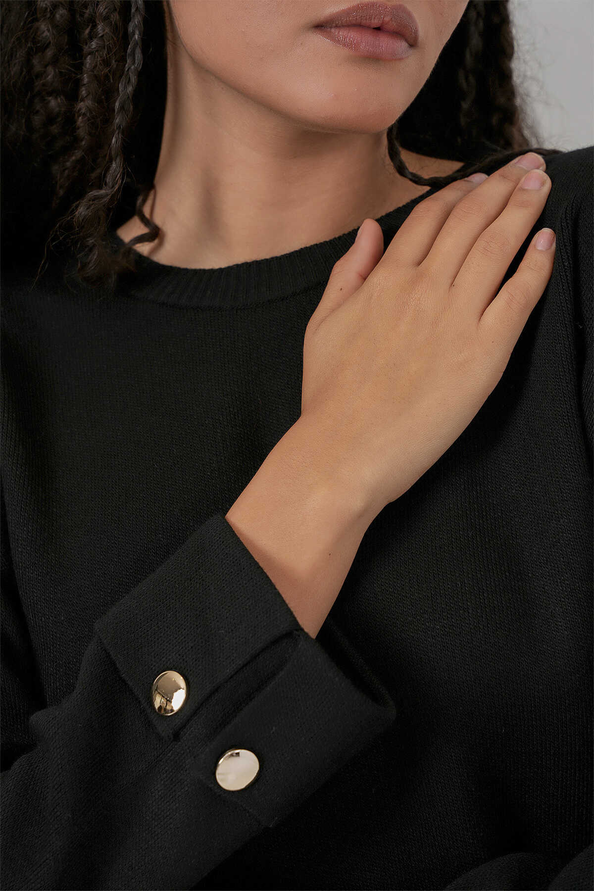 Kadın Kol Düğmeli Oversize Triko Kazak 15981 - Siyah - Kombin