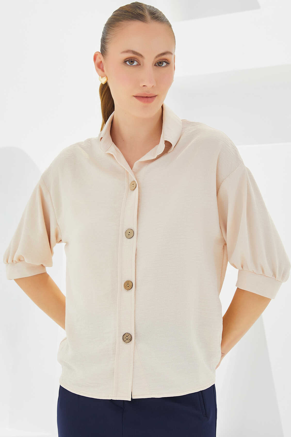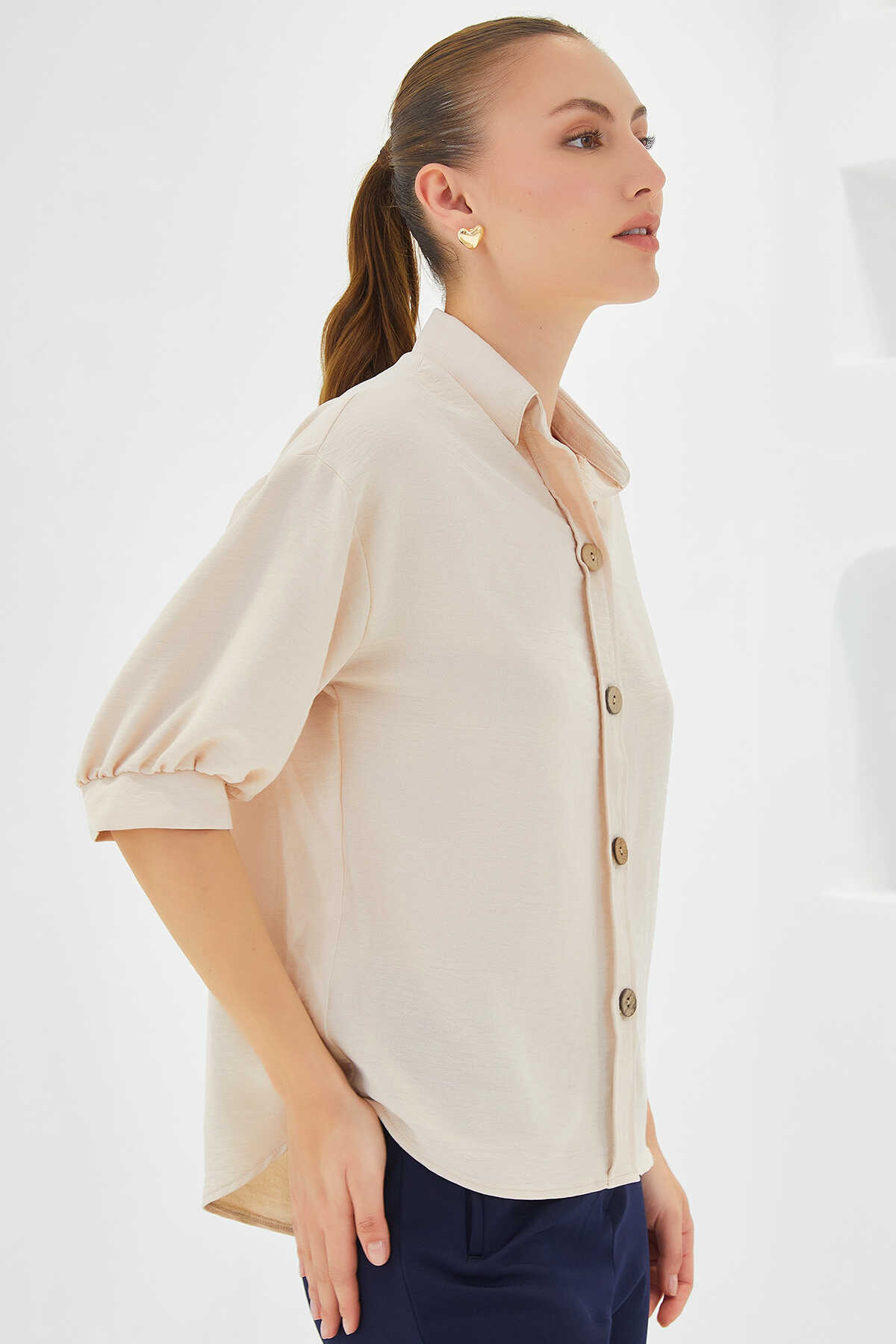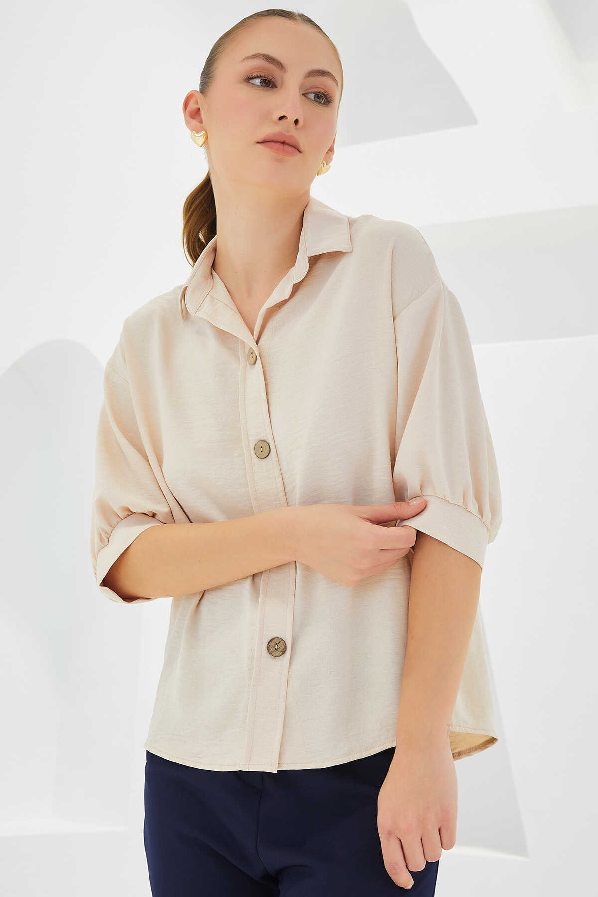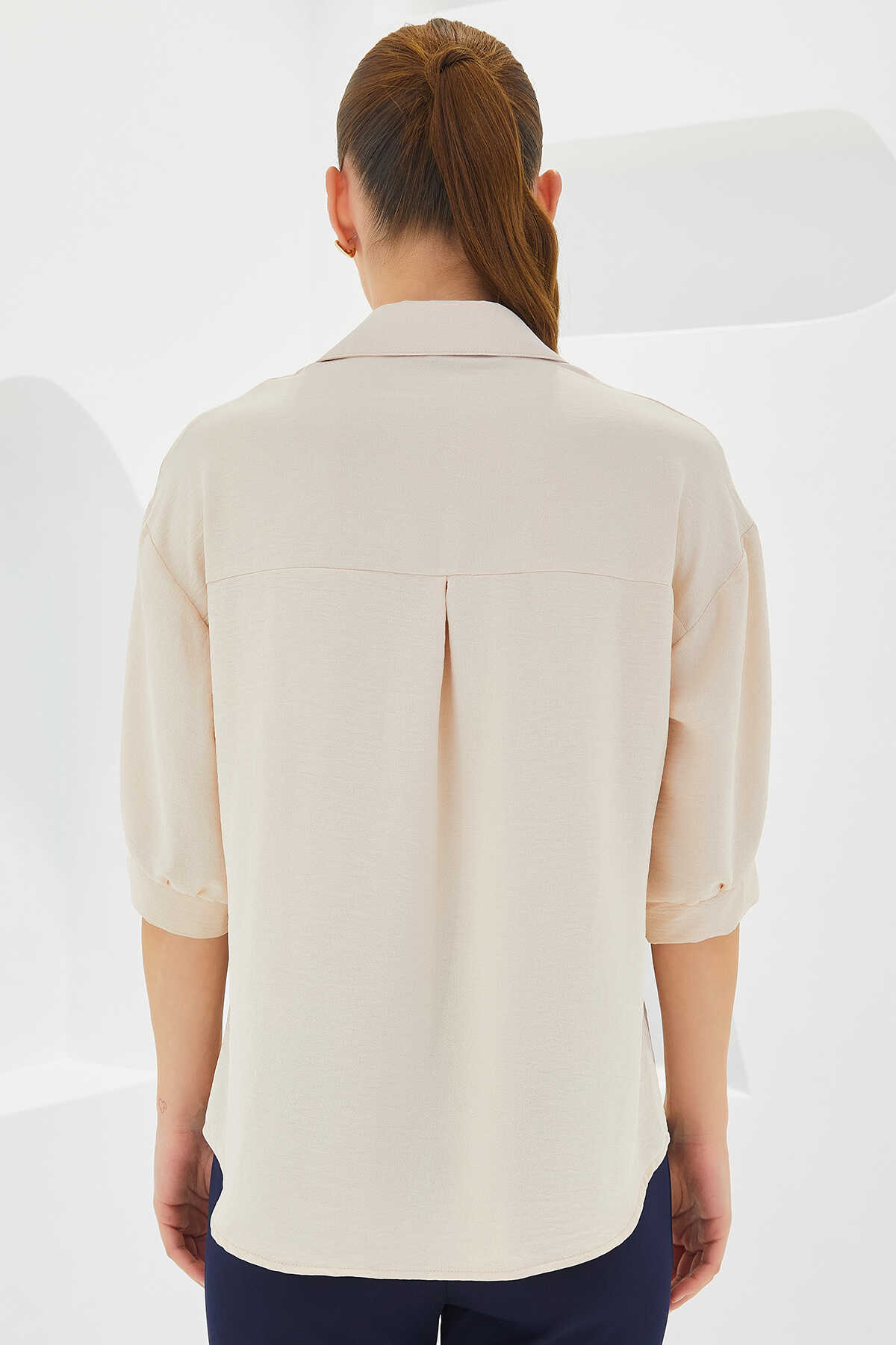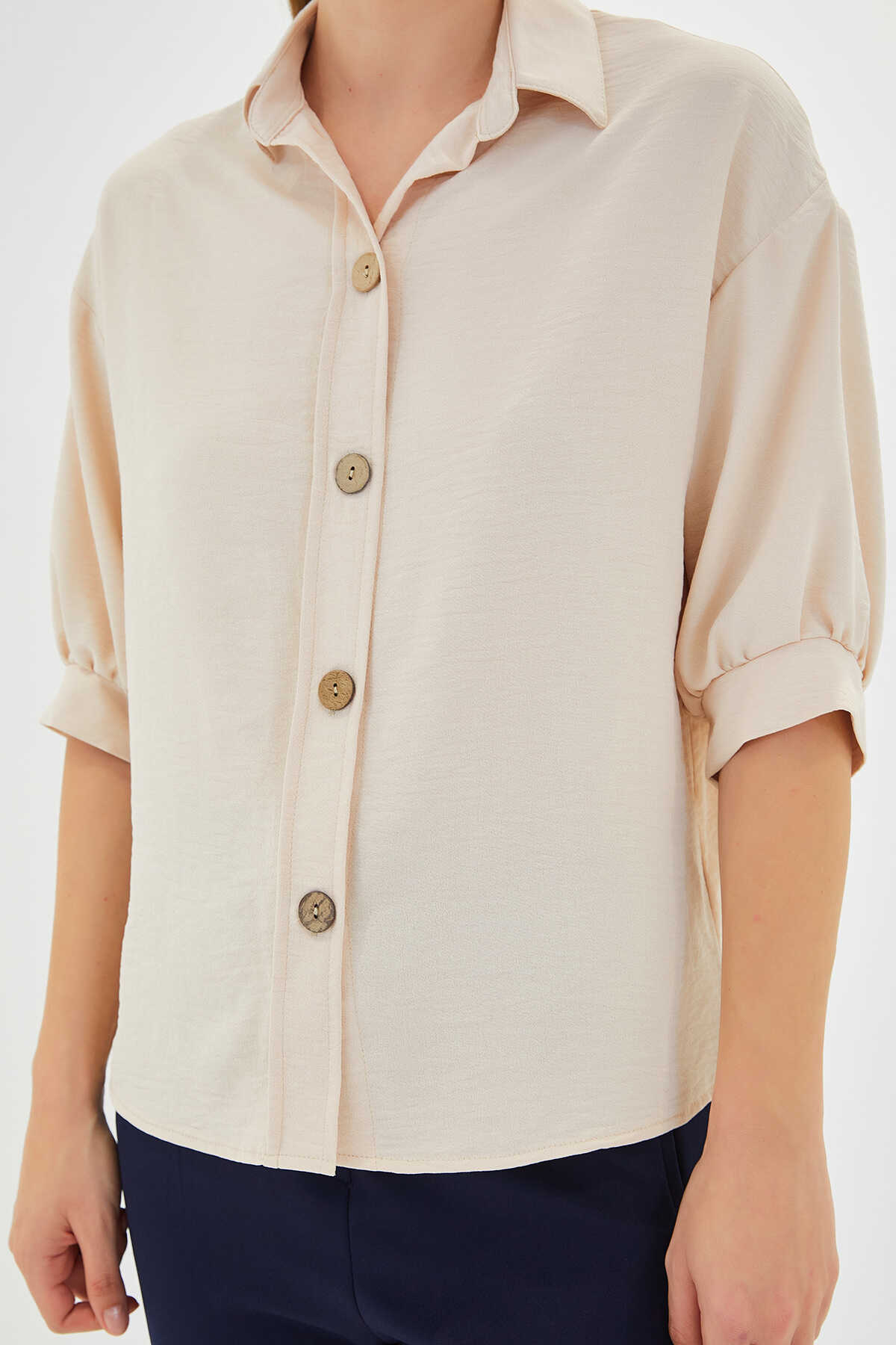 Kadın Krem Kısa Kol Oversize Keten Gömlek 20240 - Kombin