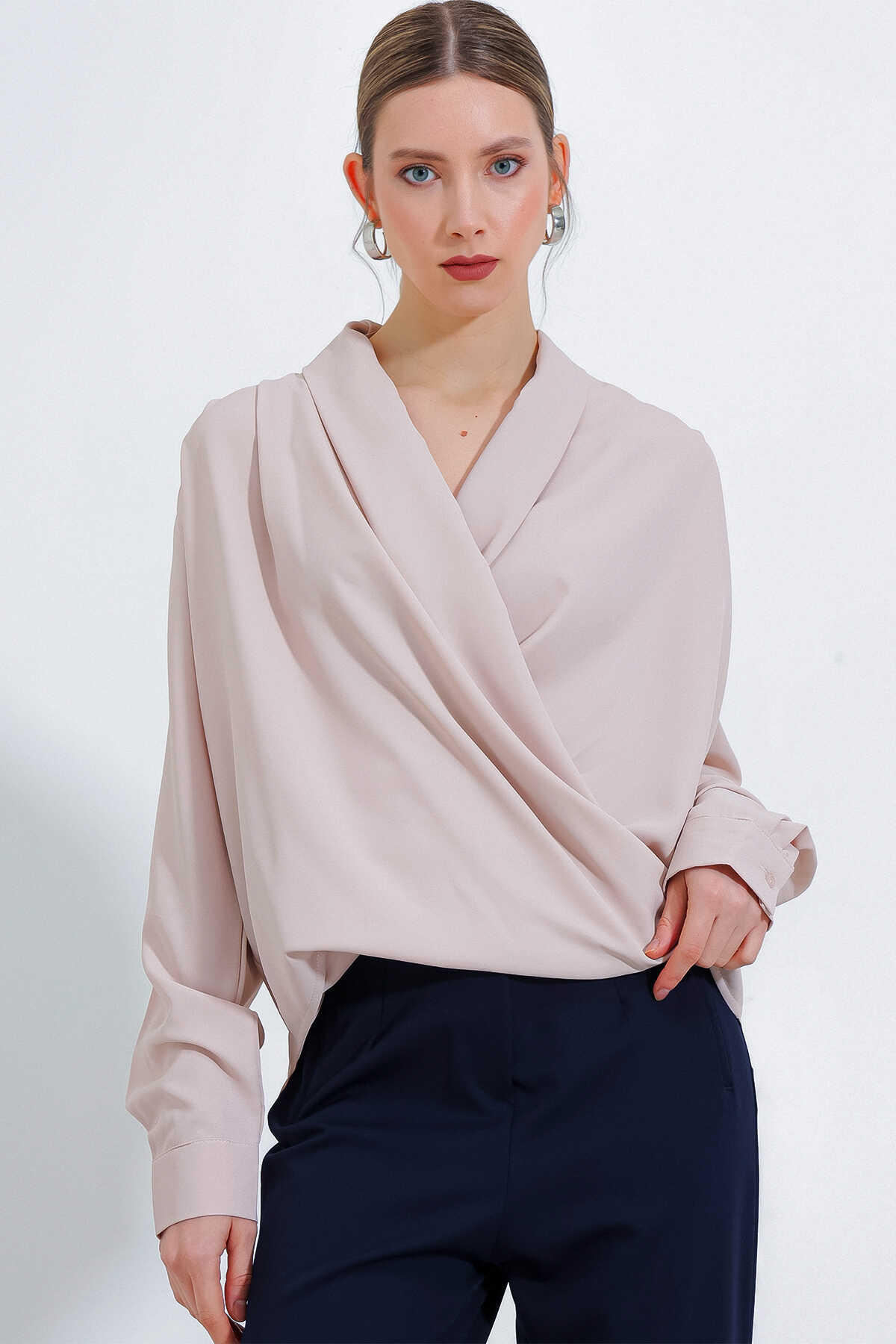 Kadın Krem Kruvaze Yaka Dökümlü Saten Bluz 0492 - Kombin