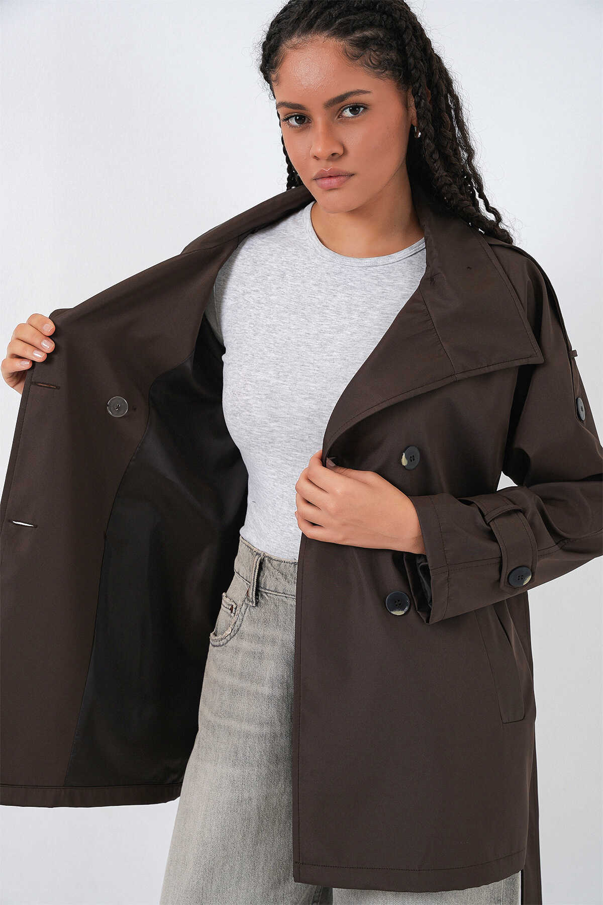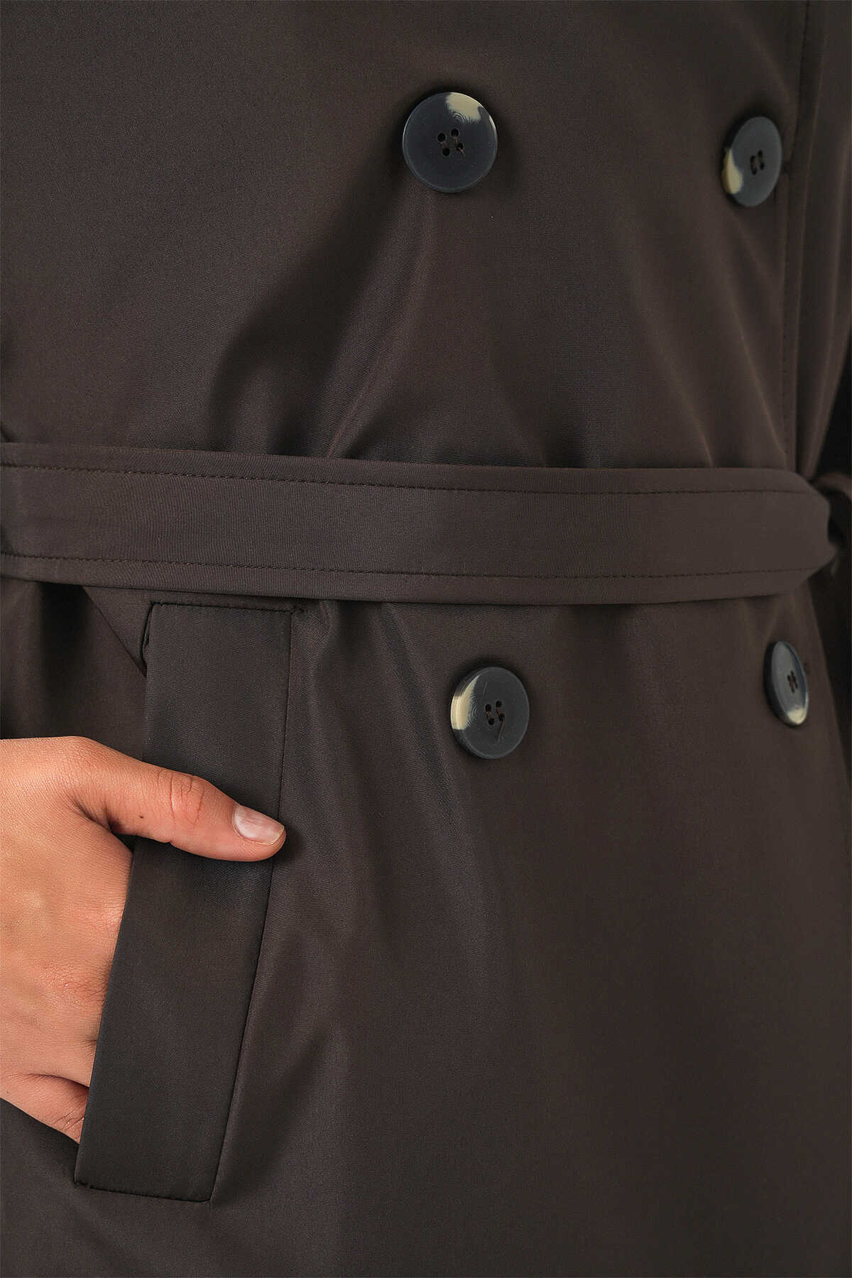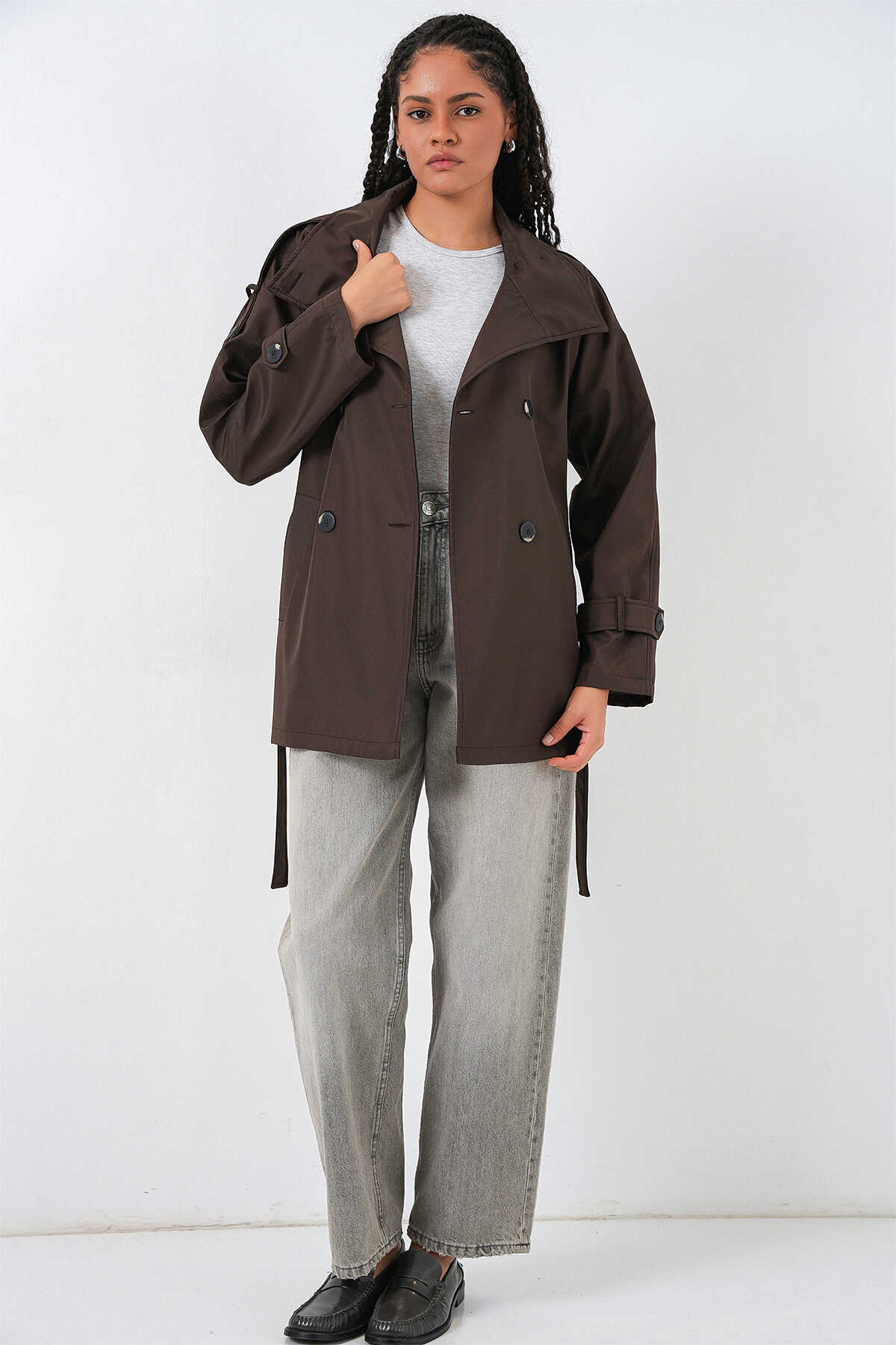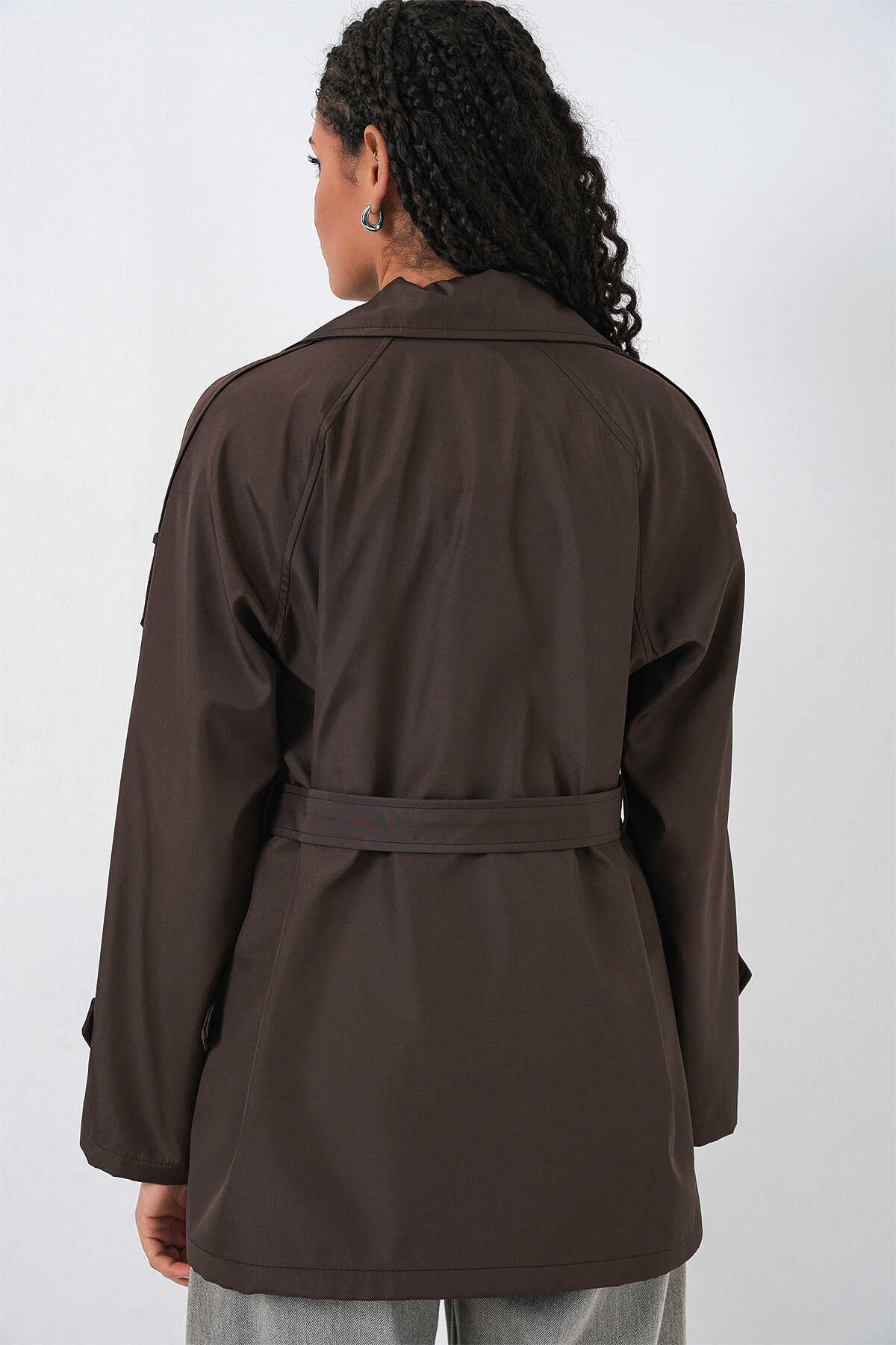Kadın Kruvaze Yaka Kısa Trençkot 5980 - Kahverengi - Kombin