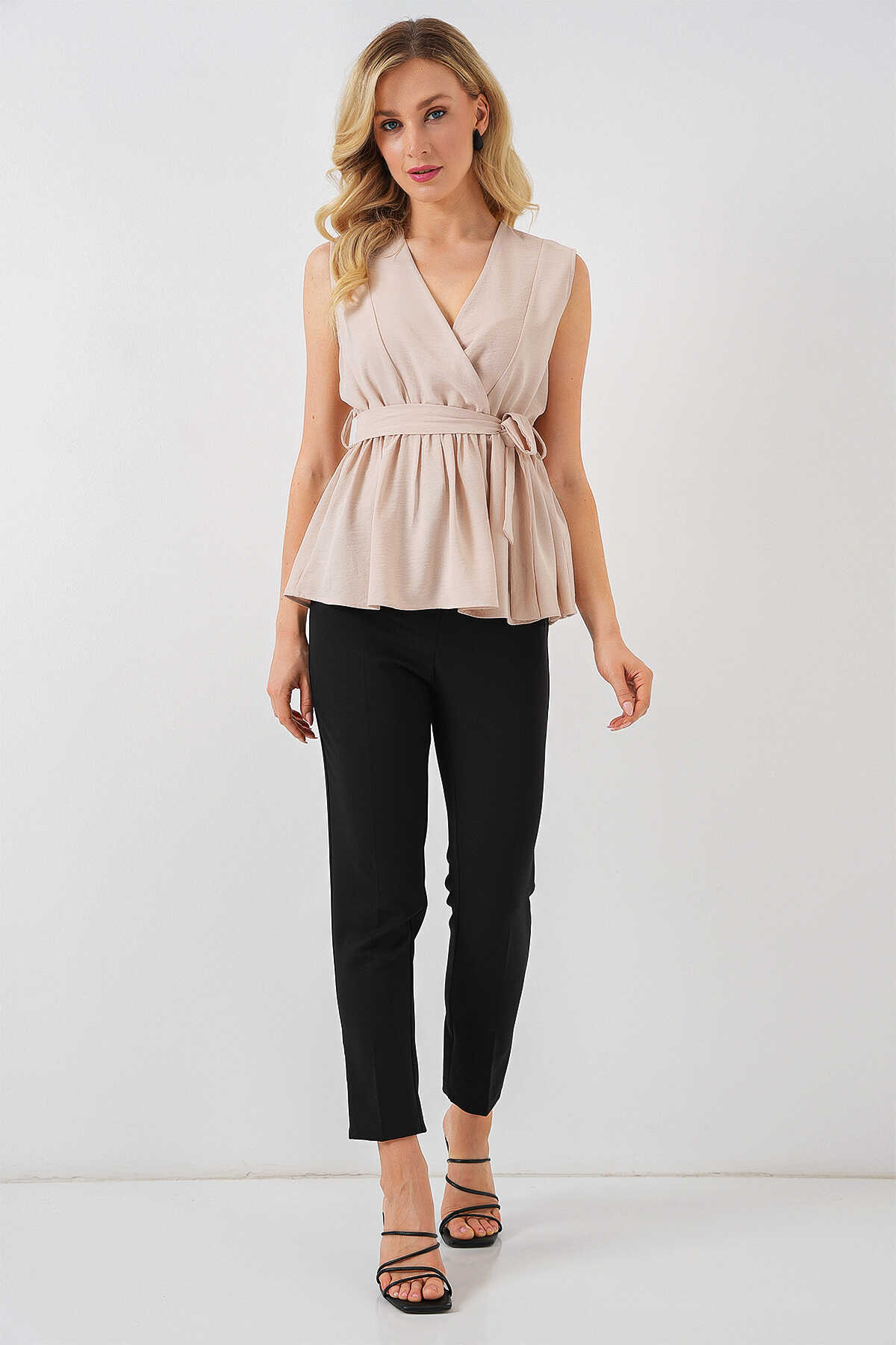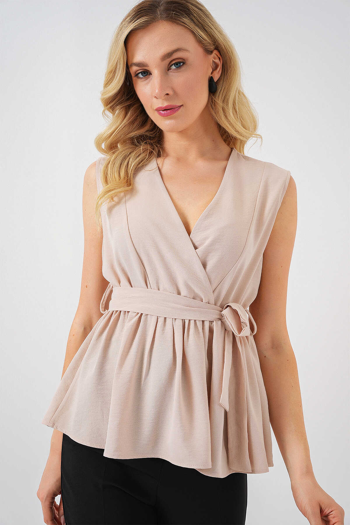 Kadın Kruvaze Yaka Kolsuz Bluz 966 - Krem - Kombin