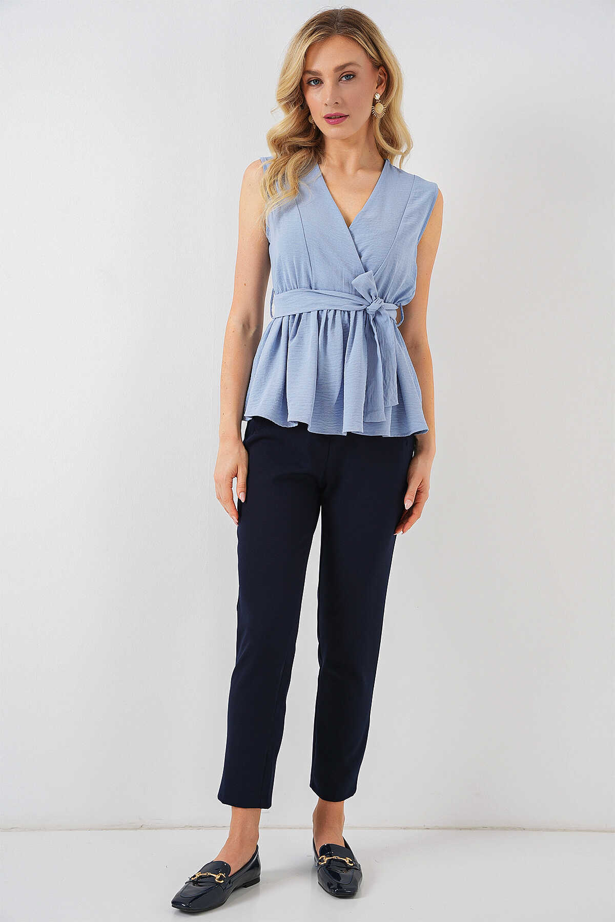 Kadın Kruvaze Yaka Kolsuz Bluz 966 - Mavi - Kombin