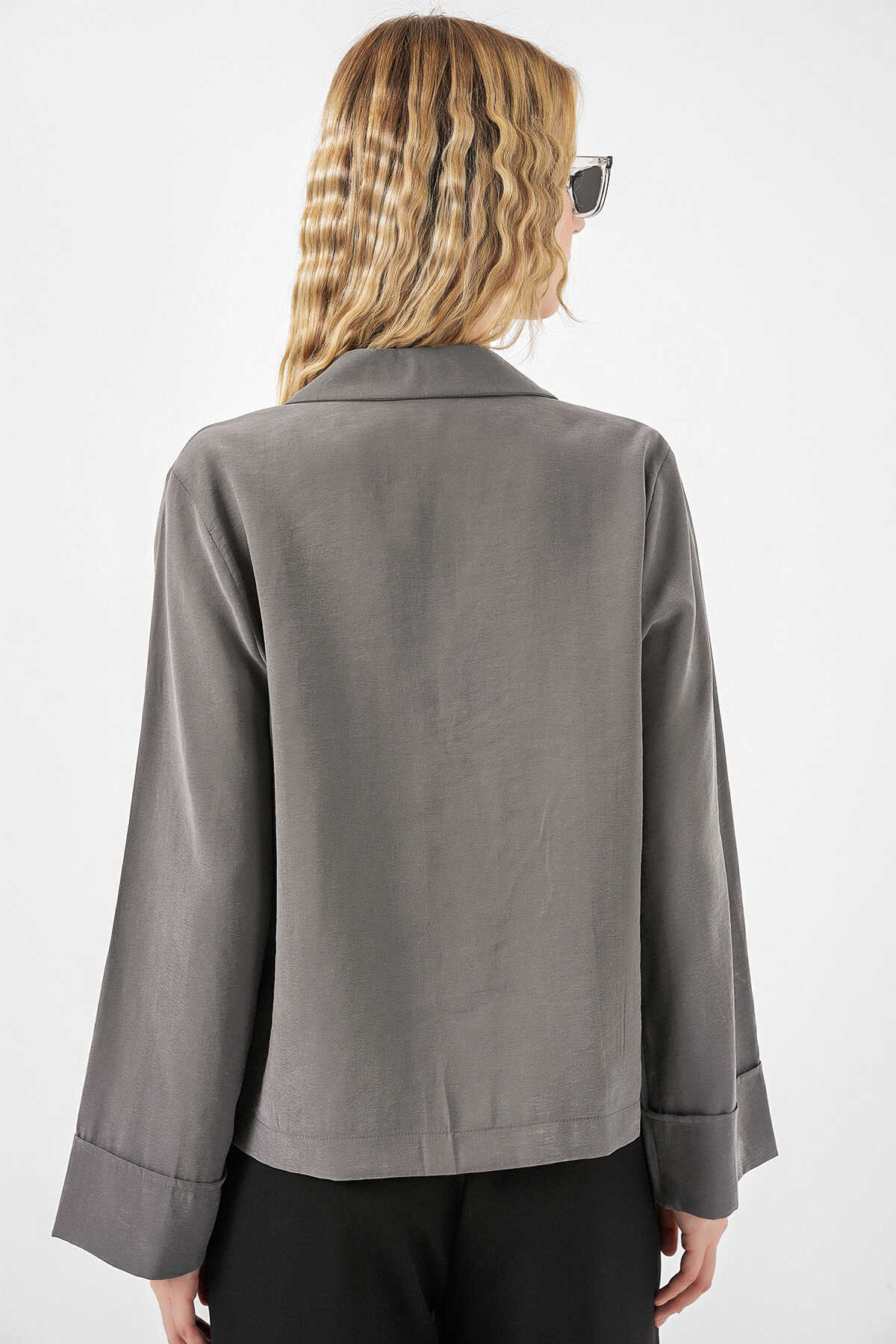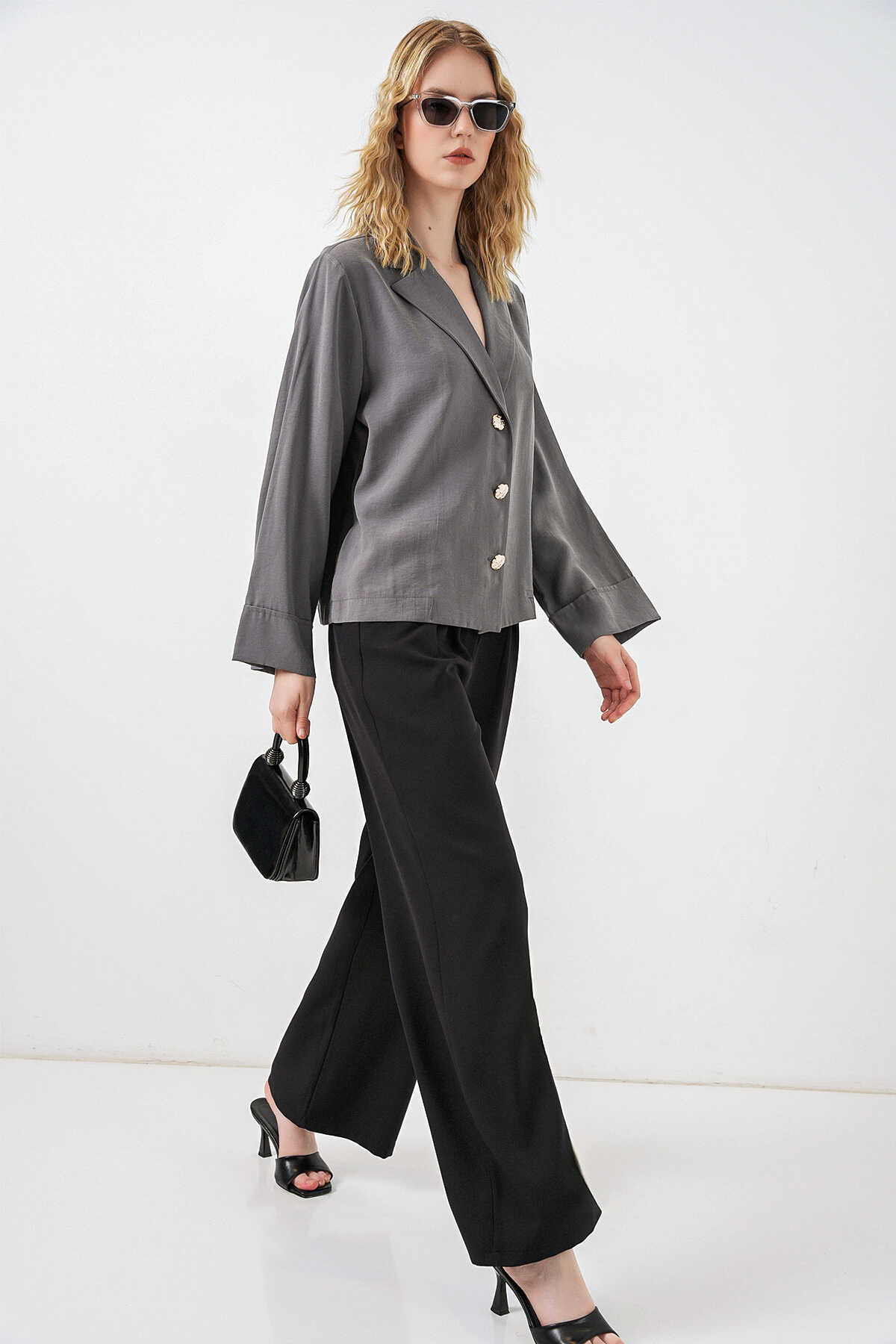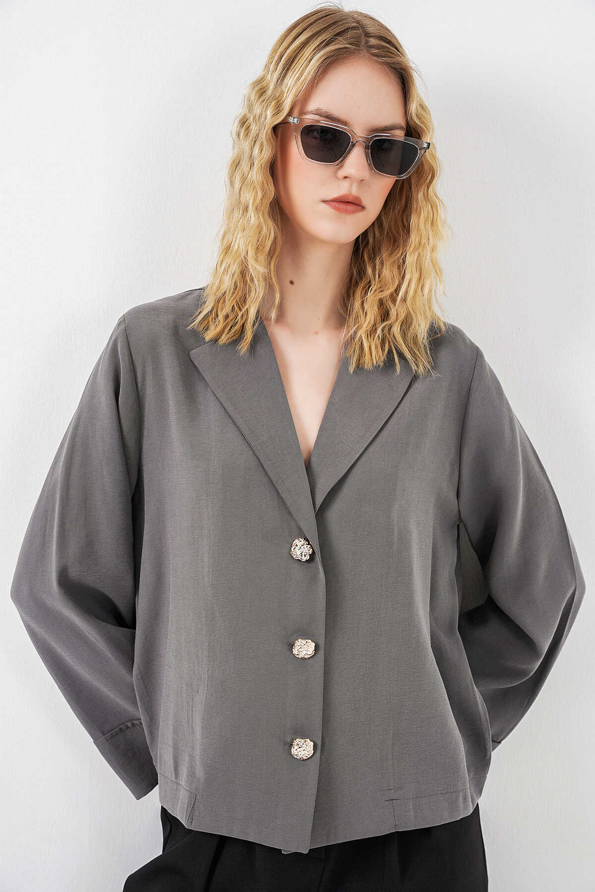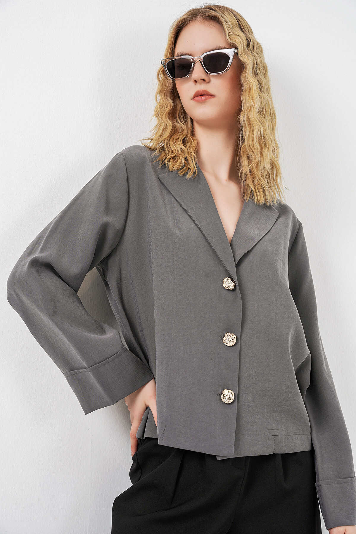 Kadın Kruvaze Yaka Oversize Ceket 0747 - Gri - Kombin