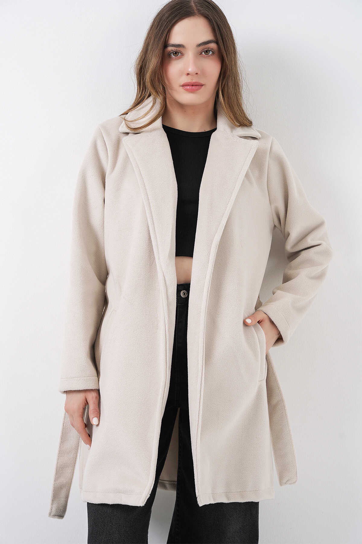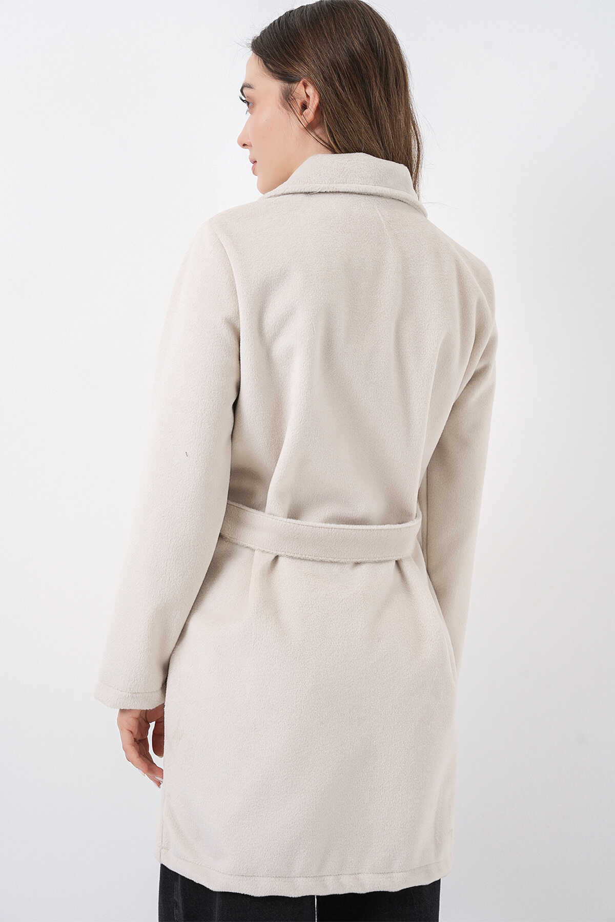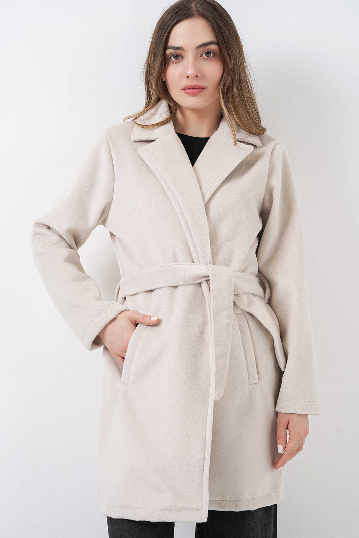 Kadın Kuşaklı Kaban 9171 - Ekru - Kombin
