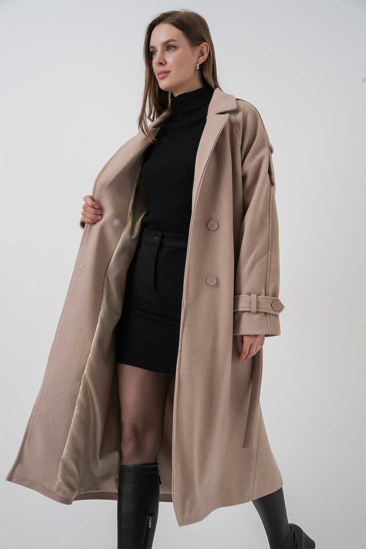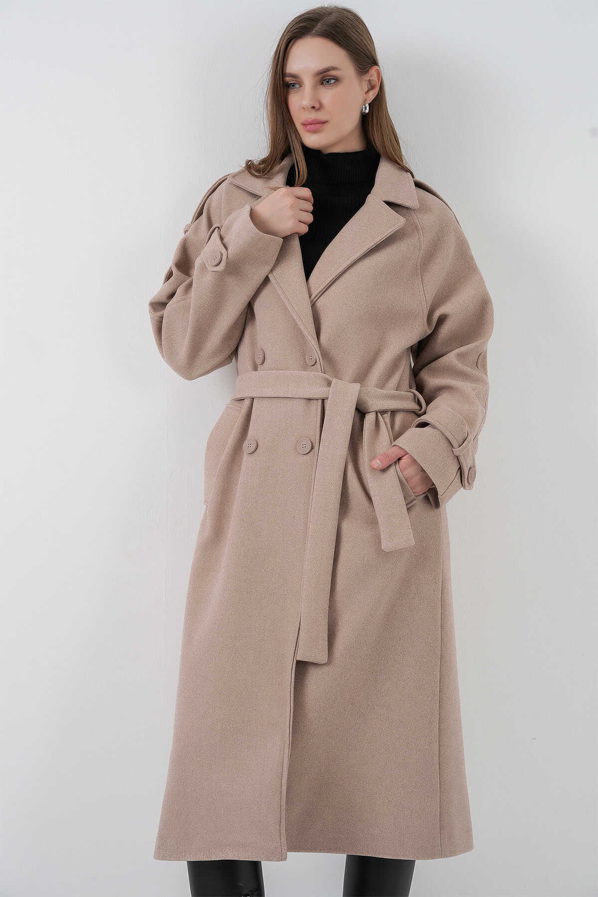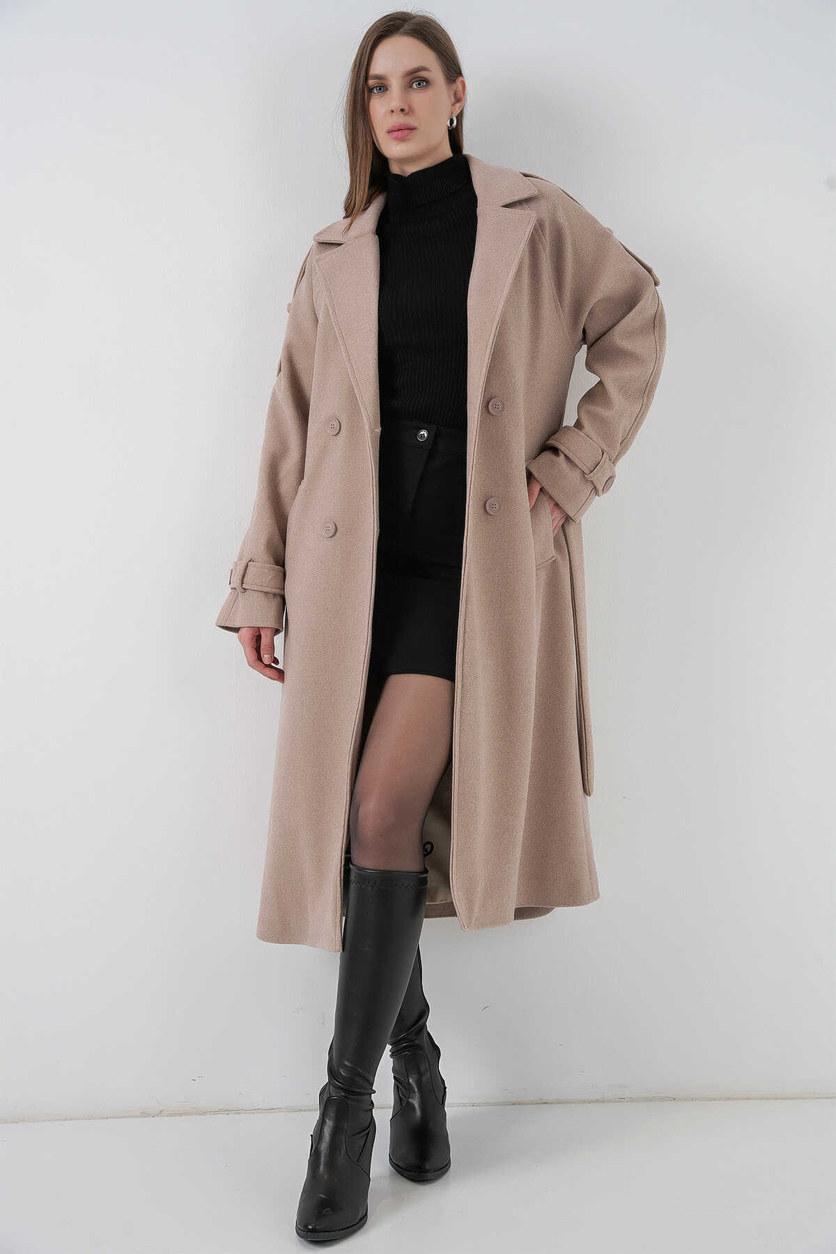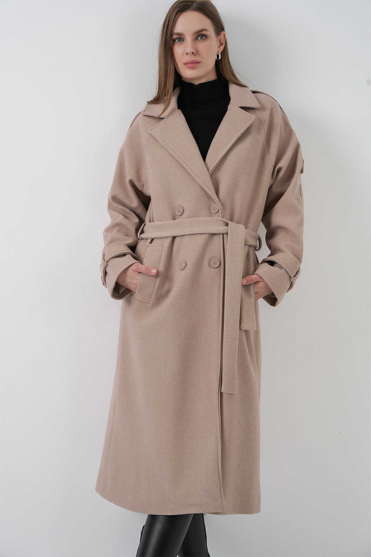 Kadın Kuşaklı Kaşe Kaban 9161 - Bej - Kombin