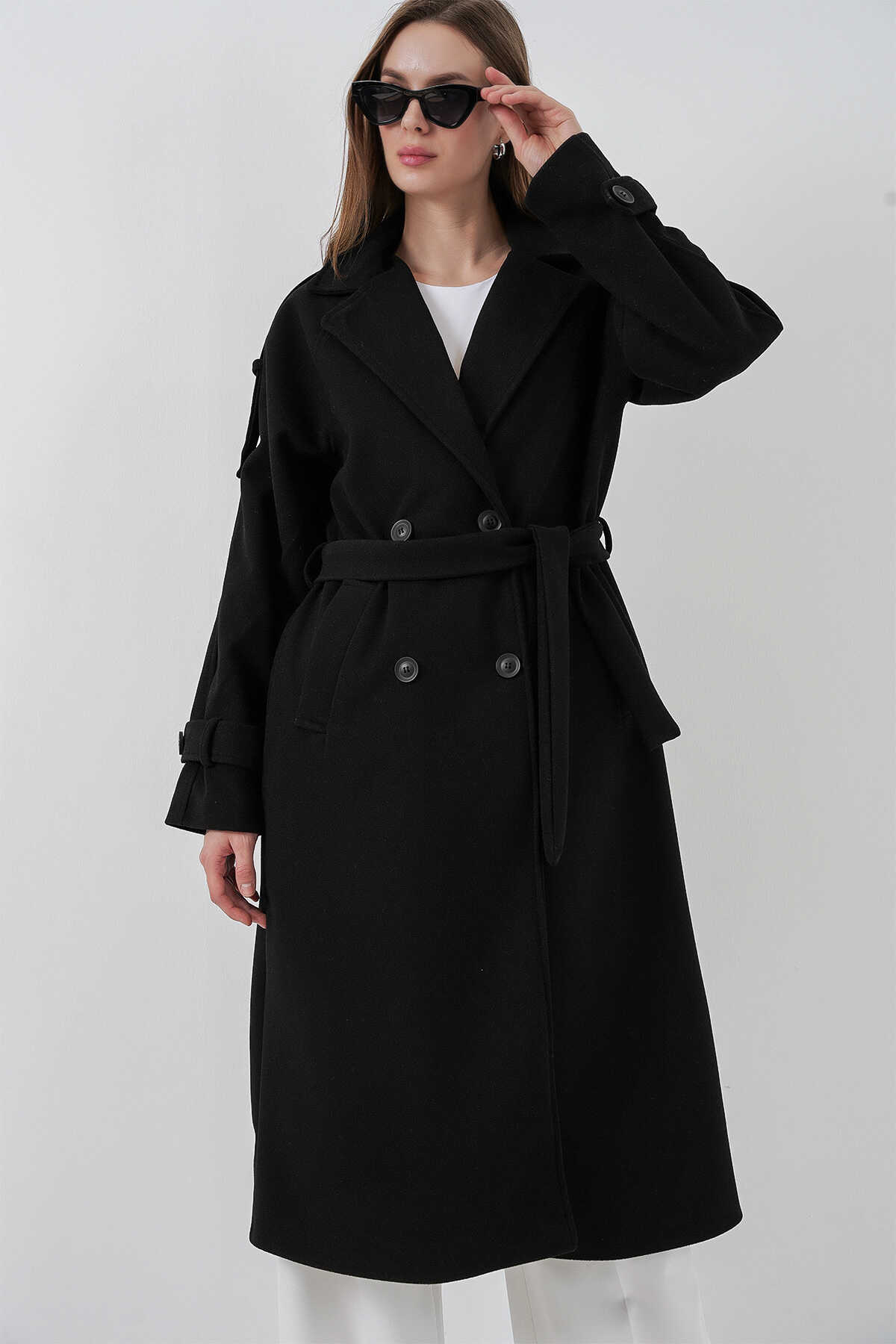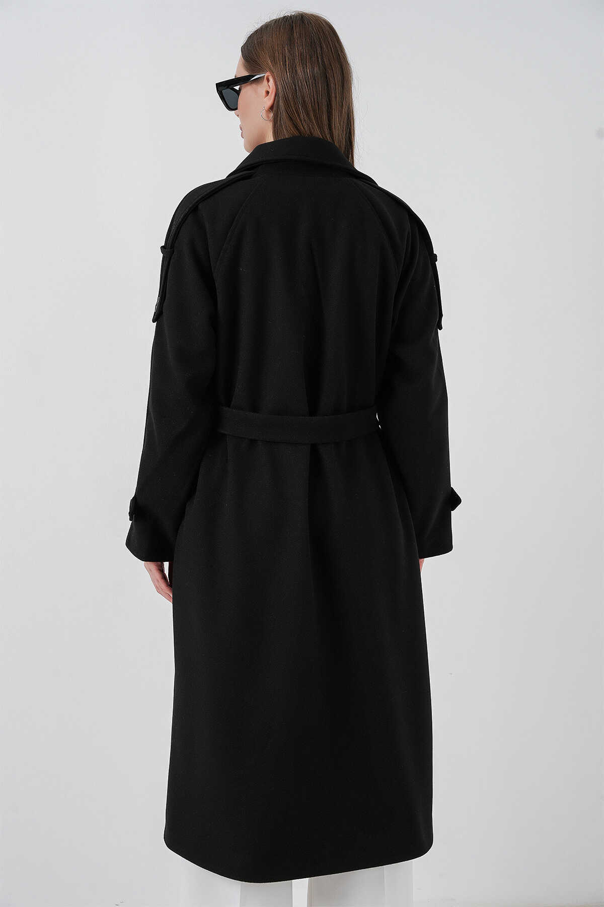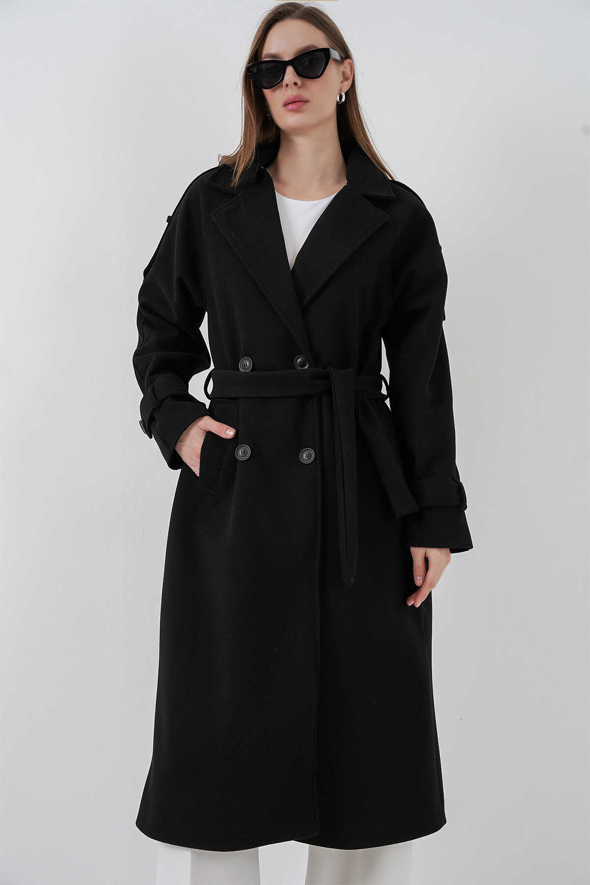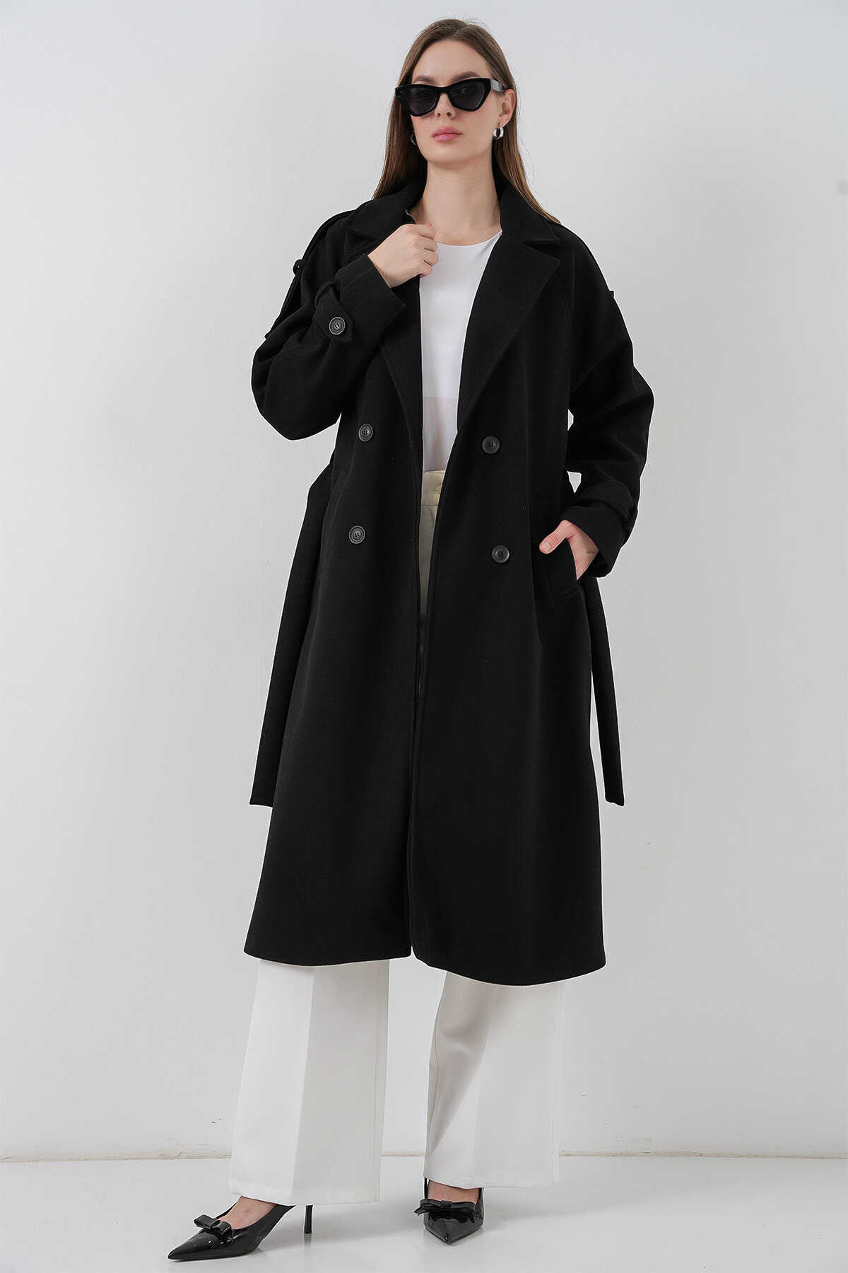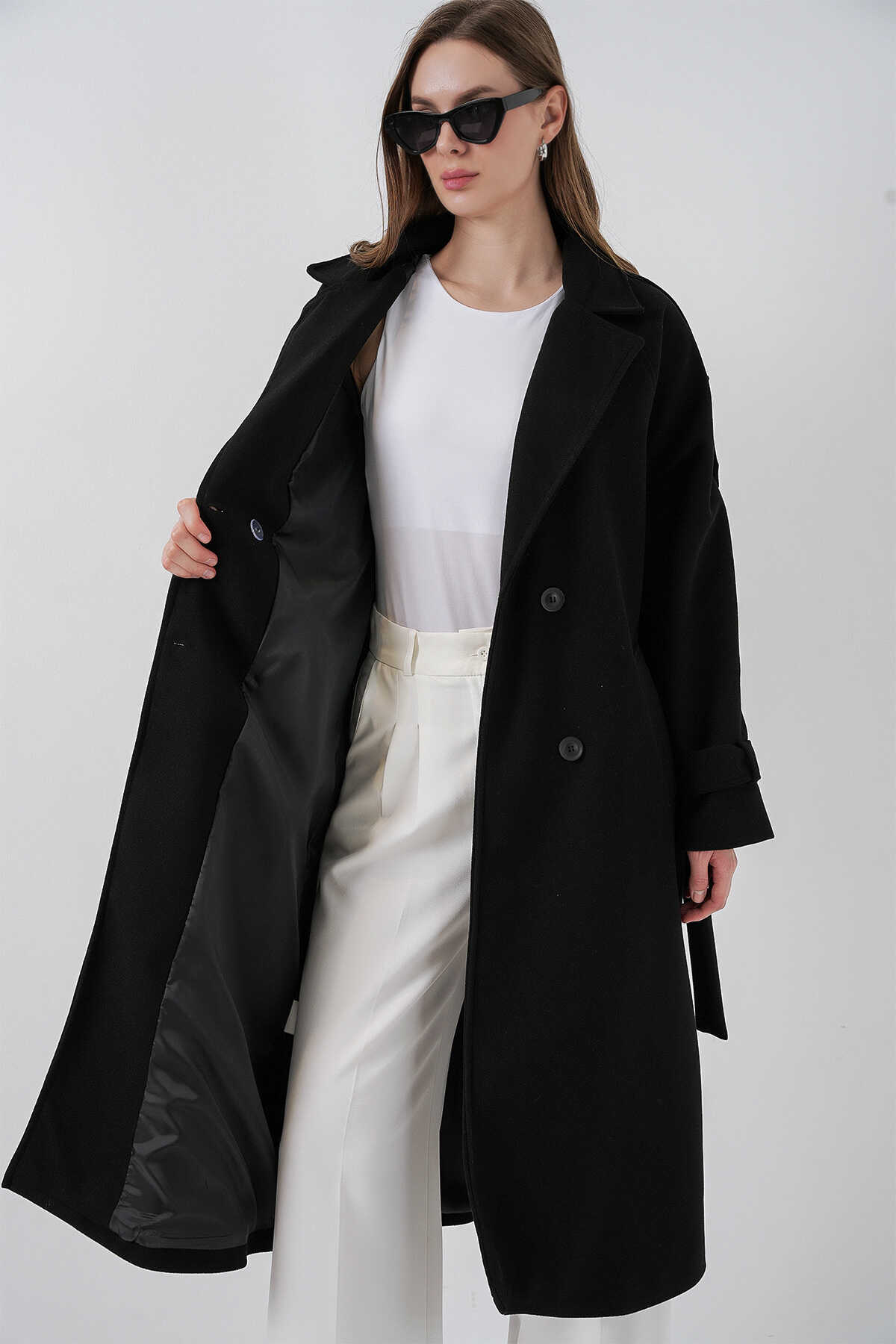 Kadın Kuşaklı Kaşe Kaban 9161 - Siyah - Kombin