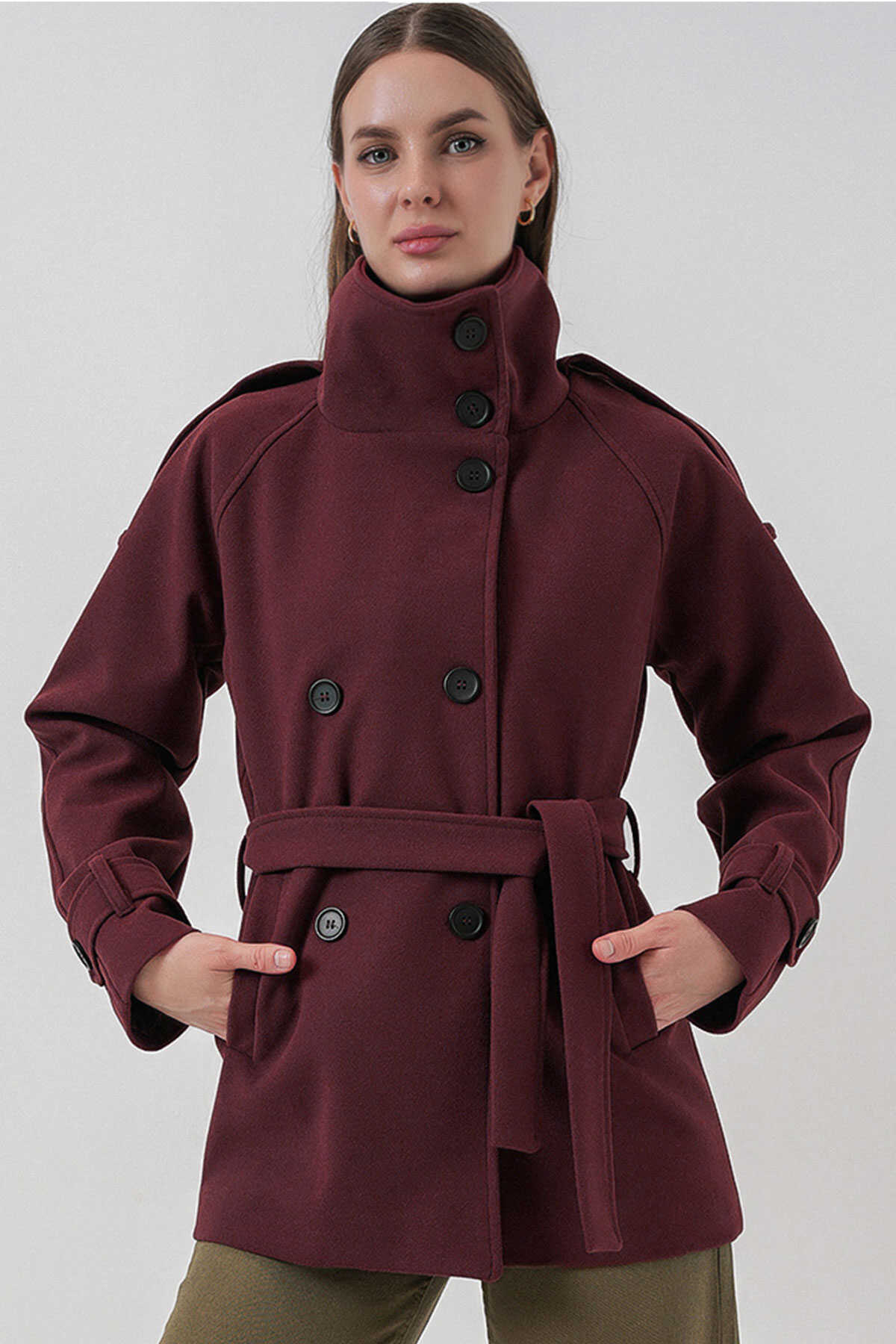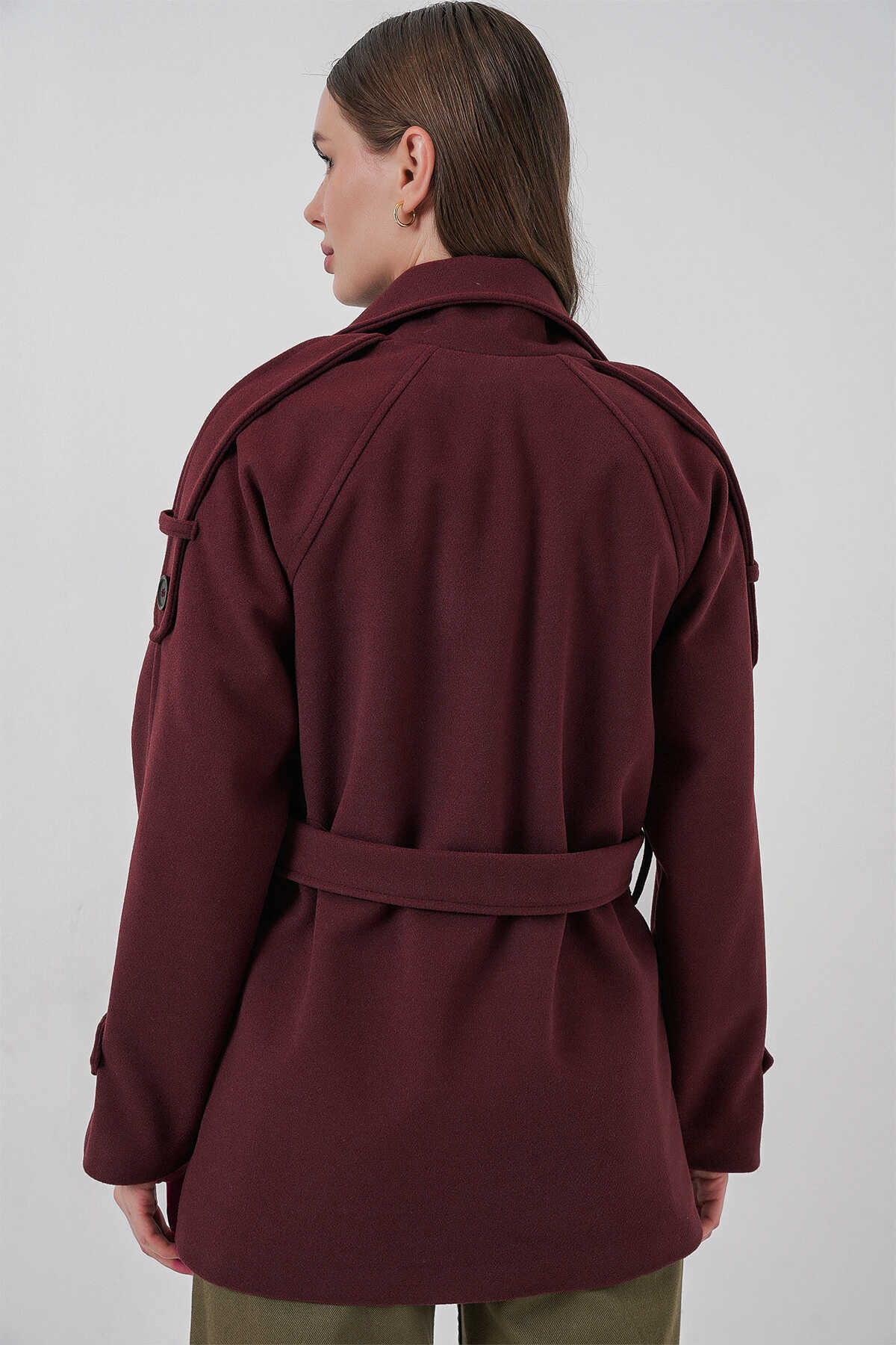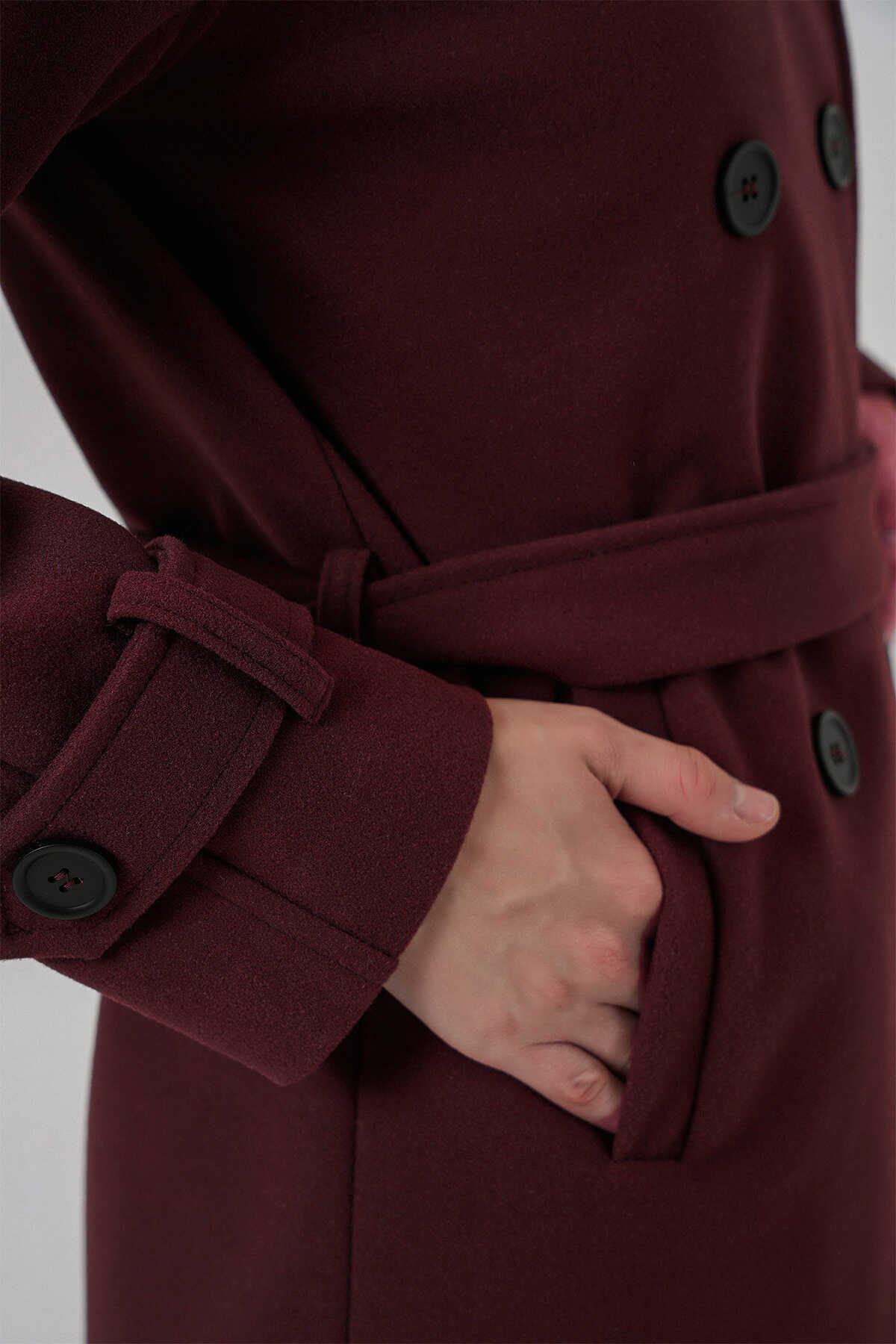 Kadın Kuşaklı Kaşe Kaban 9162 - Bordo - Kombin